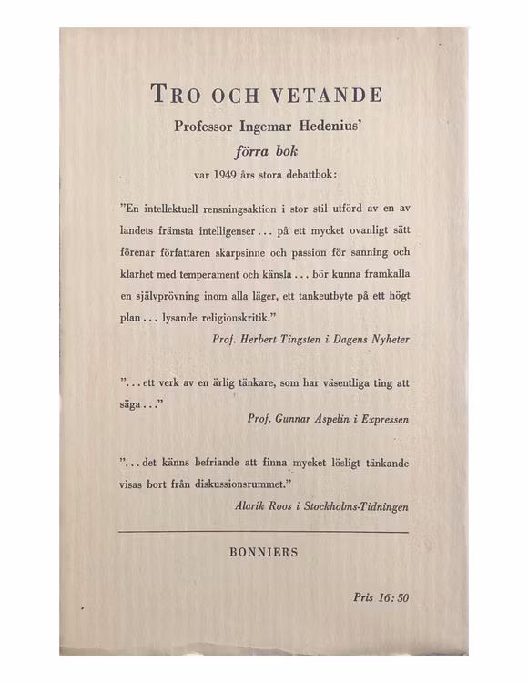 Innehåller avsnitten Att välja livsåskådning, Något om polemik, Svar till två biskopar, En brevväxling med missionär Svärd, De pryda fritänkarna, Ett tankeutbyte med biskop Aulén, Teater och verklighet eller biskop Malmeströms anfäktelser, "Intellektets tvångströja" m. m., Teologi och kvantmekanik, Två försök av docent Borgenstierna, Biskop Bohlins definitiva svar, Lundateologernas inlägg, Det katolska resonemanget, samt Det bibliska arvet.