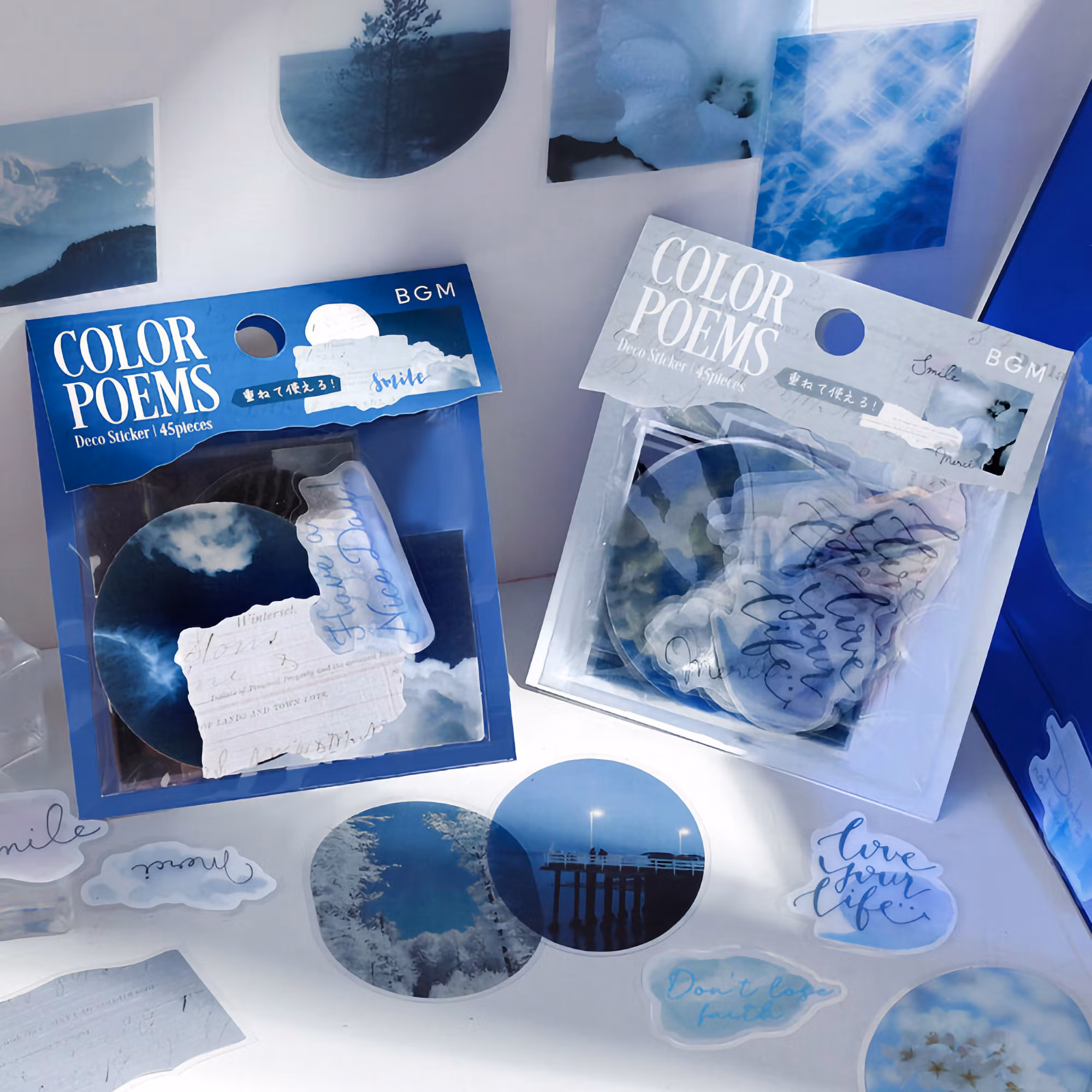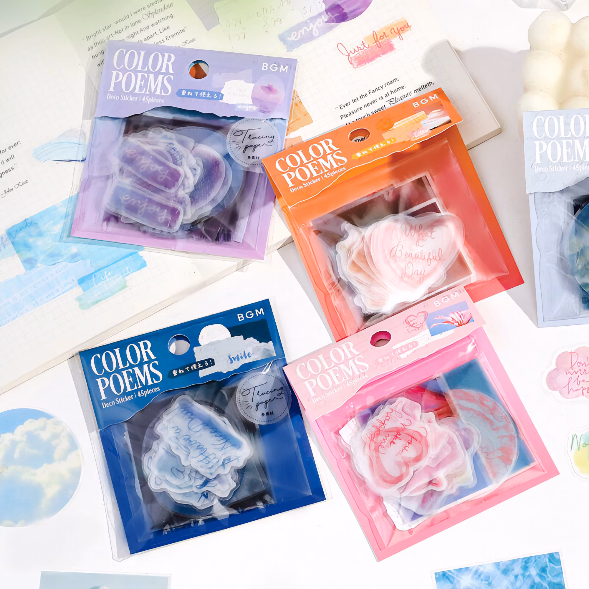 Color Poems är liksom namnet antyder en serie inspirerad av färger och ord. Det här paketet innehåller 45 klistermärken.