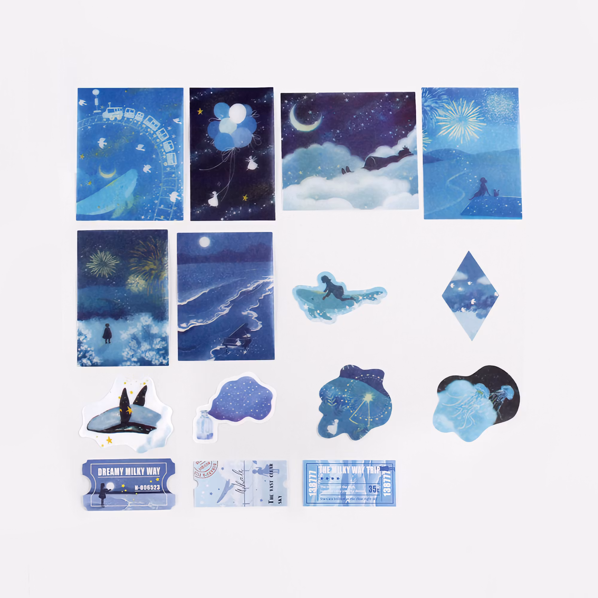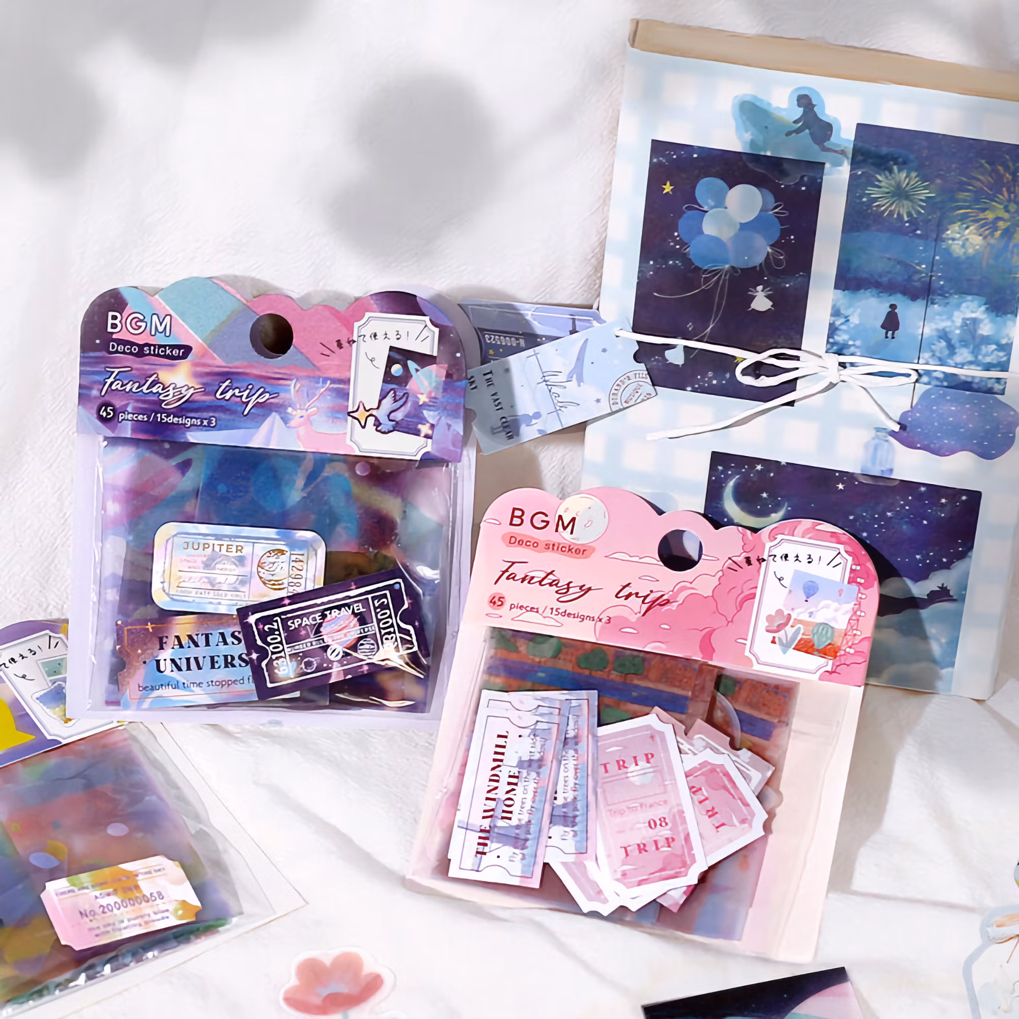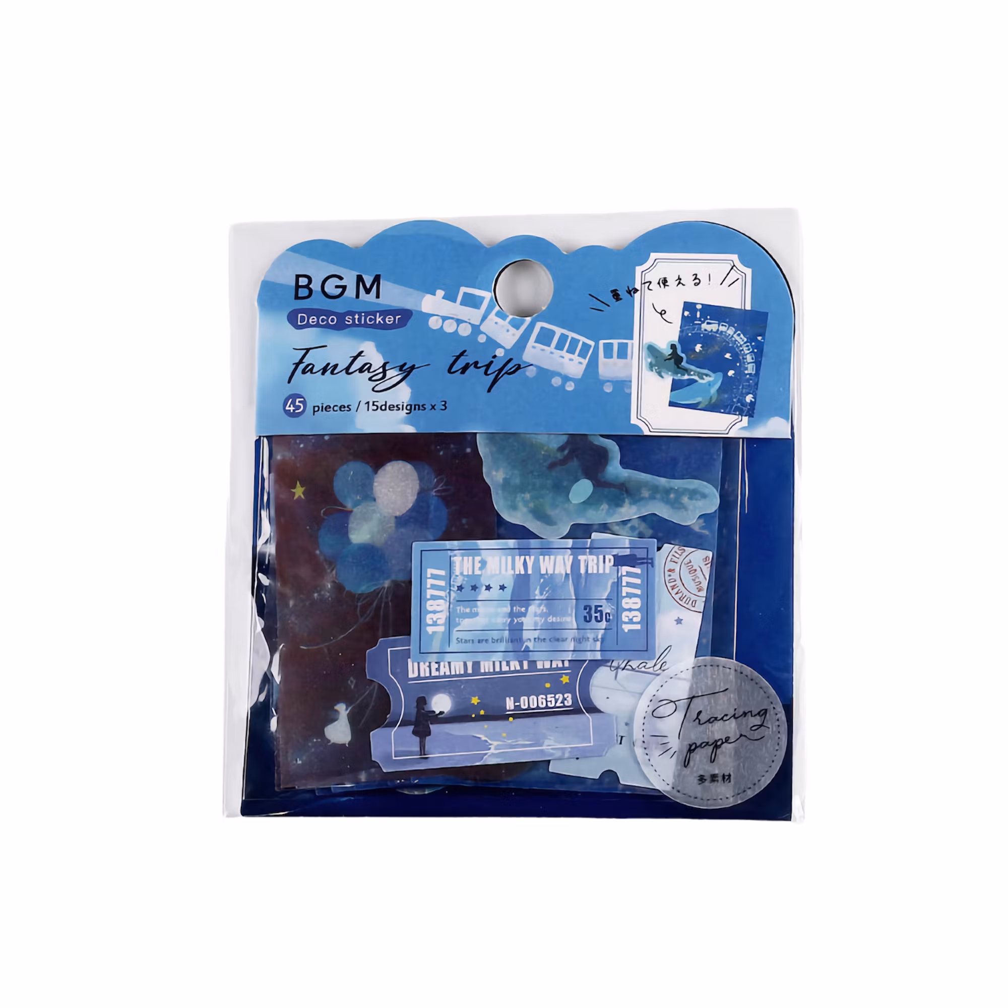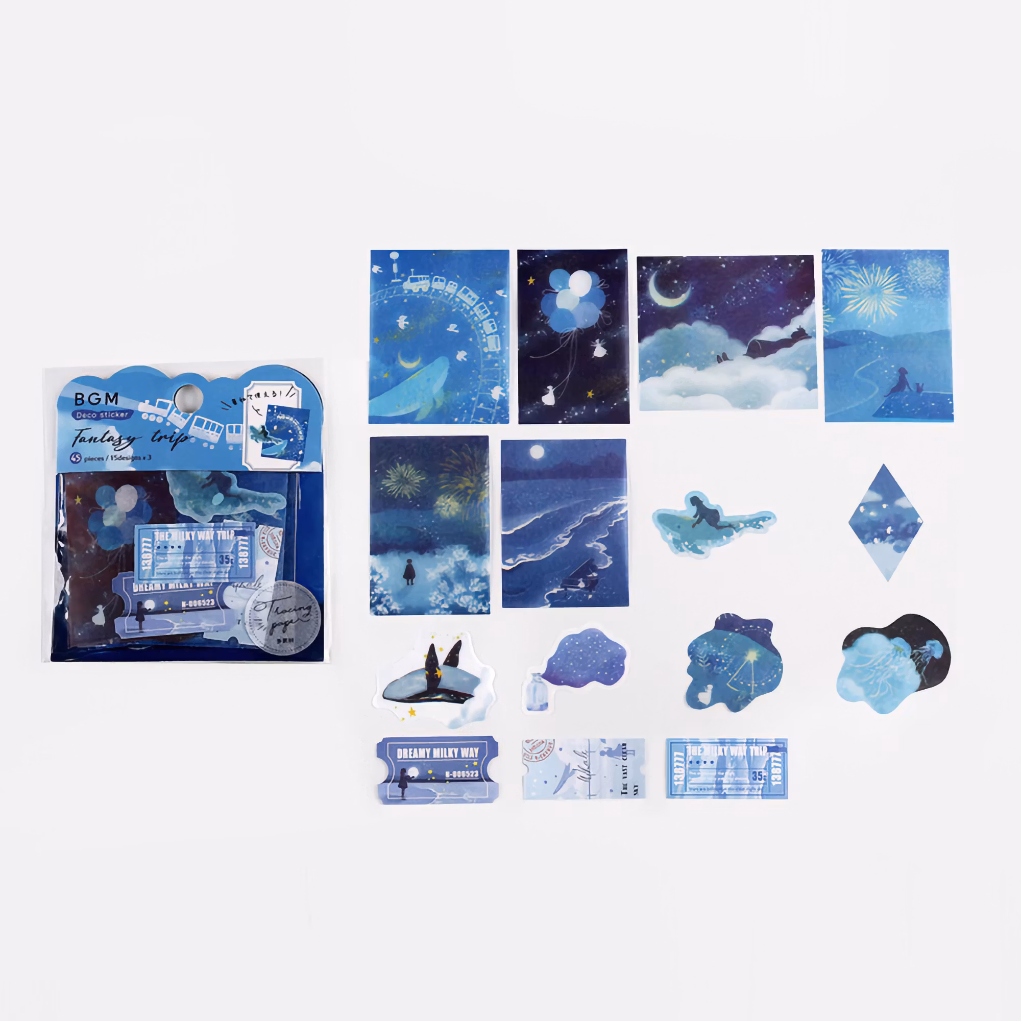 Fantasy Trip är liksom namnet antyder en serie inspirerad av fantasieggande resor. Det här paketet innehåller 45 klistermärken med ett drömskt motiv som går i blått.