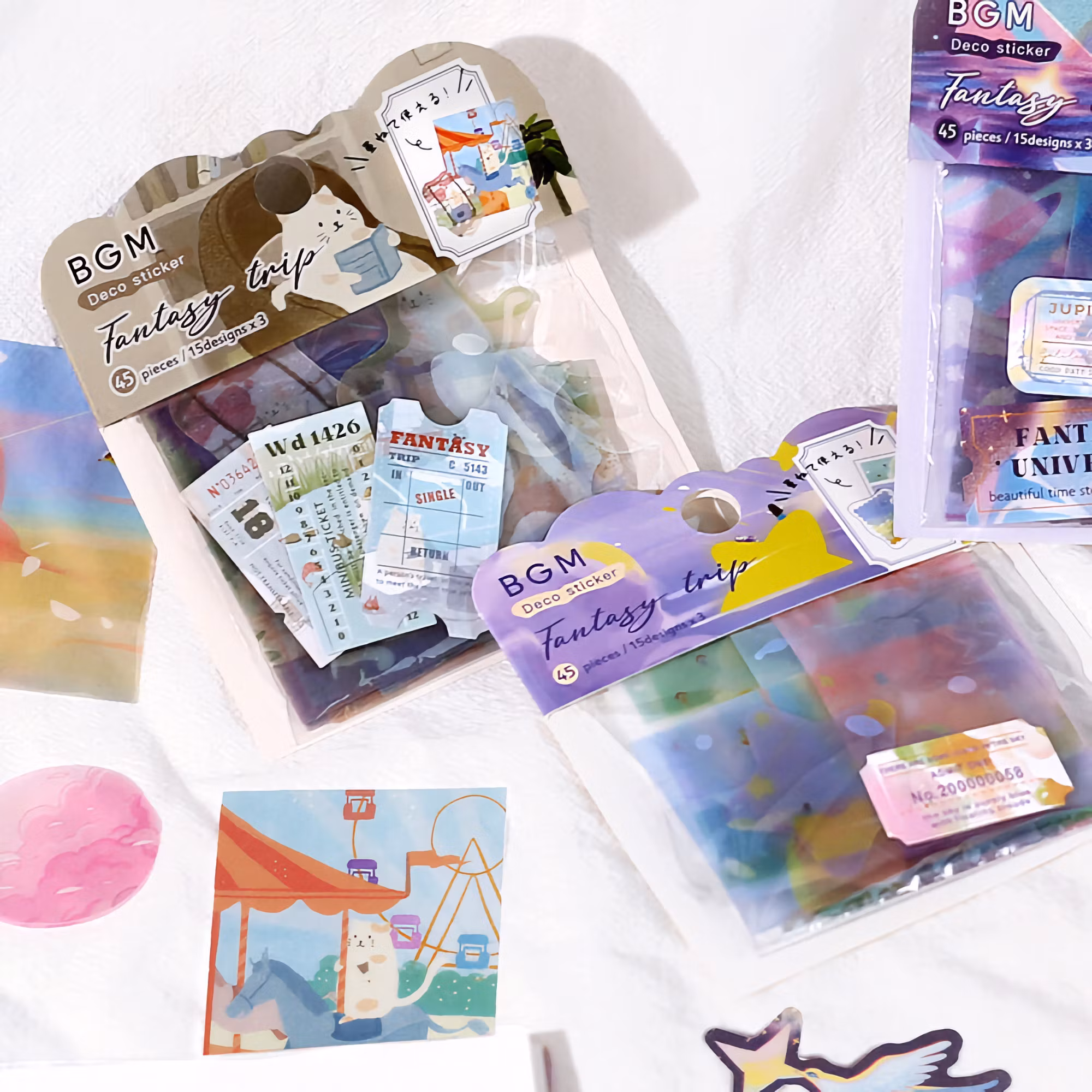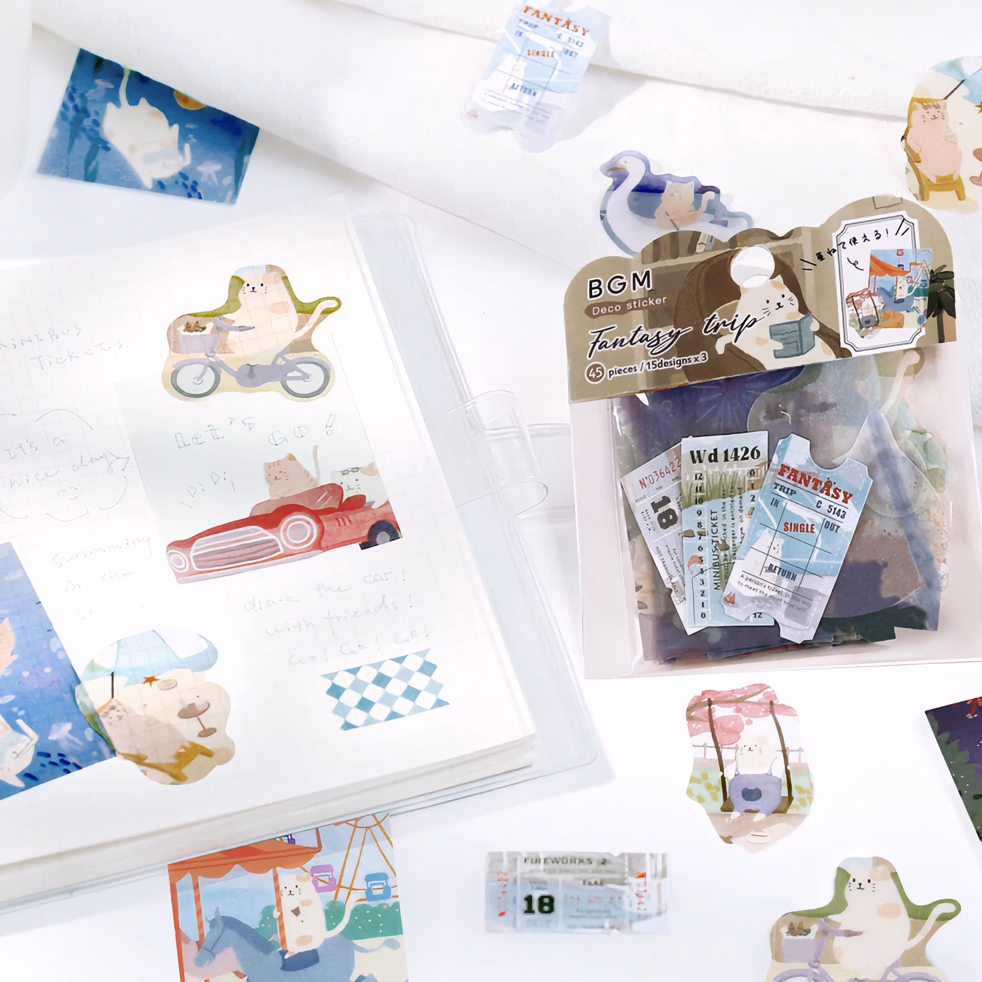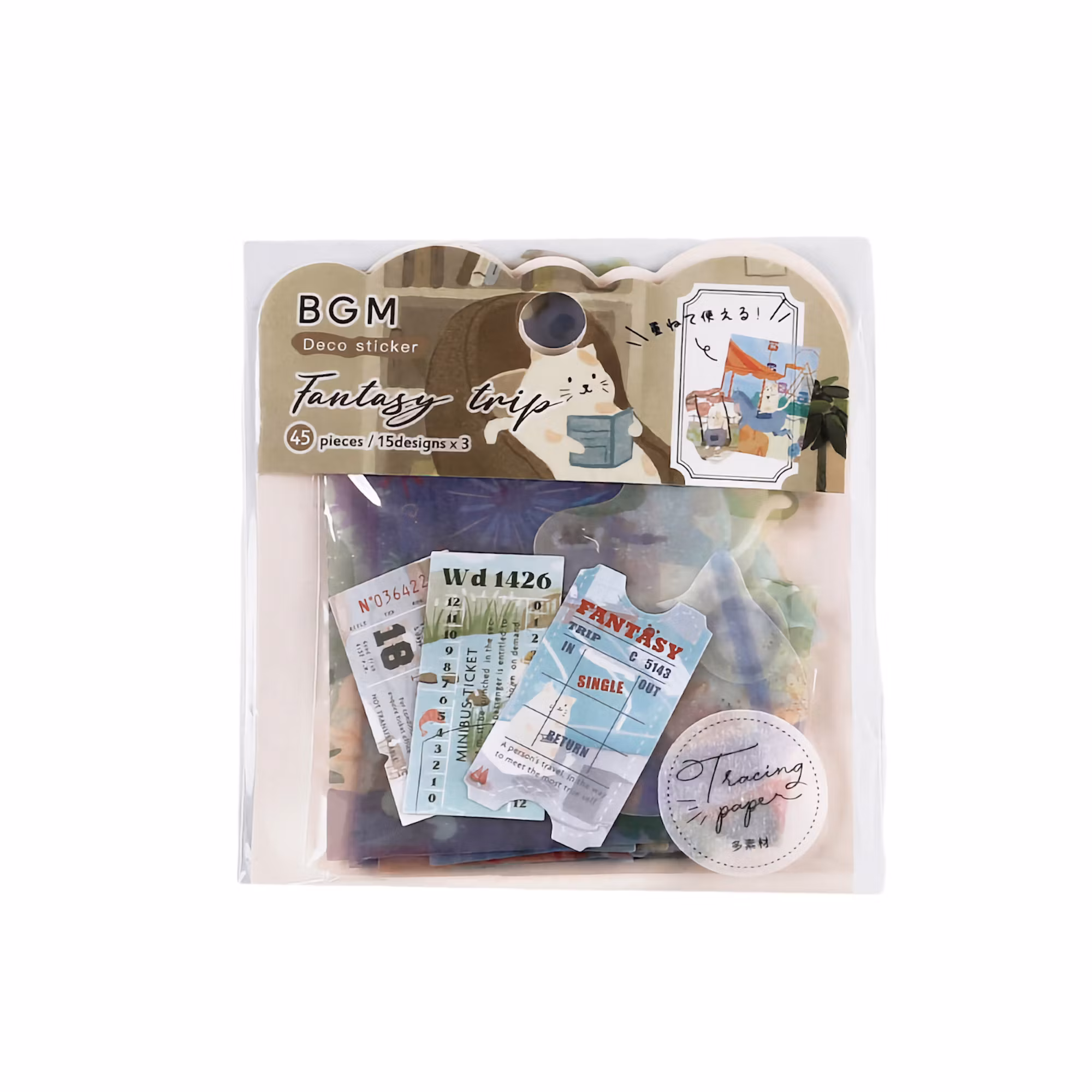 Fantasy Trip är liksom namnet antyder en serie inspirerad av fantasieggande resor. Det här paketet innehåller 45 klistermärken med ett drömskt kattmotiv.