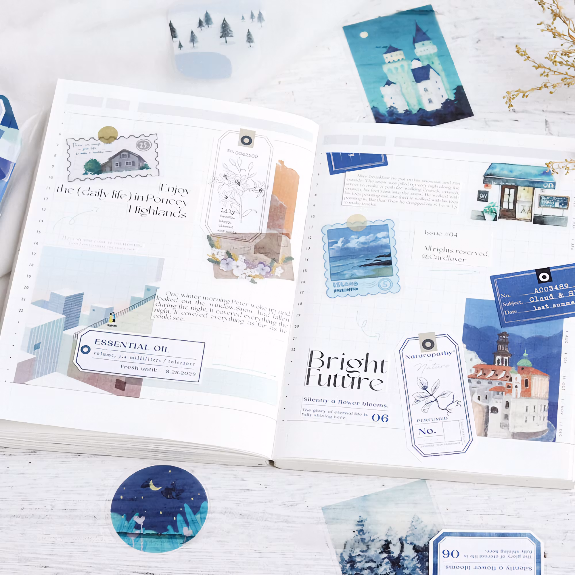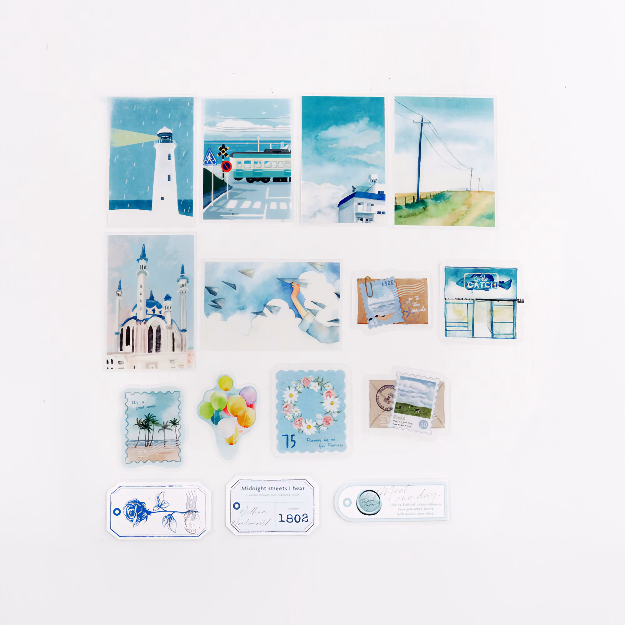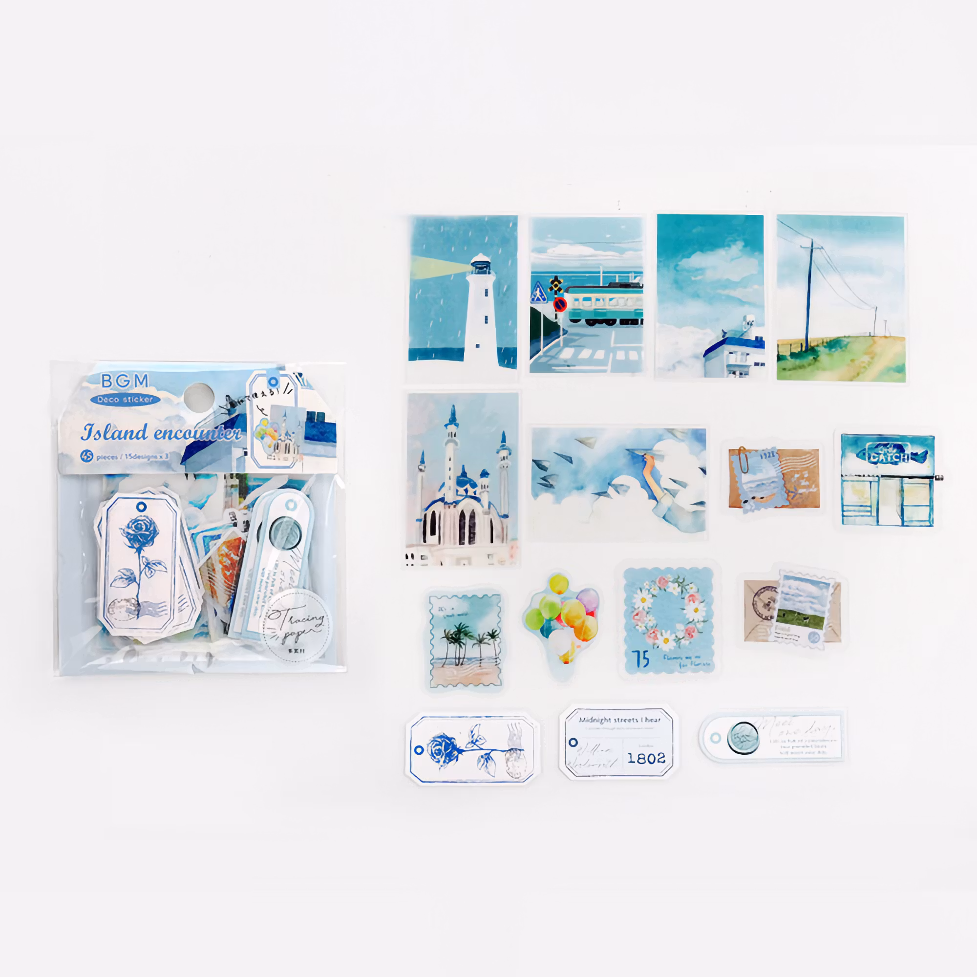 Island Encounter är en serie med pastorala landsortsmotiv. Det här paketet innehåller 45 klistermärken som går i blått.