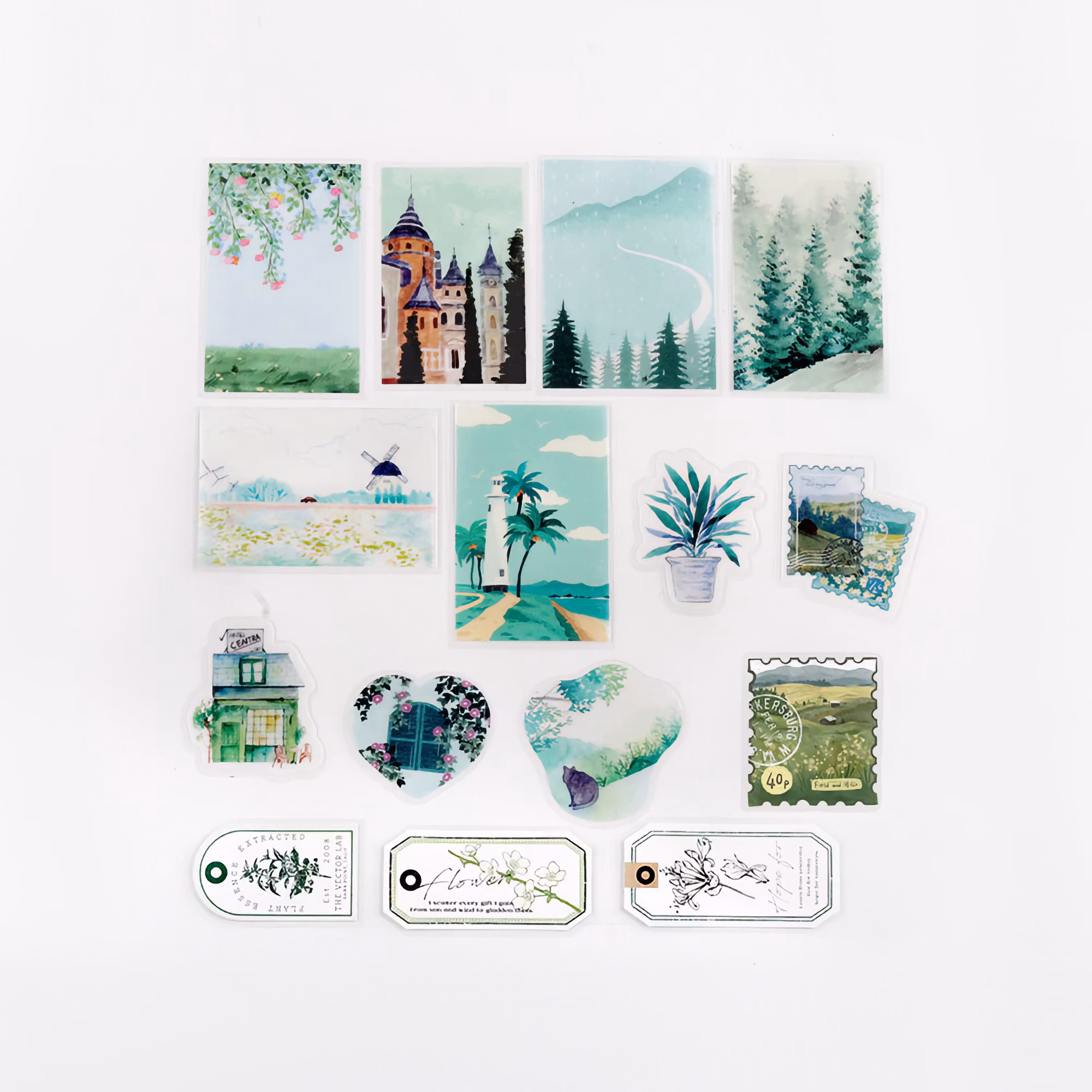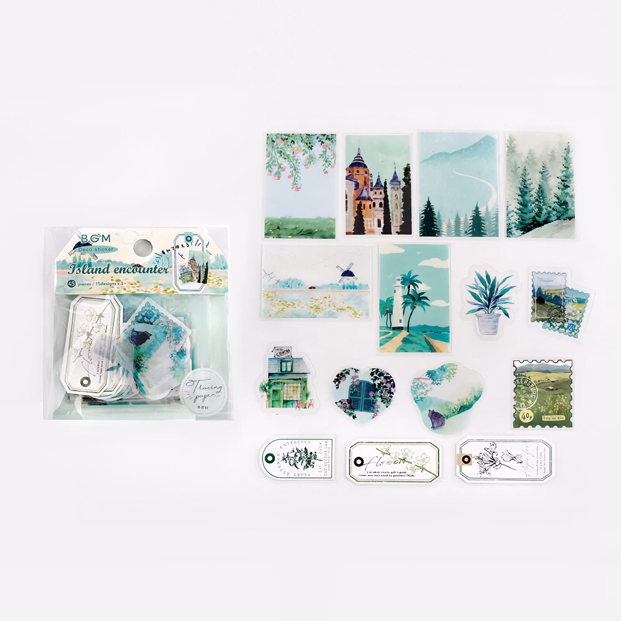 Island Encounter är en serie med pastorala landsortsmotiv. Det här paketet innehåller 45 klistermärken som går i grönt.
