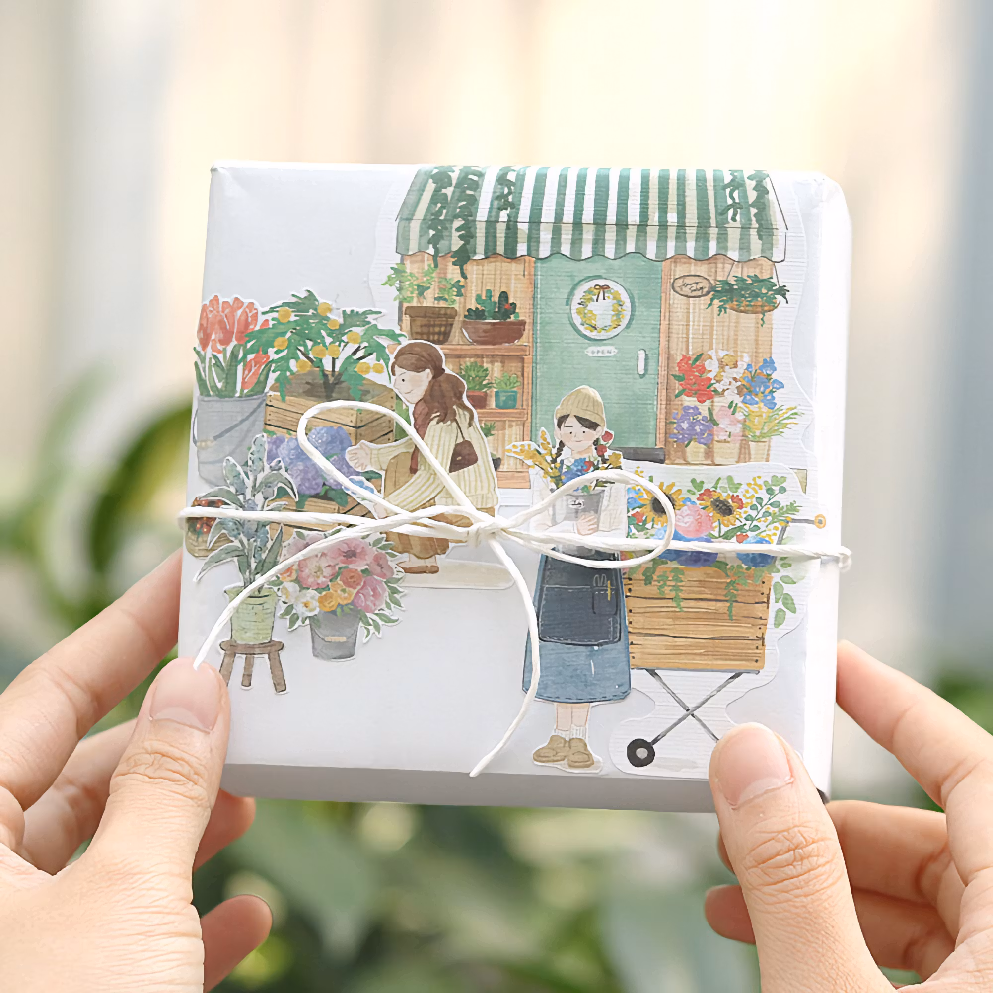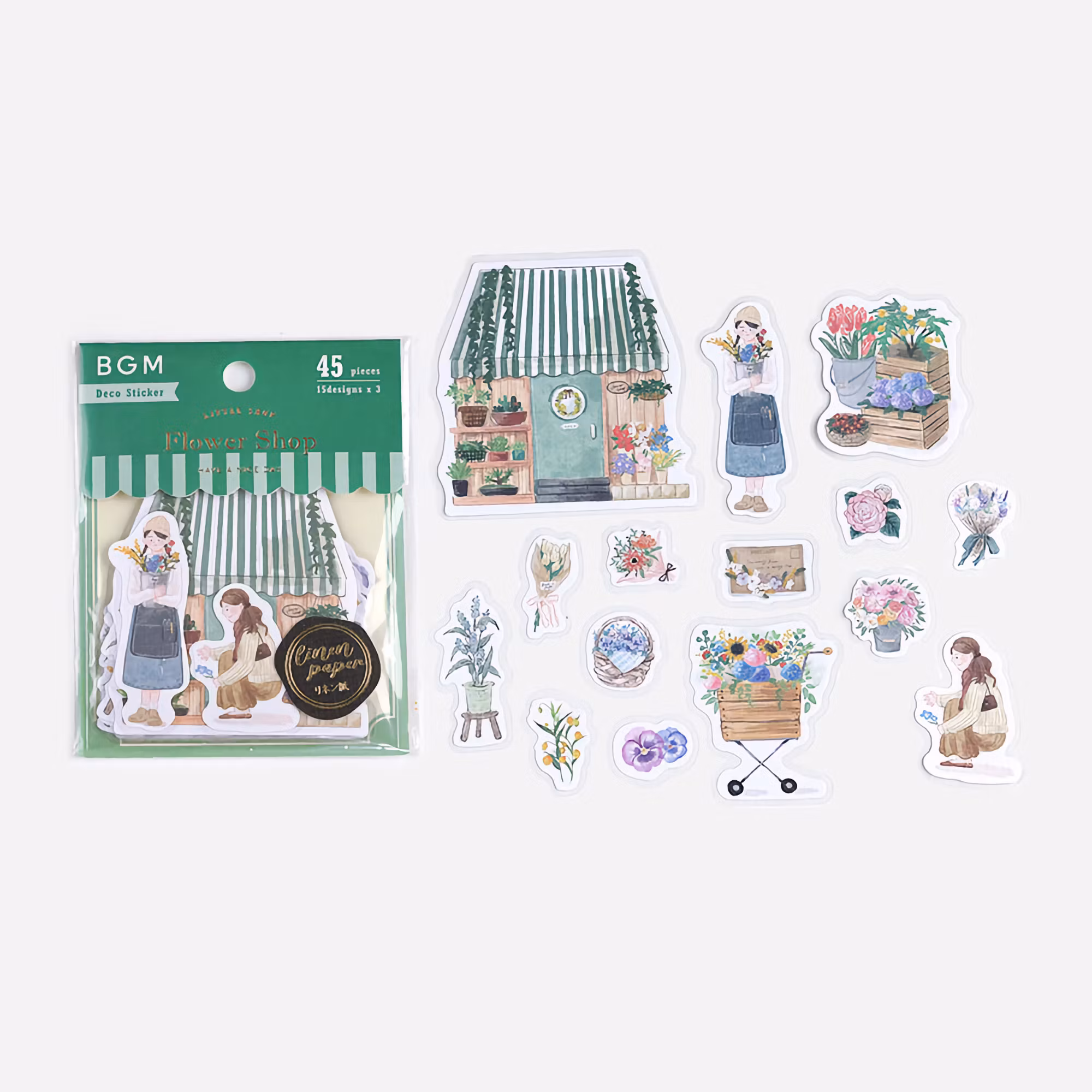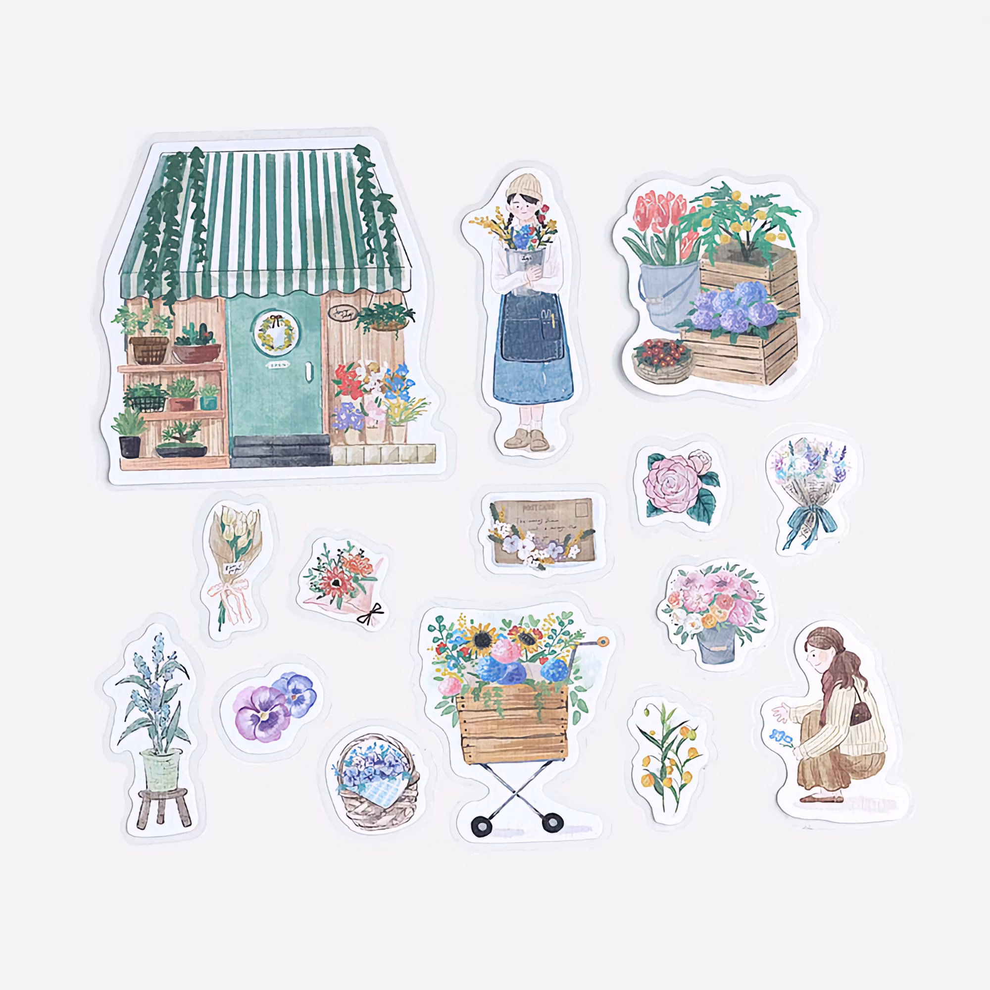 Little Shop är liksom namnet antyder en serie inspirerad av mysiga små butiker och kaféer. Det här paketet innehåller 45 klistermärken med blomsterhandelmotiv.
