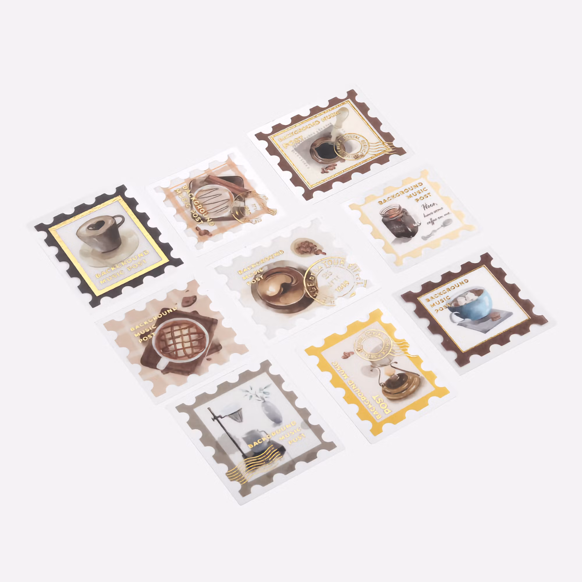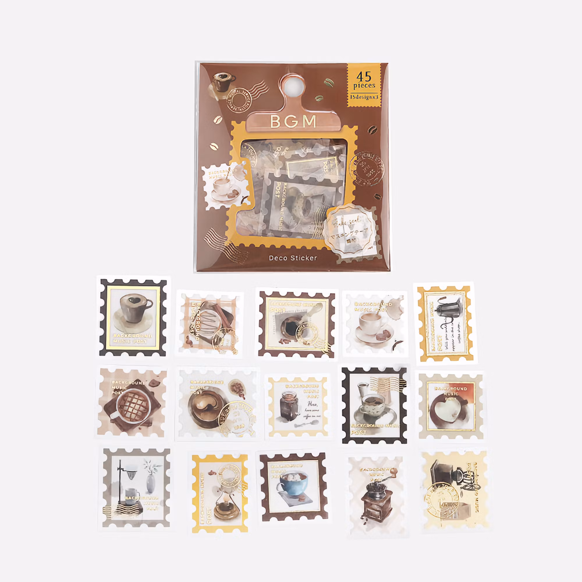 Det här paketet innehåller 45 frimärkesinspirerade klistermärken med kaffemotiv.