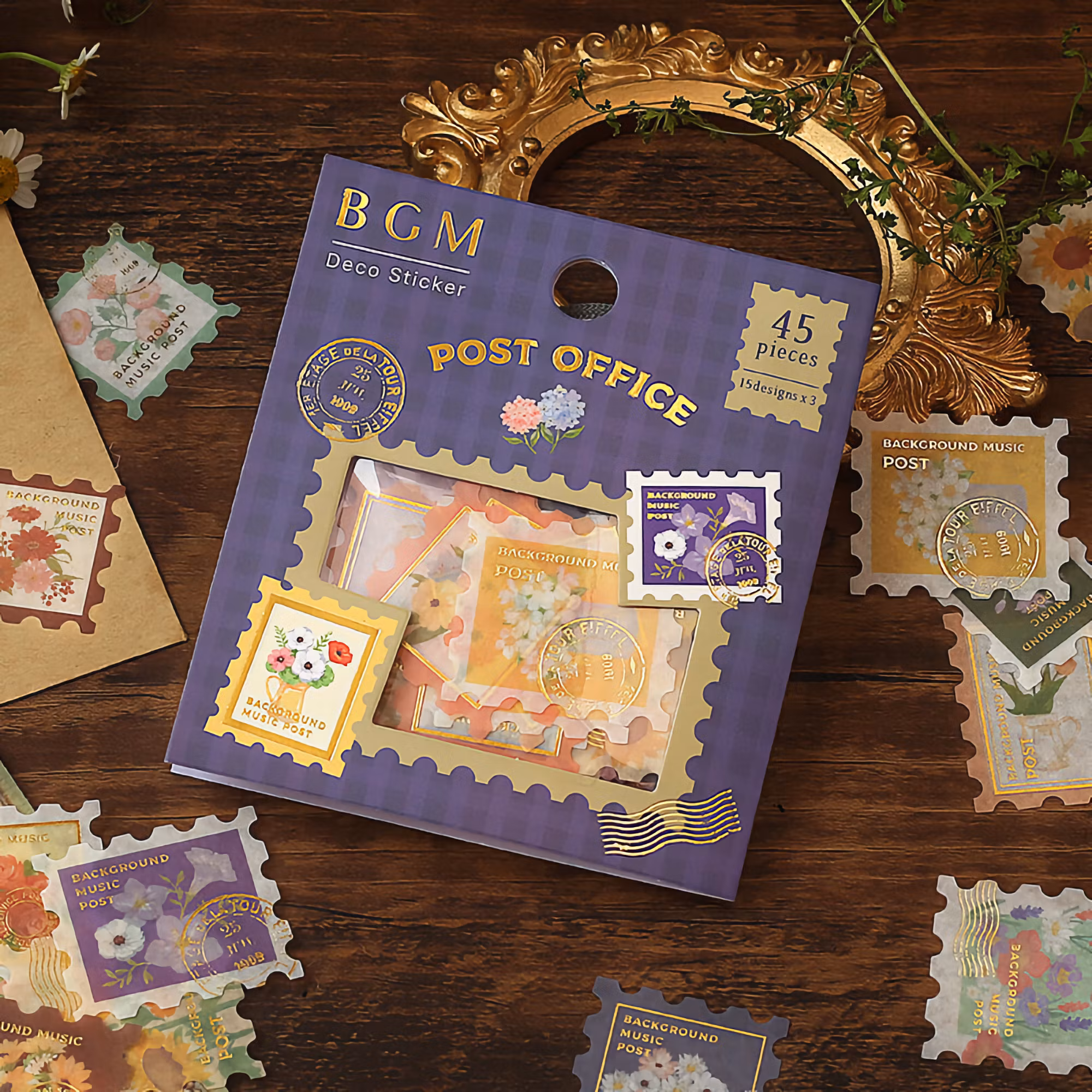 Det här paketet innehåller 45 frimärkesinspirerade klistermärken med blomstermotiv.