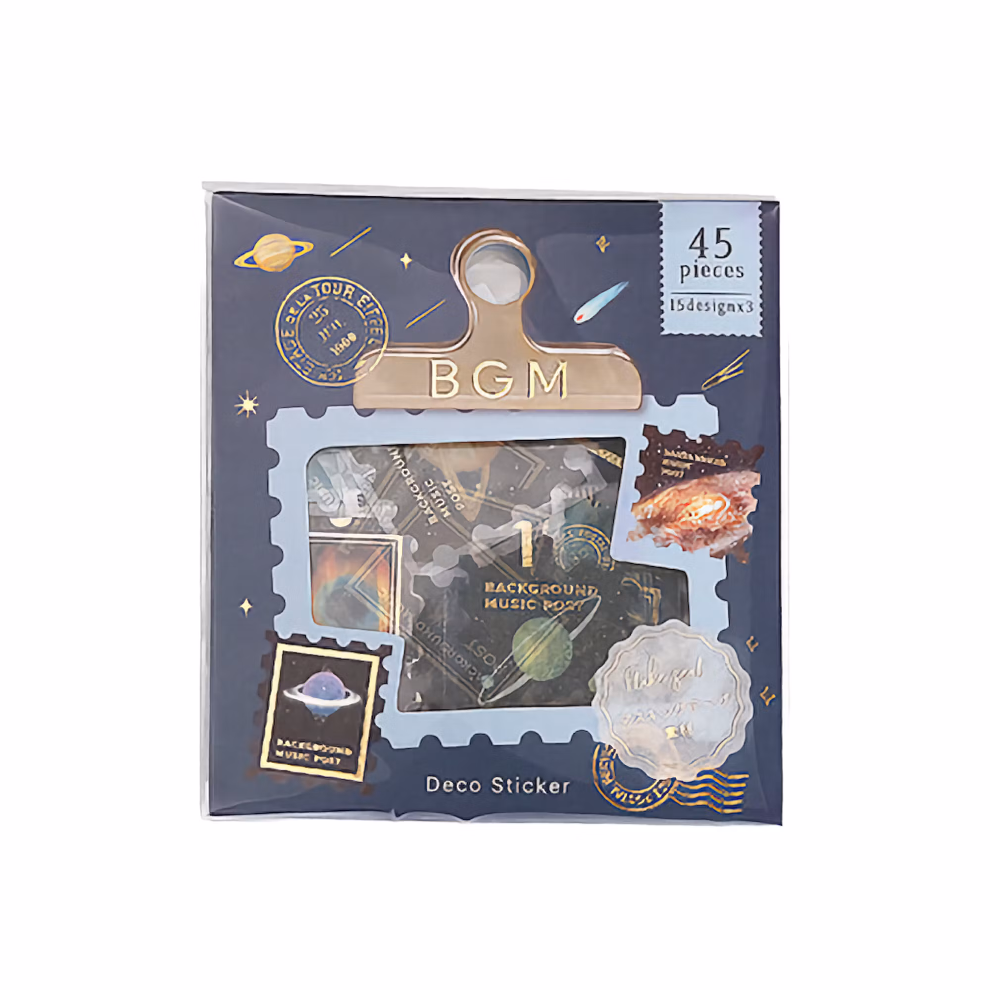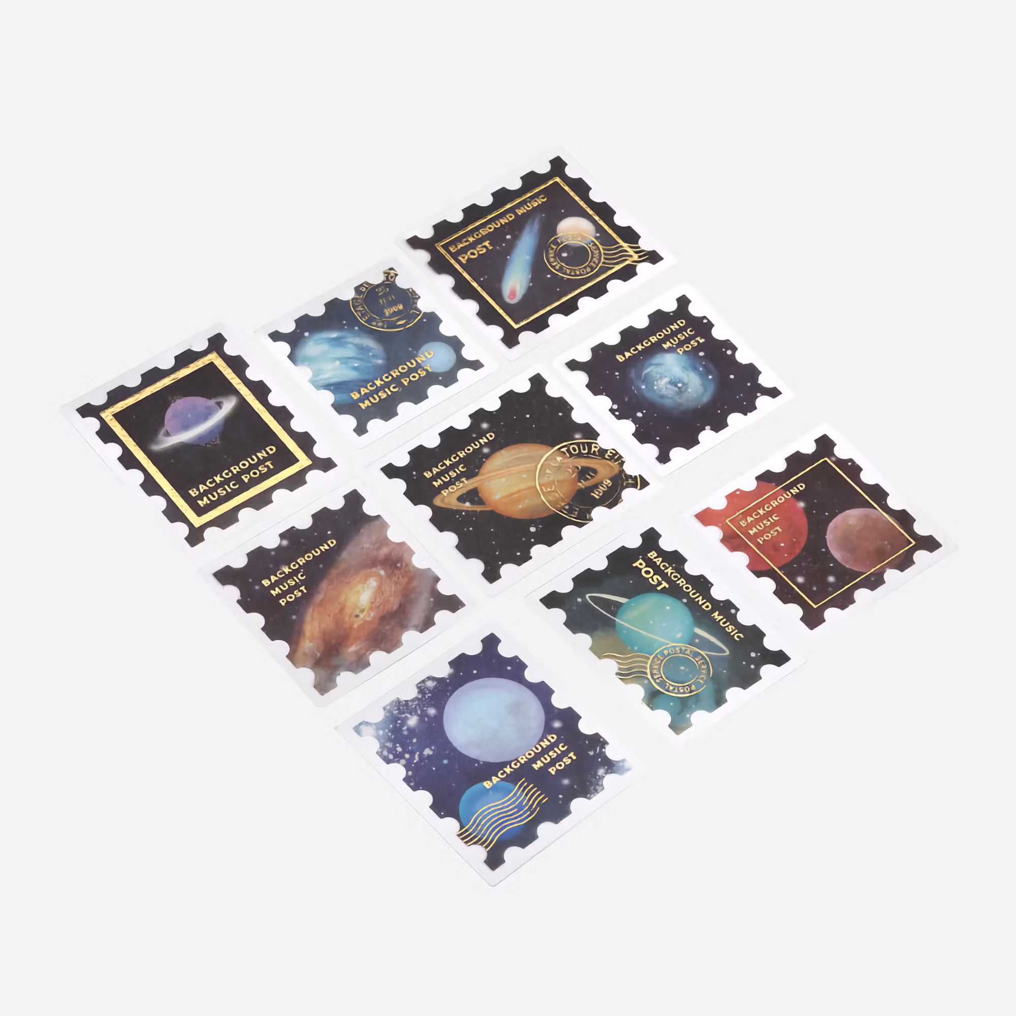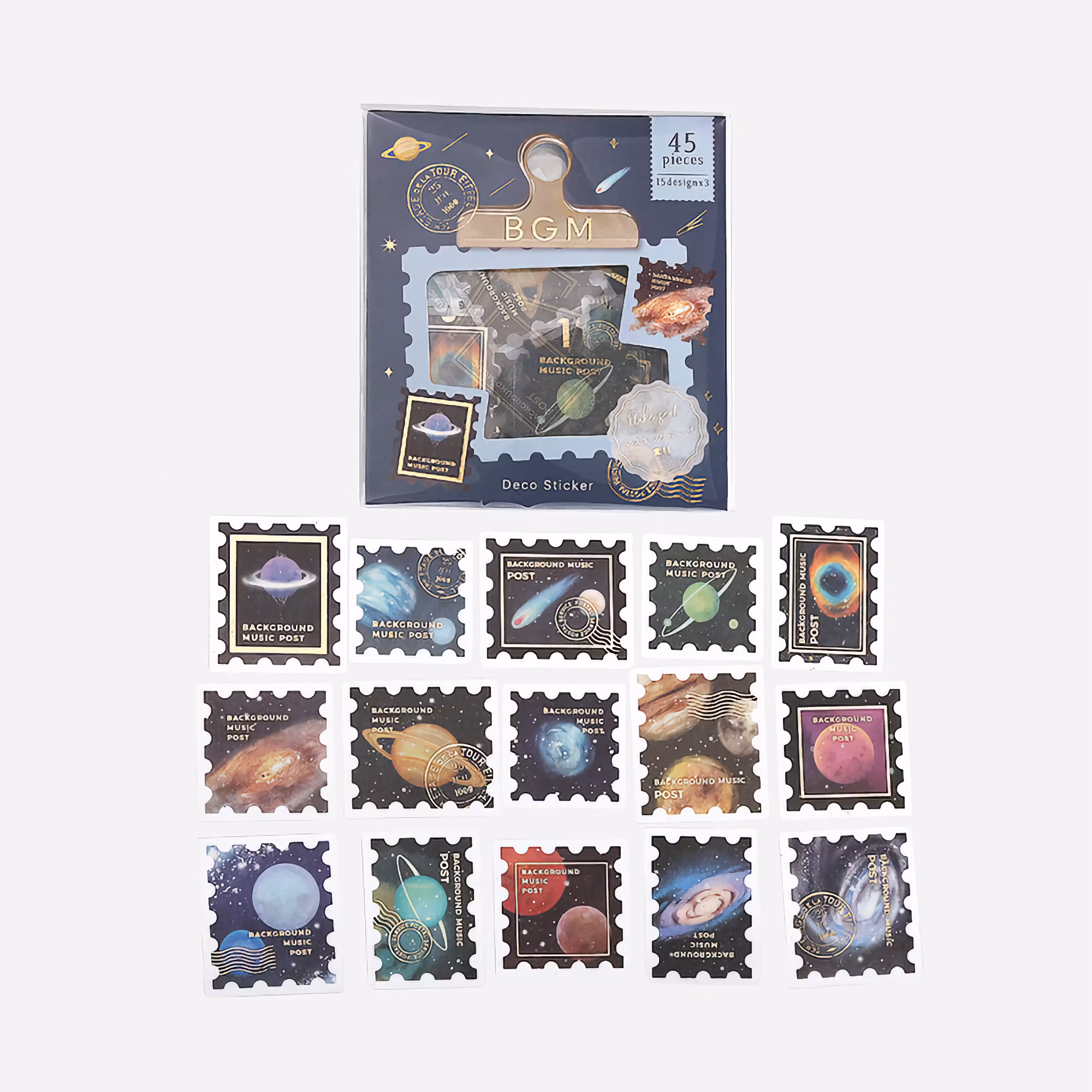 Det här paketet innehåller 45 frimärkesinspirerade klistermärken med rymdmotiv.