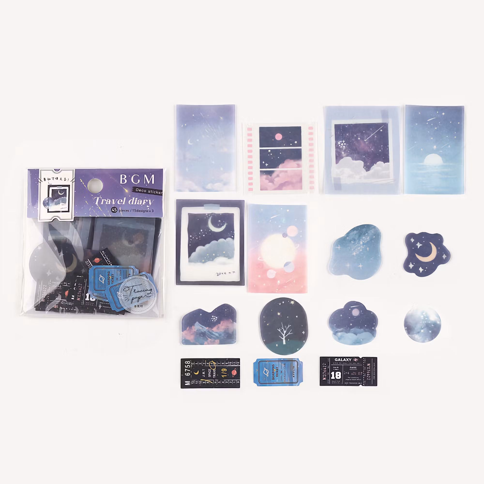 Travel Diary är liksom namnet antyder en serie inspirerad av resor. Det här paketet innehåller 45 klistermärken med ett drömskt himmelsmotiv.