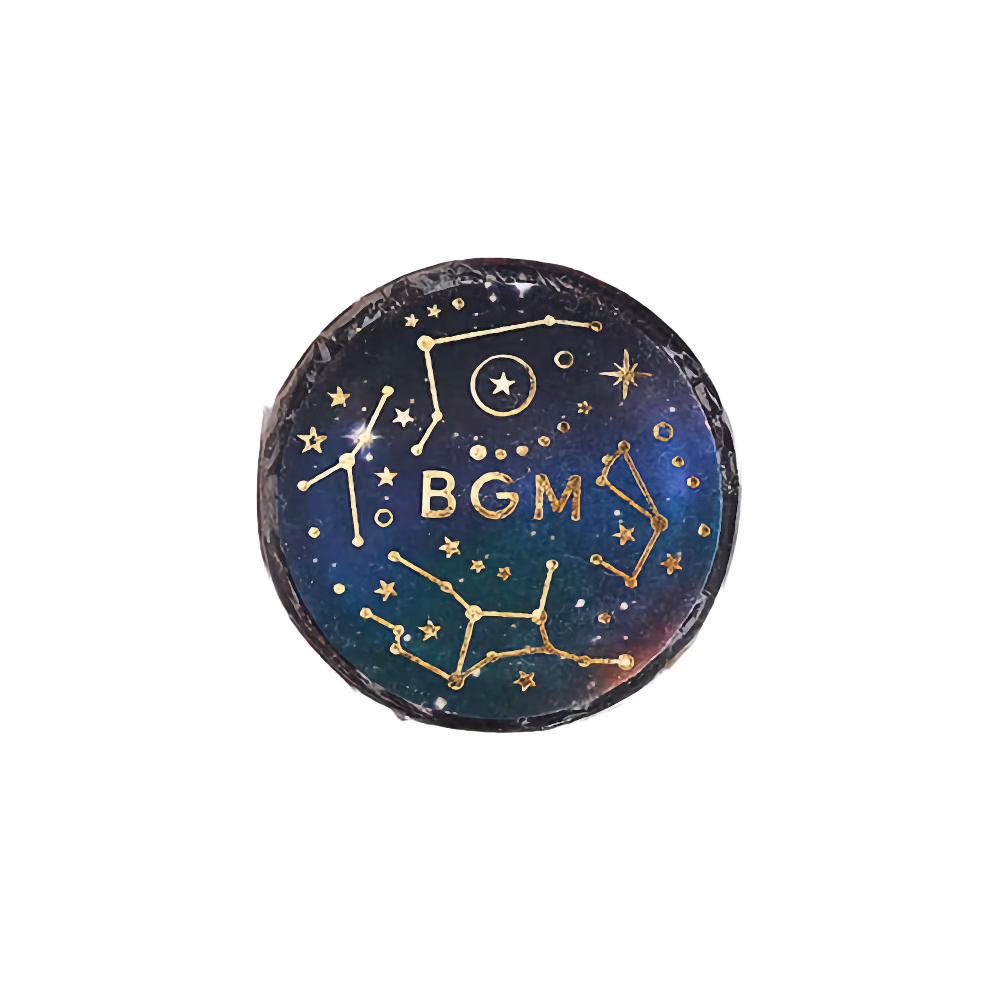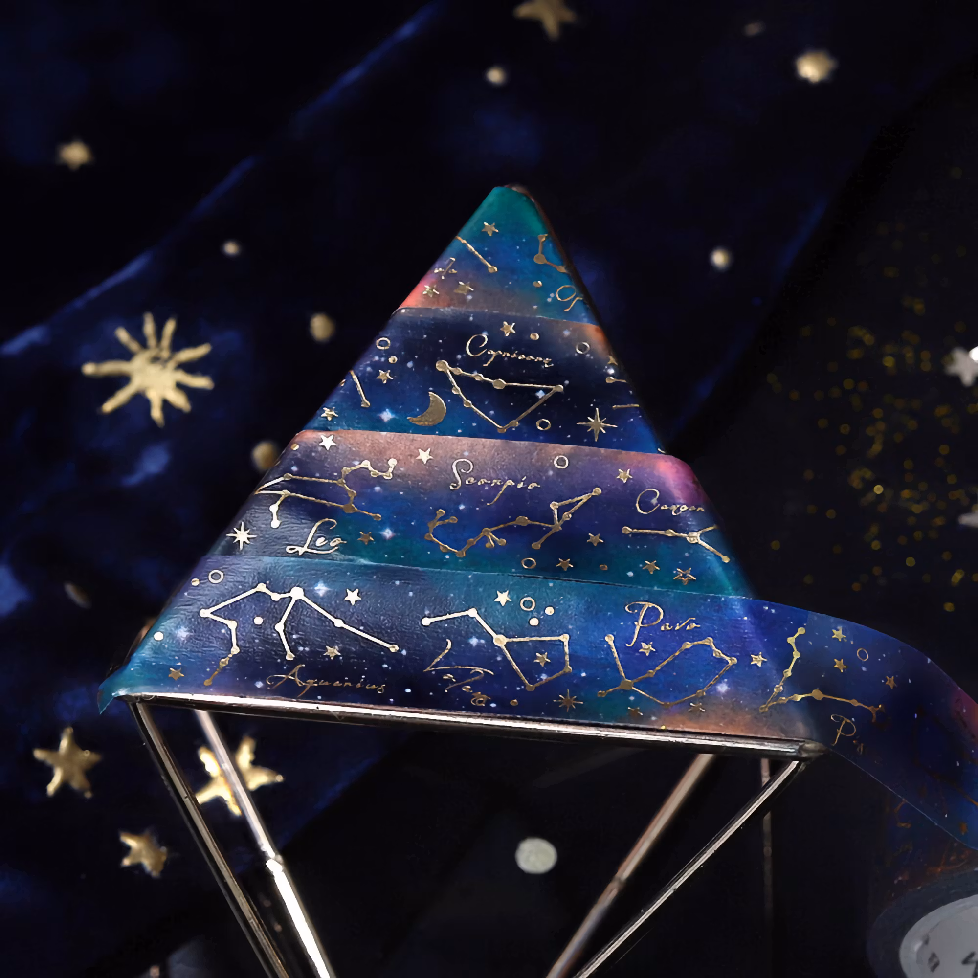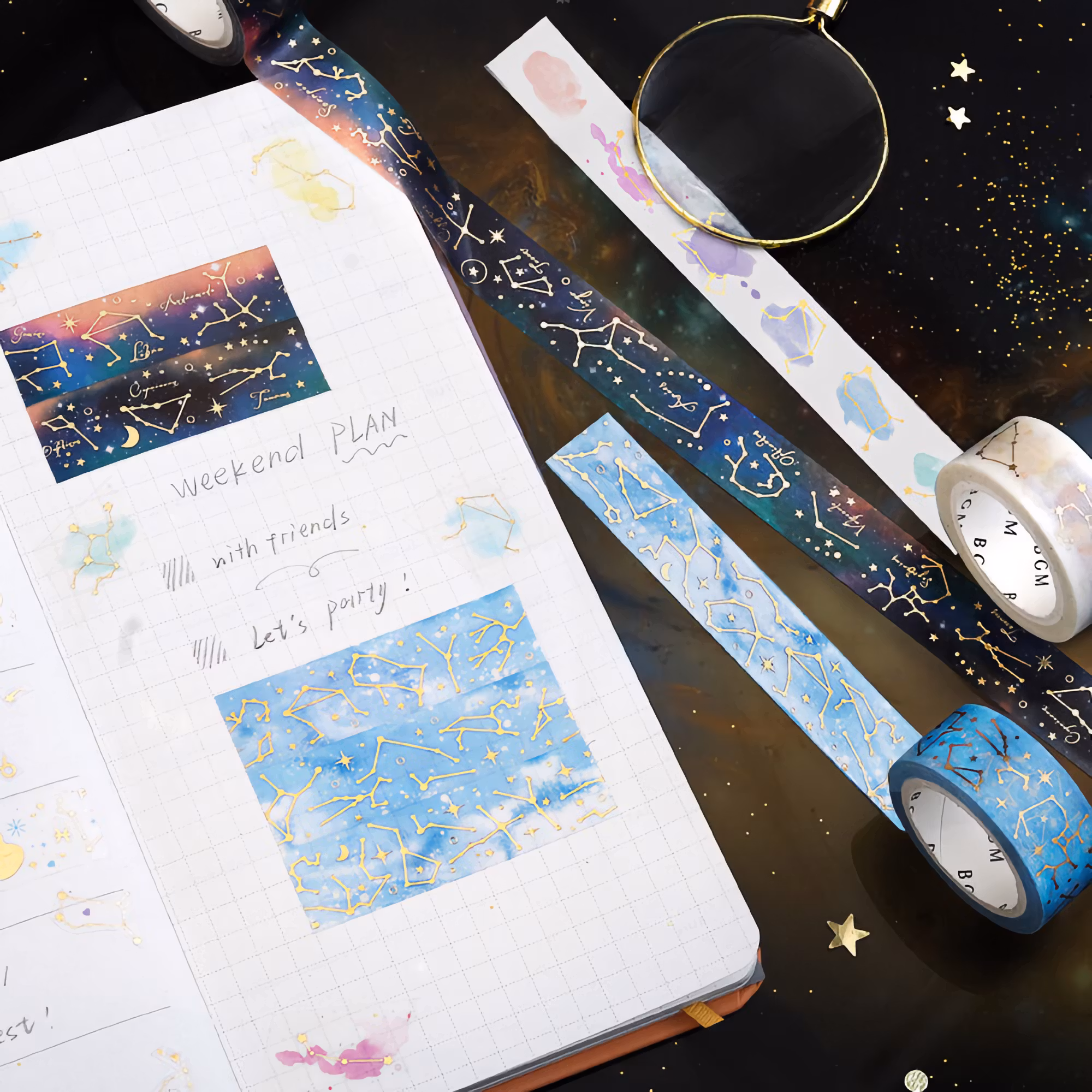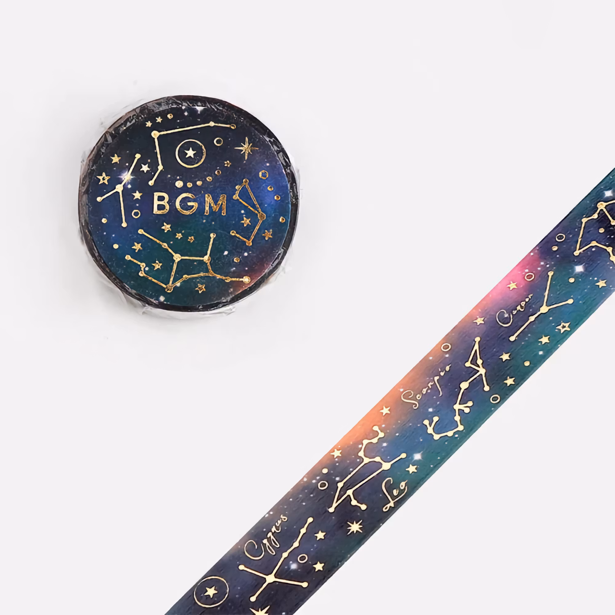 Washitejp med stjärnbildsmotiv från japanska BGM. Den här rullen föreställer natthimlen. Tejpen har ett folieutförande, vilket gör att motivet glänser extra mycket.