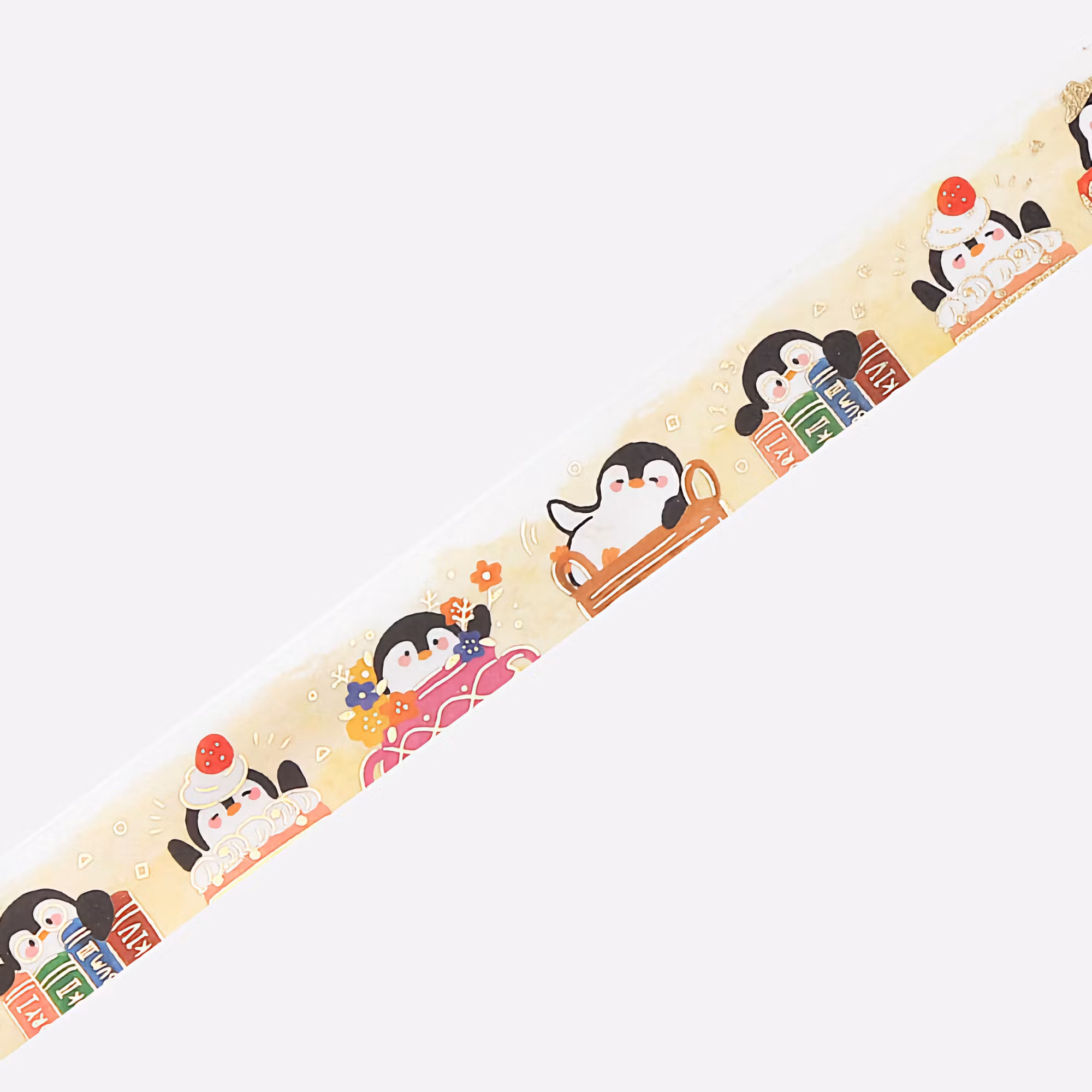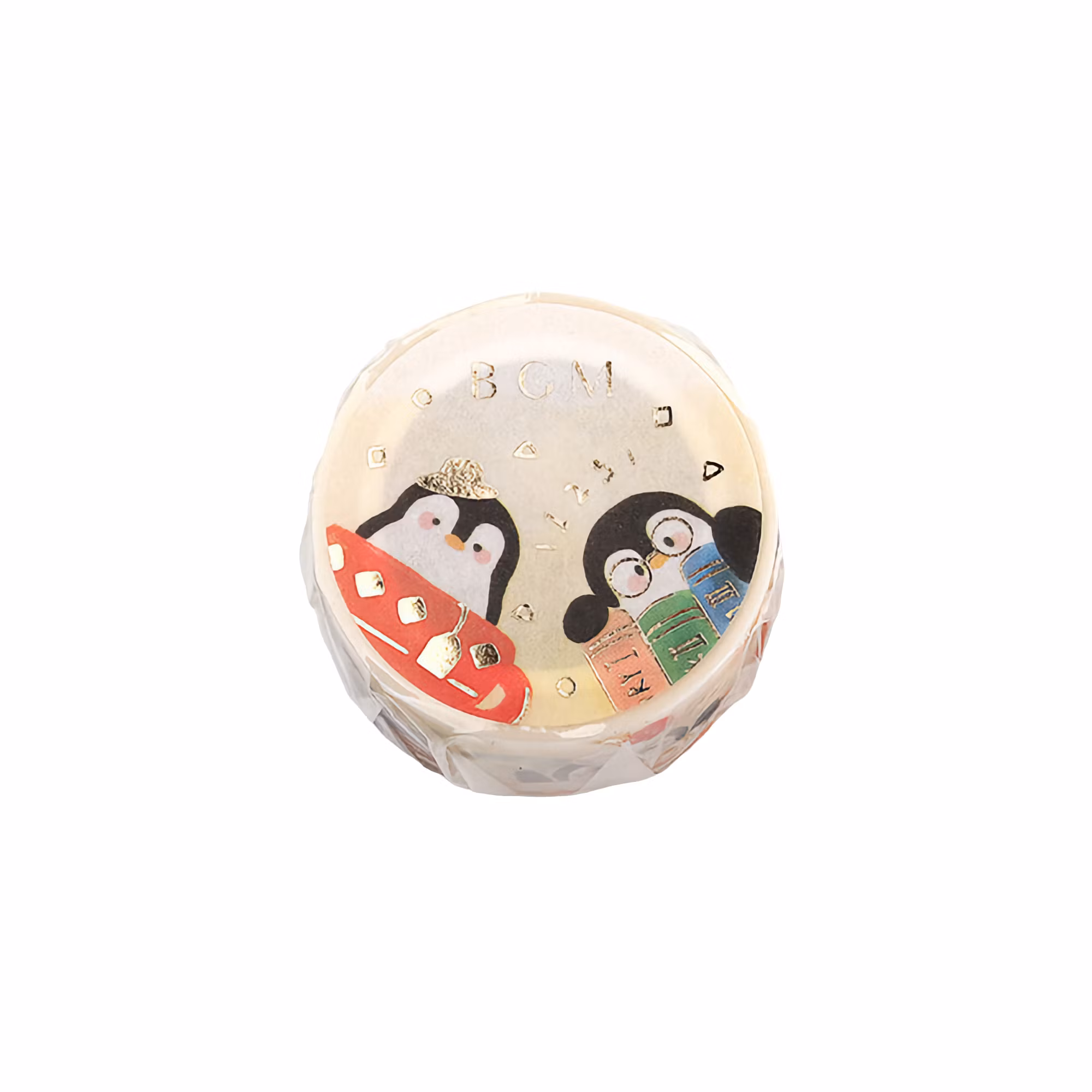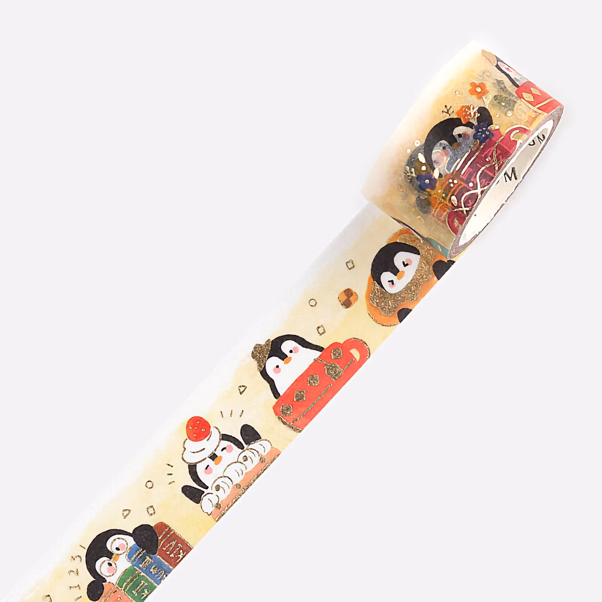 Washitejp med lekfullt pingvinmotiv från japanska BGM. Tejpen har ett guldfolieutförande, vilket gör att motivet glänser extra mycket.