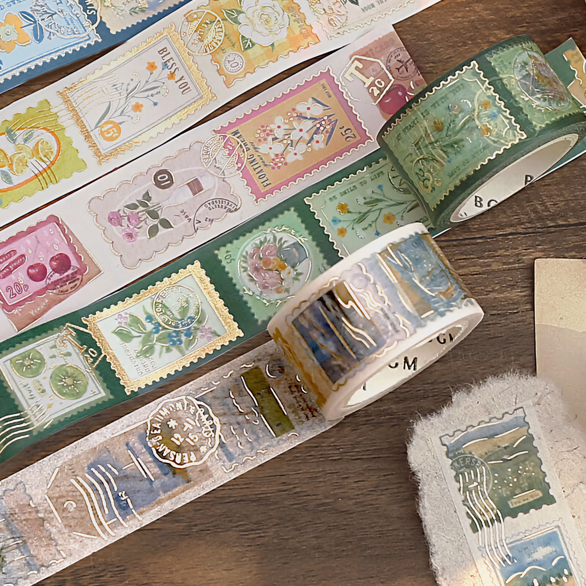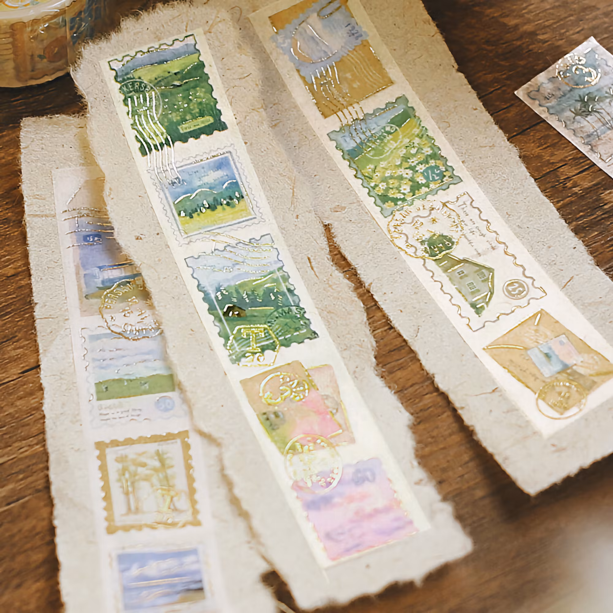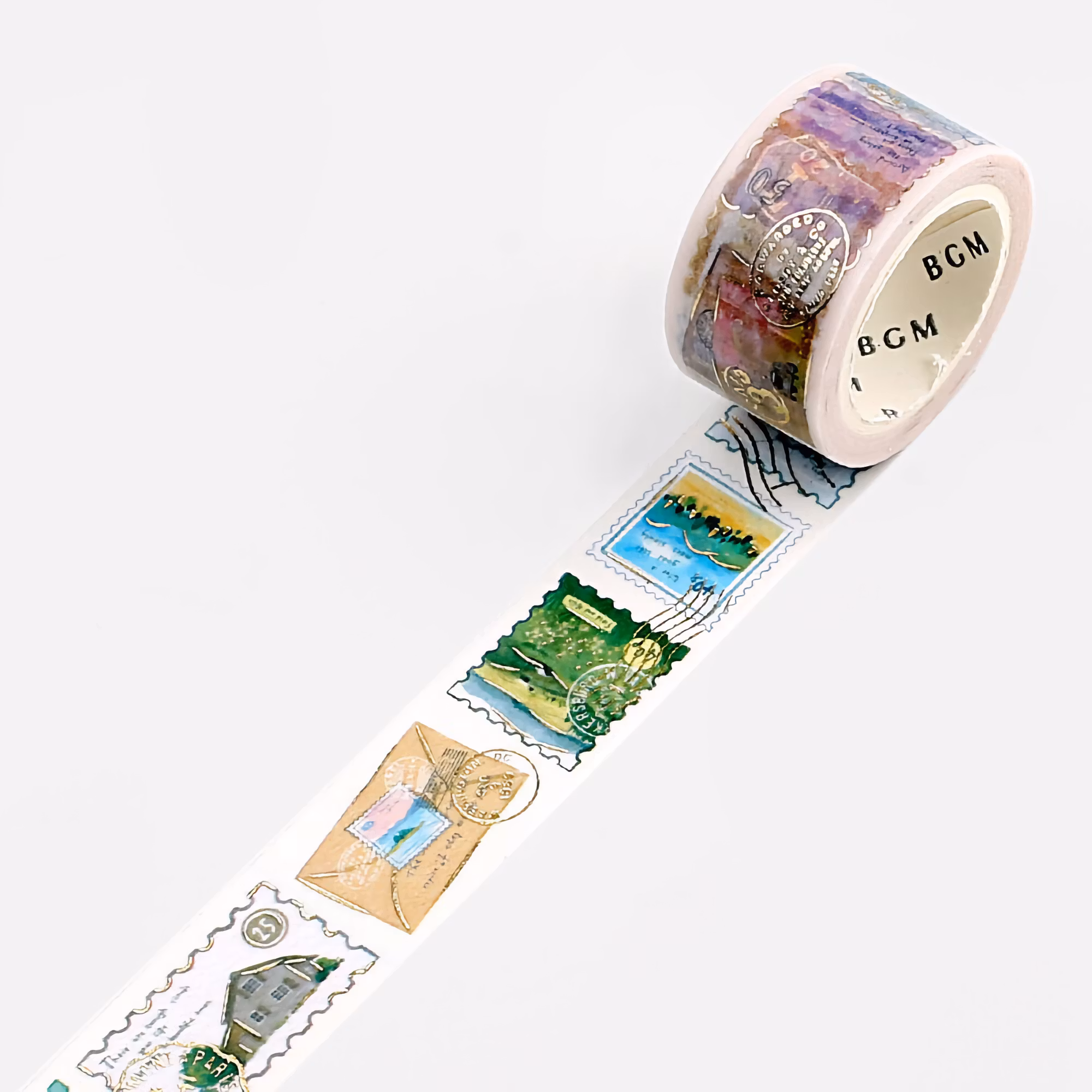 Washitejp med frimärkesinspirerat motiv från japanska BGM. Tejpen har ett guldfolieutförande, vilket gör att motivet glänser extra mycket.