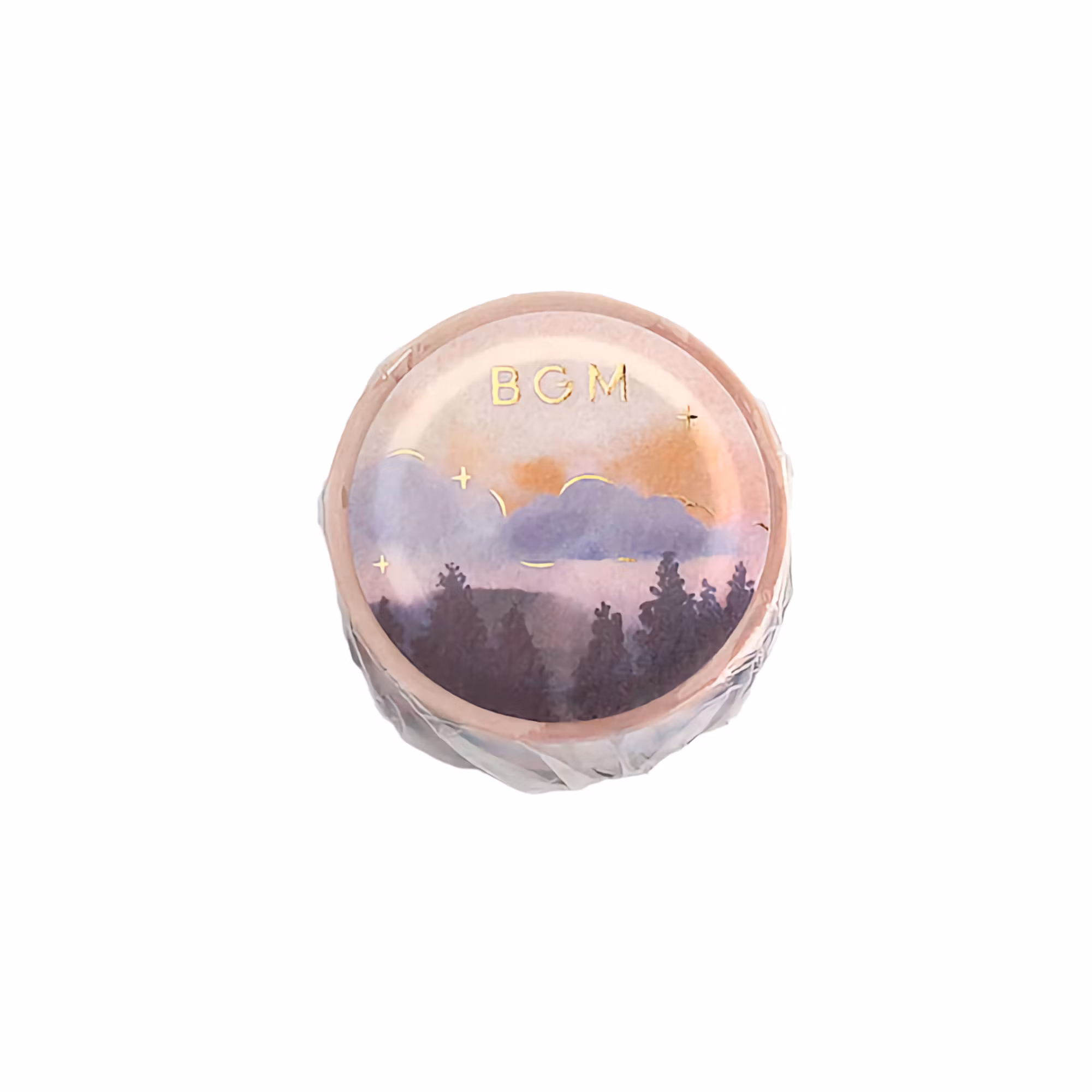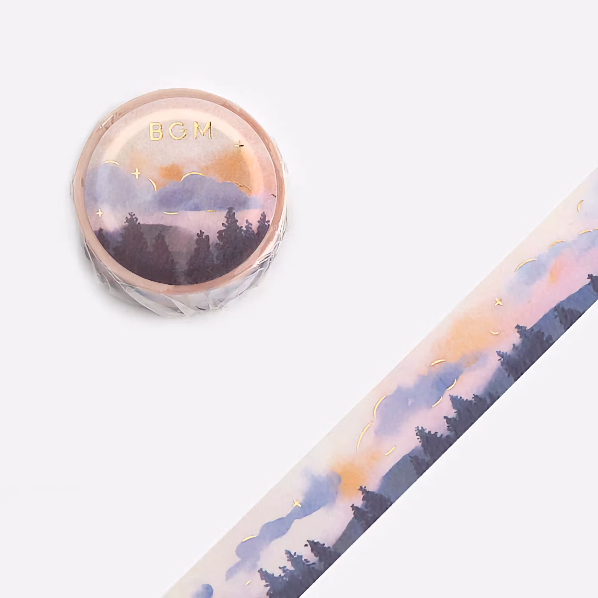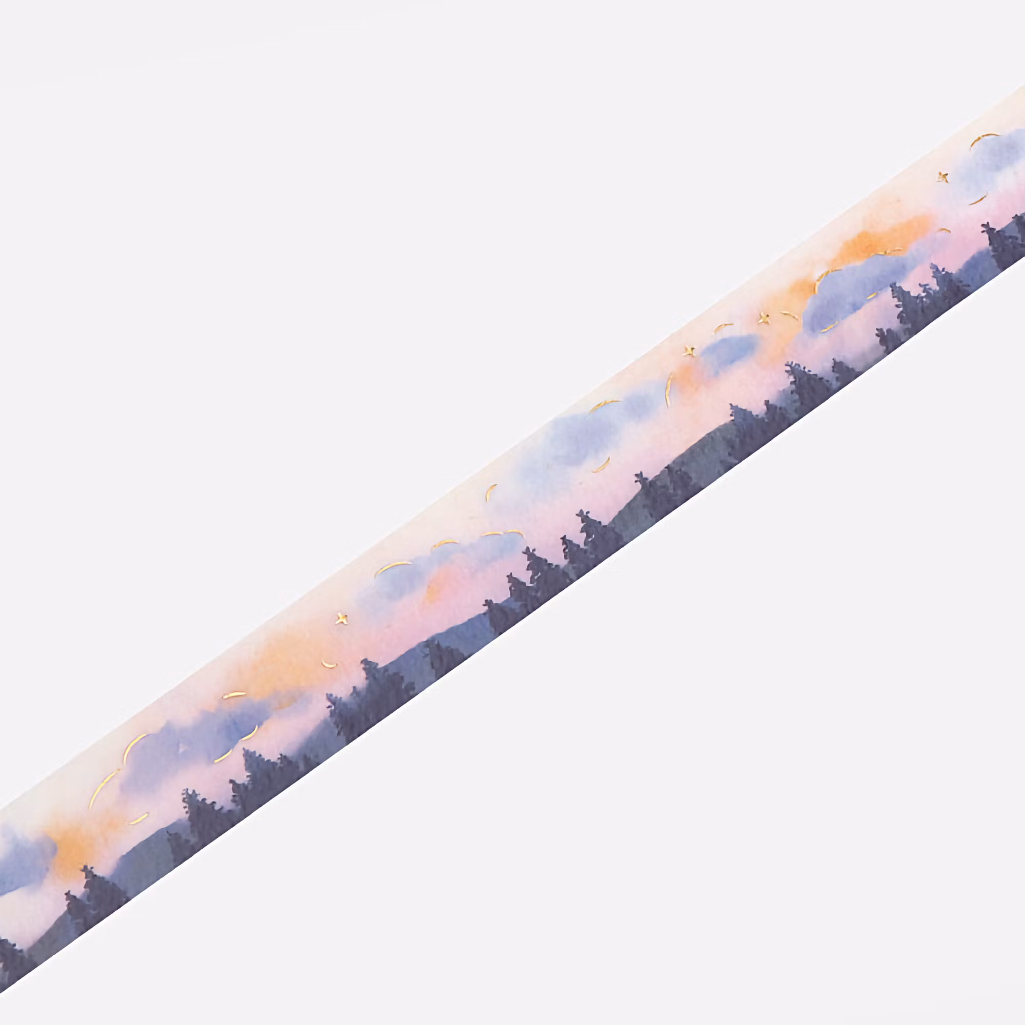 Washitejp med ett magiskt solnedgångsmotiv från japanska BGM. Tejpen har ett folieutförande, vilket gör att motivet glänser extra mycket.