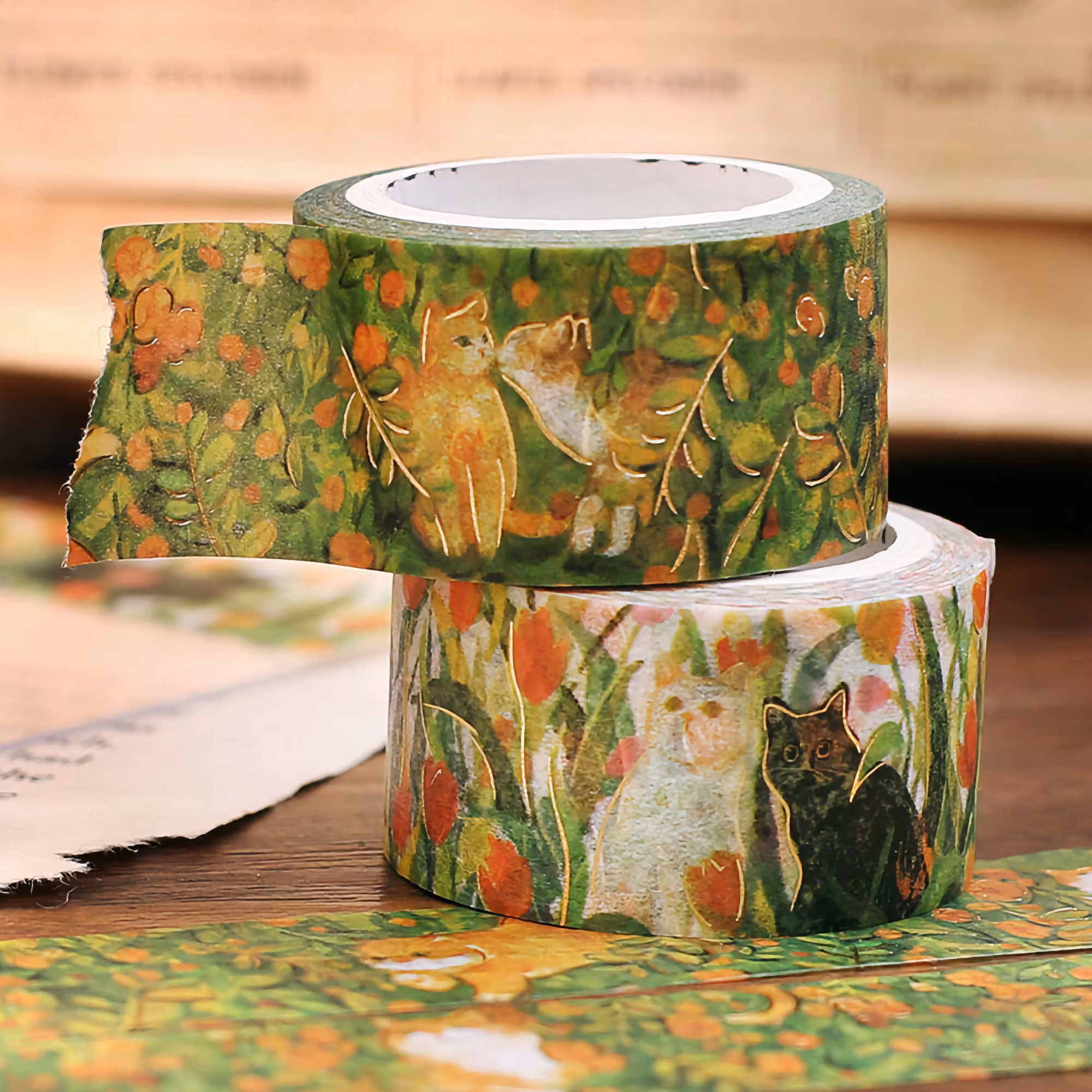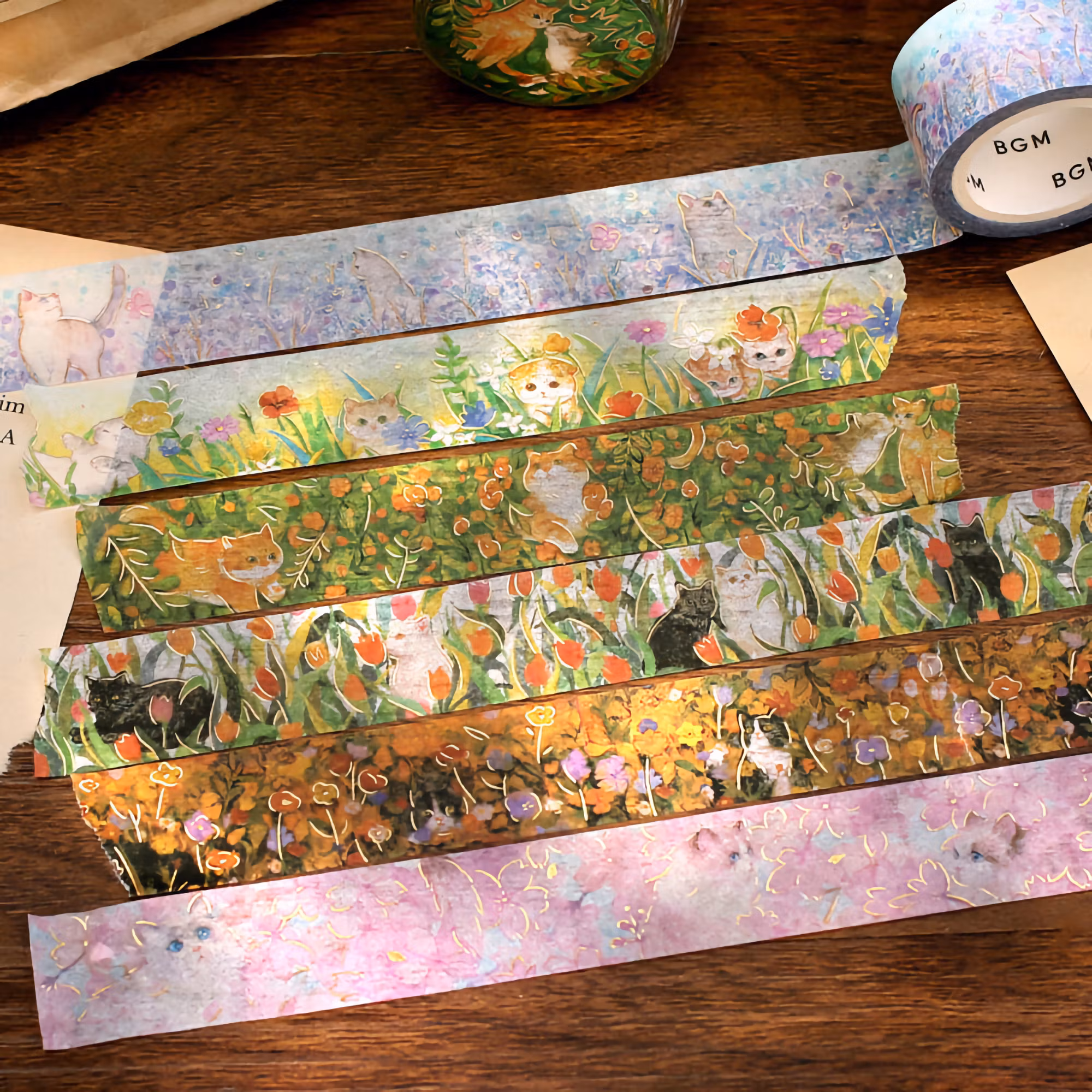 Washitejp med kattmotiv från japanska BGM. Tejpen har ett folieutförande, vilket gör att motivet glänser extra mycket.