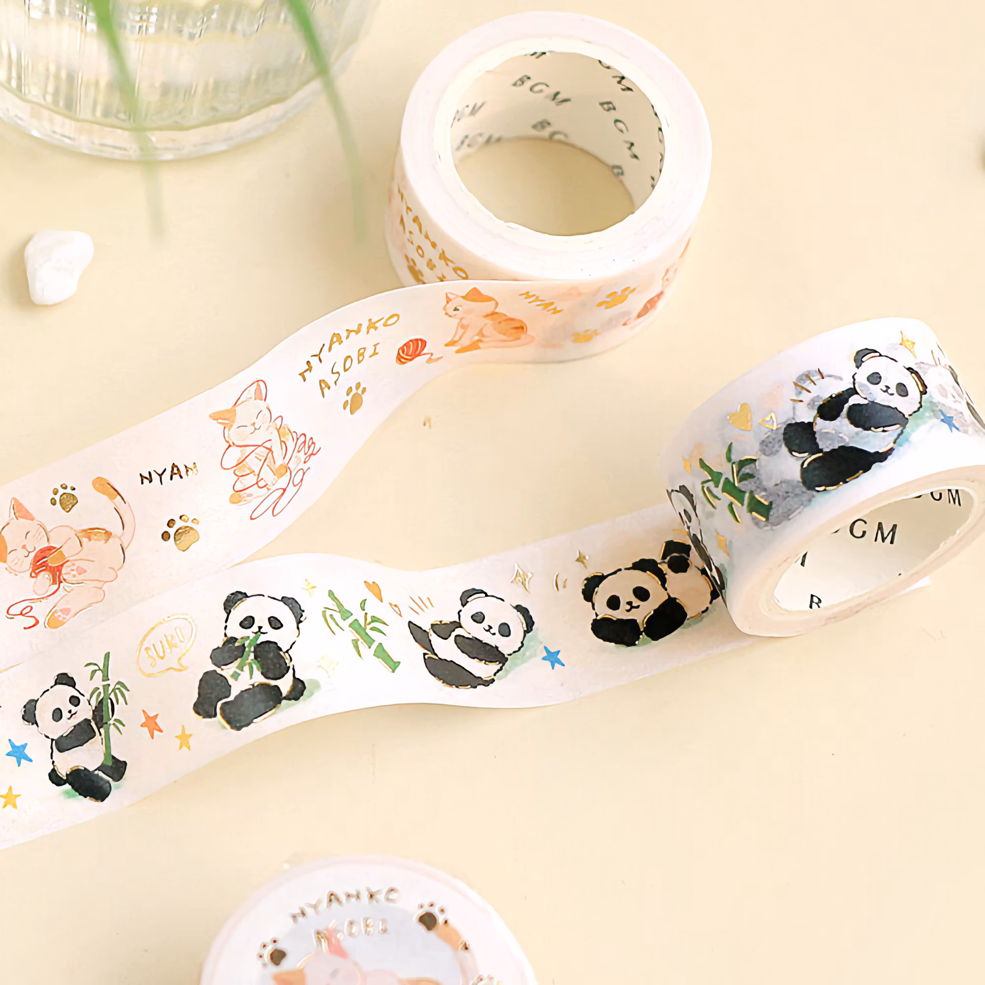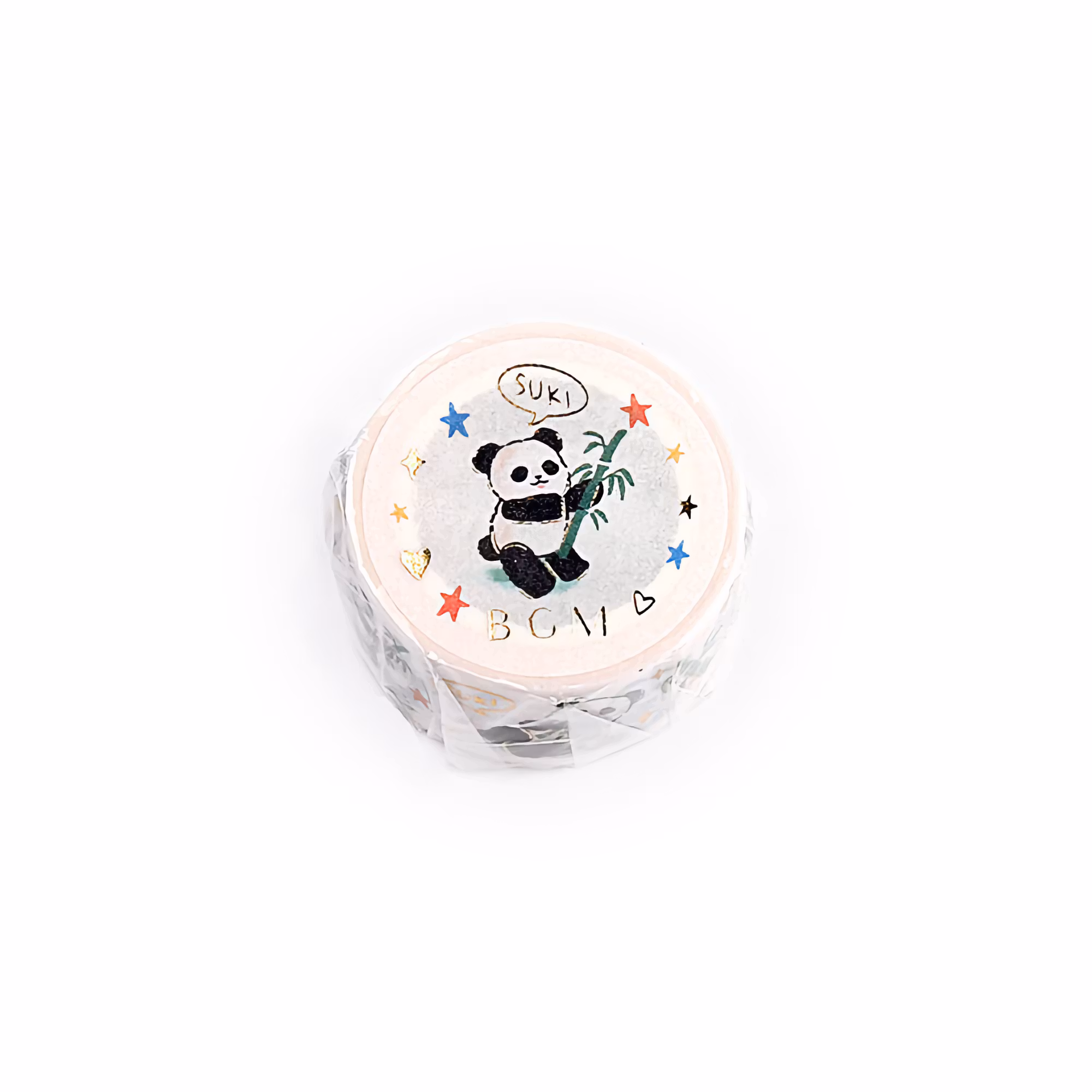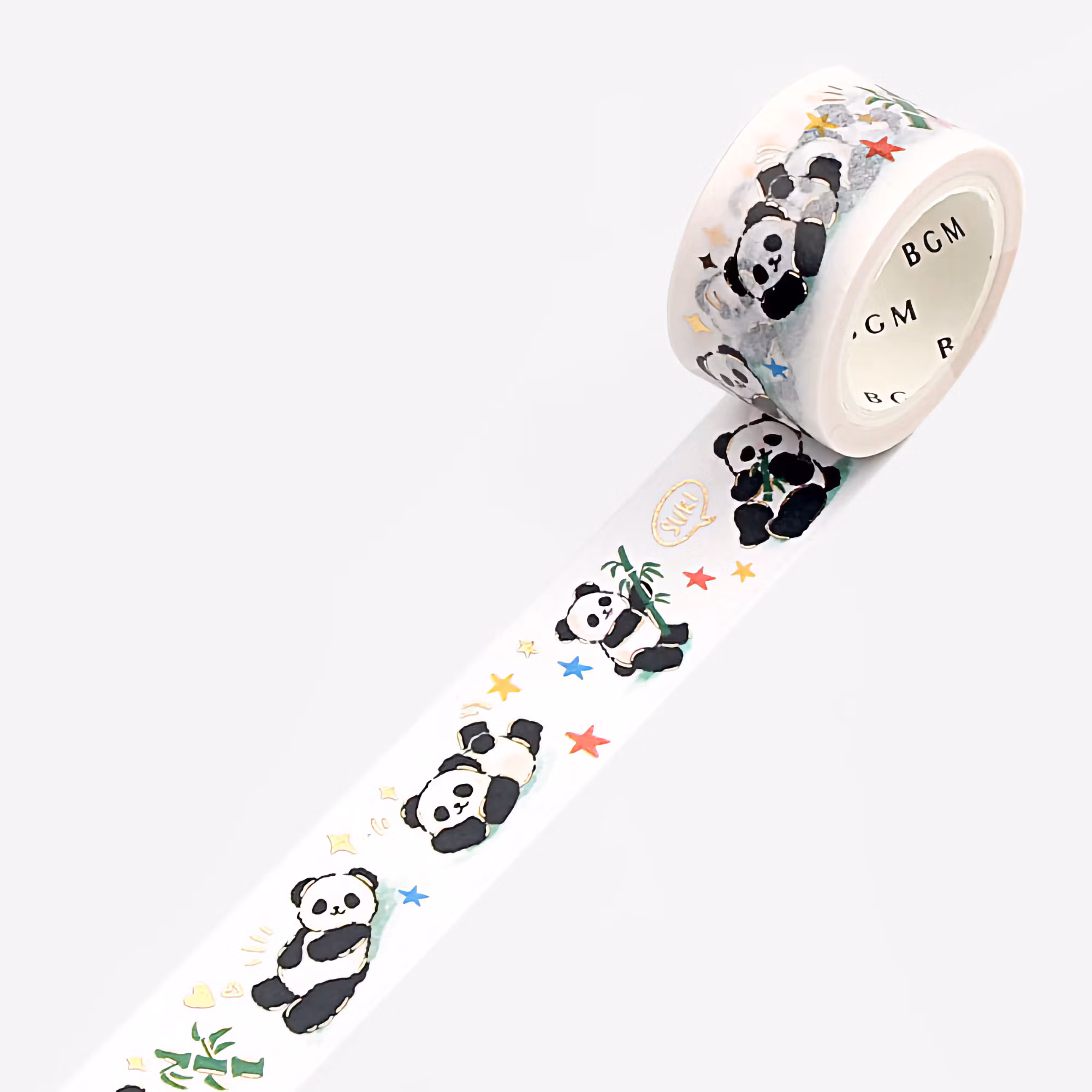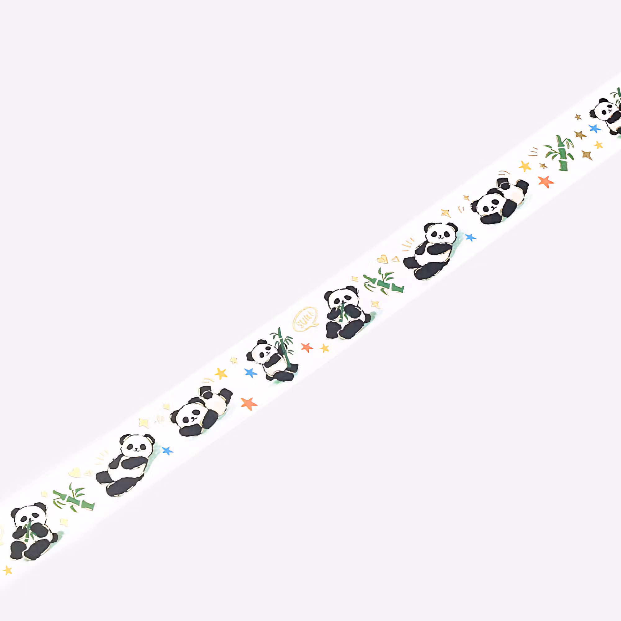 Washitejp med söta bambuätande pandor från japanska BGM. Tejpen har ett folieutförande, vilket gör att motivet glänser extra mycket.
