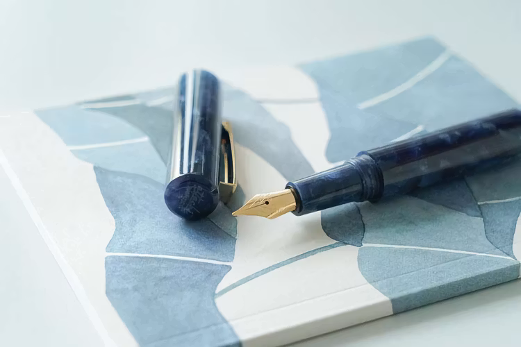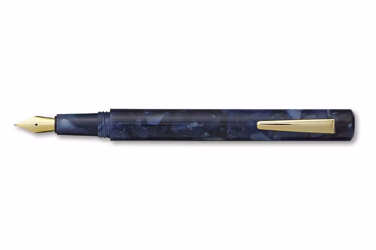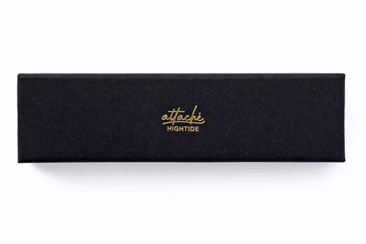 En mycket vacker reservoarpenna i Attaché-serien från japanska Hightide. Pennan har ett blått marmorerat mönster, och 24k guldplätering på en fine-spets i stål. Tar bläckpatroner i Short International Standard, som exempelvis Midoris eller Traveler's Companys. Finns också i grönt och vitt.
