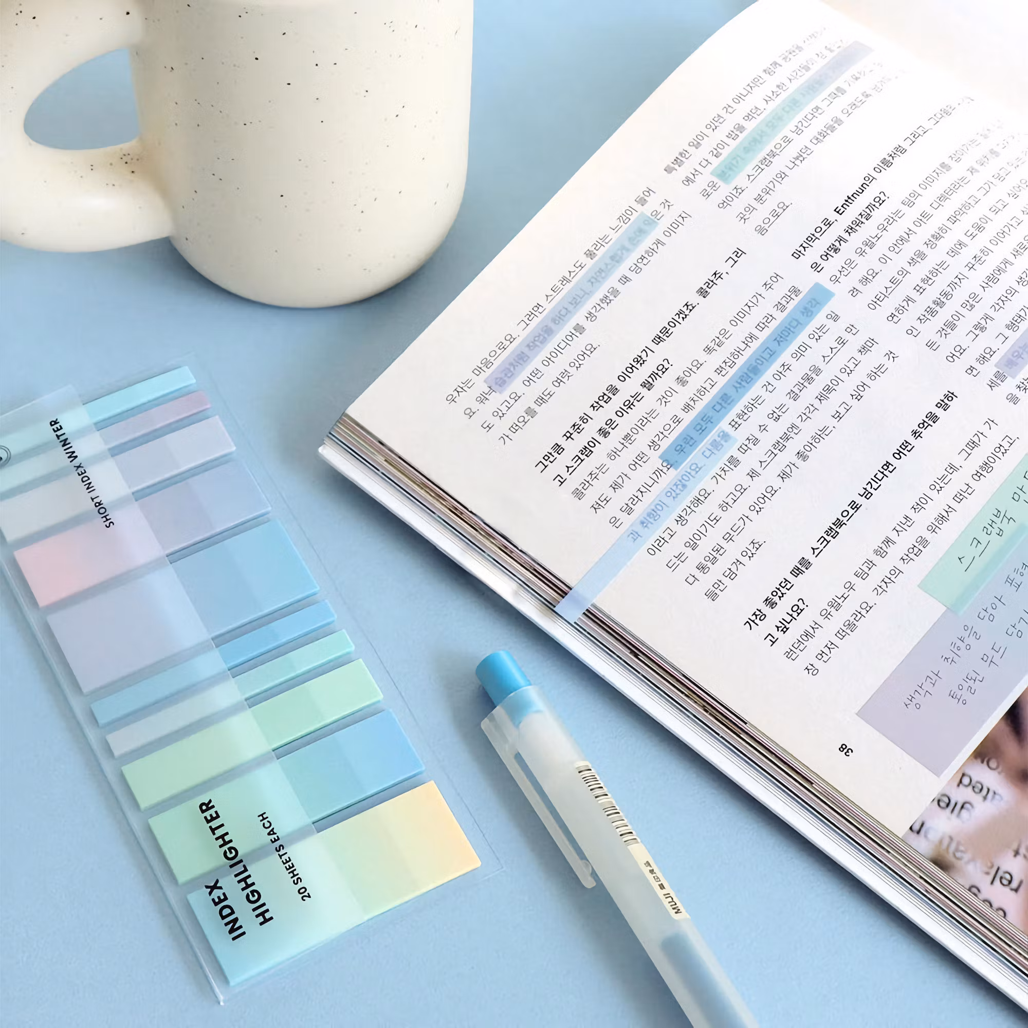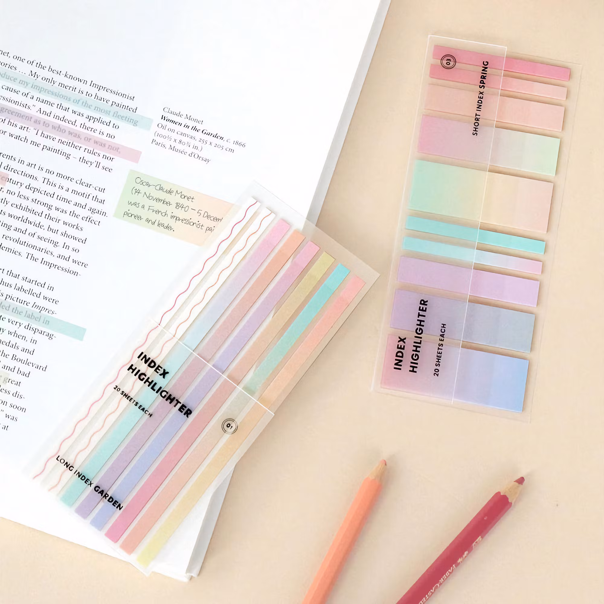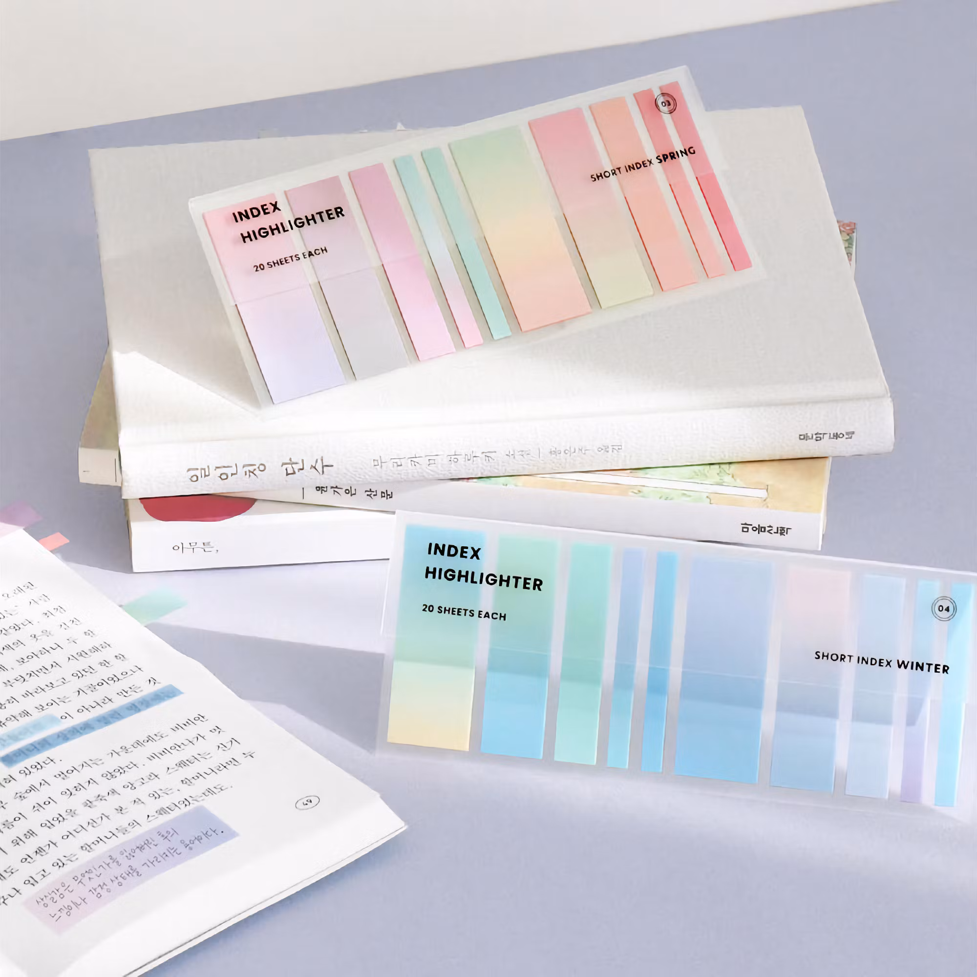 Med de genomskinliga, självhäftande klistermärkena från koreanska ICONIC kan du markera viktiga rader och sidor utan att göra permanenta märken i dina böcker! För att se till att de fäster ordentligt (och ligger platt) täcker den självhäftande ytan nästan hela baksidan av varje klistermärke. Den lilla delen utan klister gör det enkelt att dra av lapparna när du är klar – eller helt enkelt använda de som indexklistermärken/sidmarkörer.
