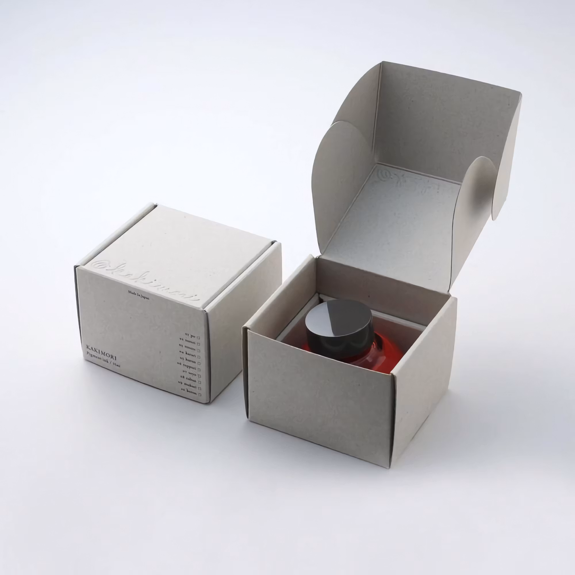 Kakimoris pigmentbaserade bläck i vackert utformade glasflaskor – som med sin form inbjuder till att doppa pennan.