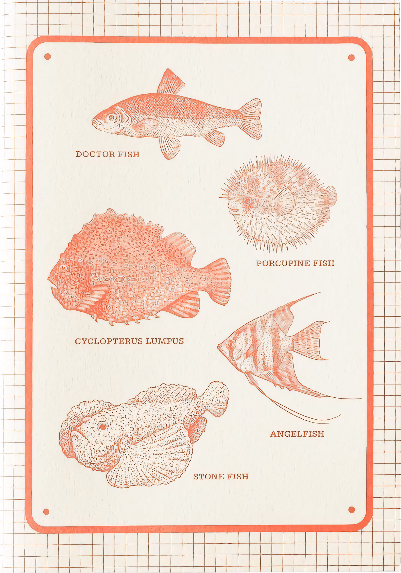 Vacker anteckningsbok från japanska Kawachiya, med fiskar tryckta med boktryck på framsidan.
