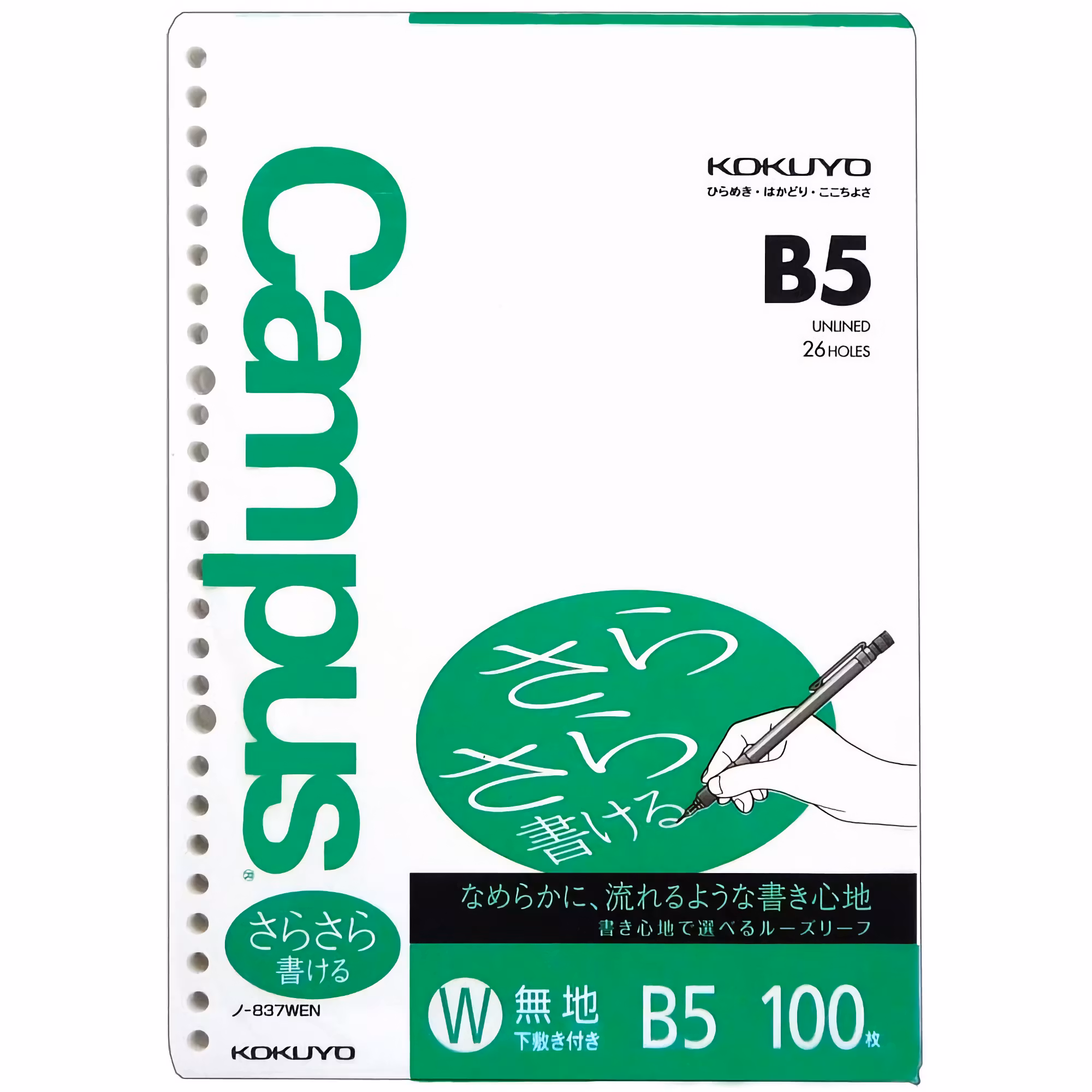 Refills till Kokuyo Campus Smart Ring Binder B5. Innehåller 100 blanka sidor med 26 hål placerade med ungefär 9,7 mm mellanrum. Två av hålen är i större format, vilket gör att de även fungerar med en vanlig europeisk pärm.