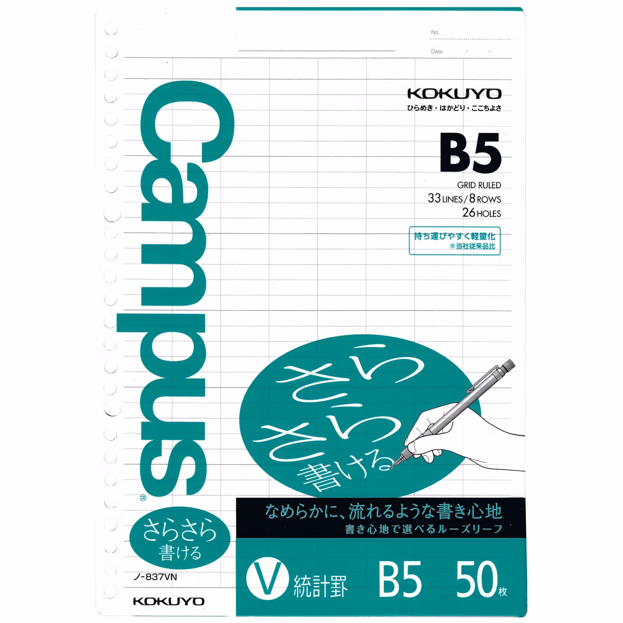 Refills till Kokuyo Campus Smart Ring Binder B5. Innehåller 50 sidor med avlånga rutor med 26 hål placerade med ungefär 9,7 mm mellanrum. Två av hålen är i större format, vilket gör att de även fungerar med en vanlig europeisk pärm. De avlånga rutorna gör att pappret liknar ett excel-dokument.