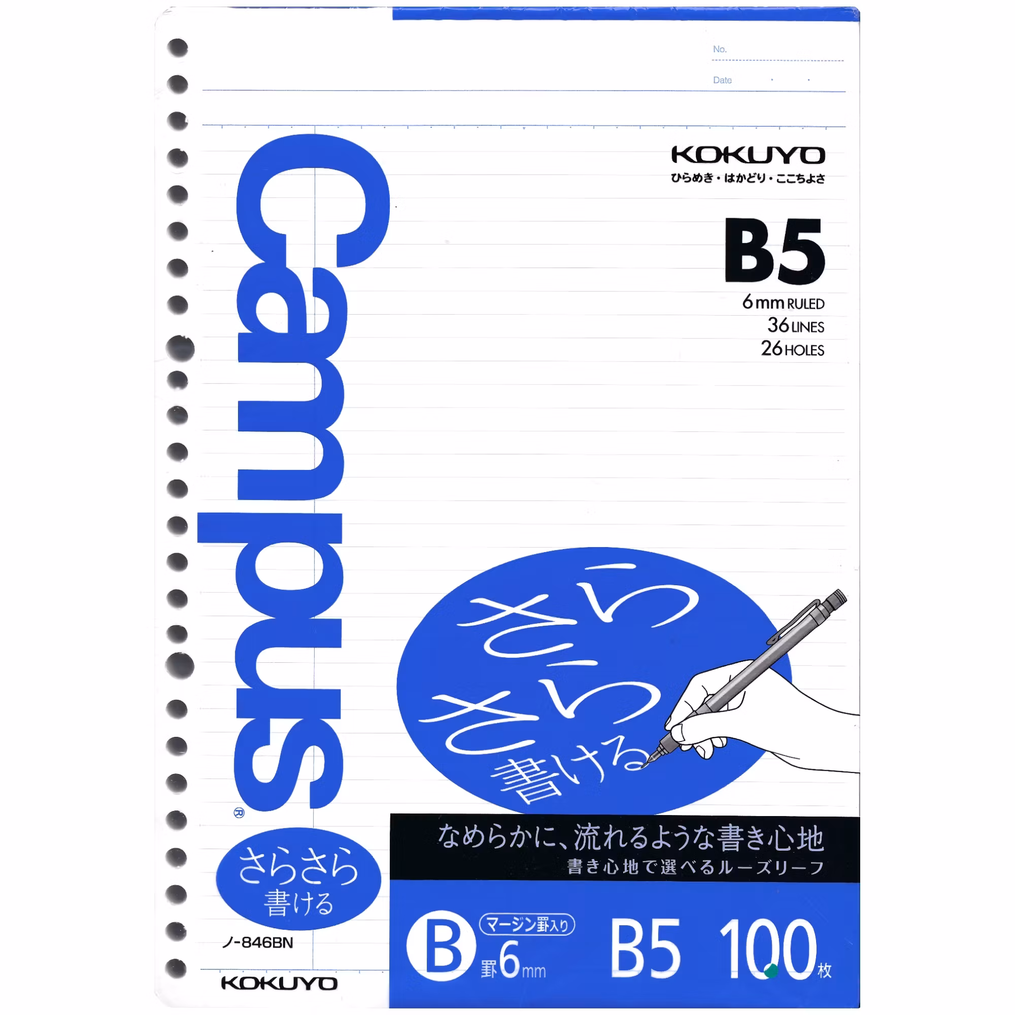Refills till Kokuyo Campus Smart Ring Binder Notebook i B5-format. Innehåller 100 linjerade sidor med 26 hål placerade med ungefär 9,7 mm mellanrum. Kokuyos Sarasara-papper är extra slätt. Två av hålen är i större format, vilket gör att de även fungerar med en vanlig europeisk pärm. Linjerna har ett avstånd på 6 mm.