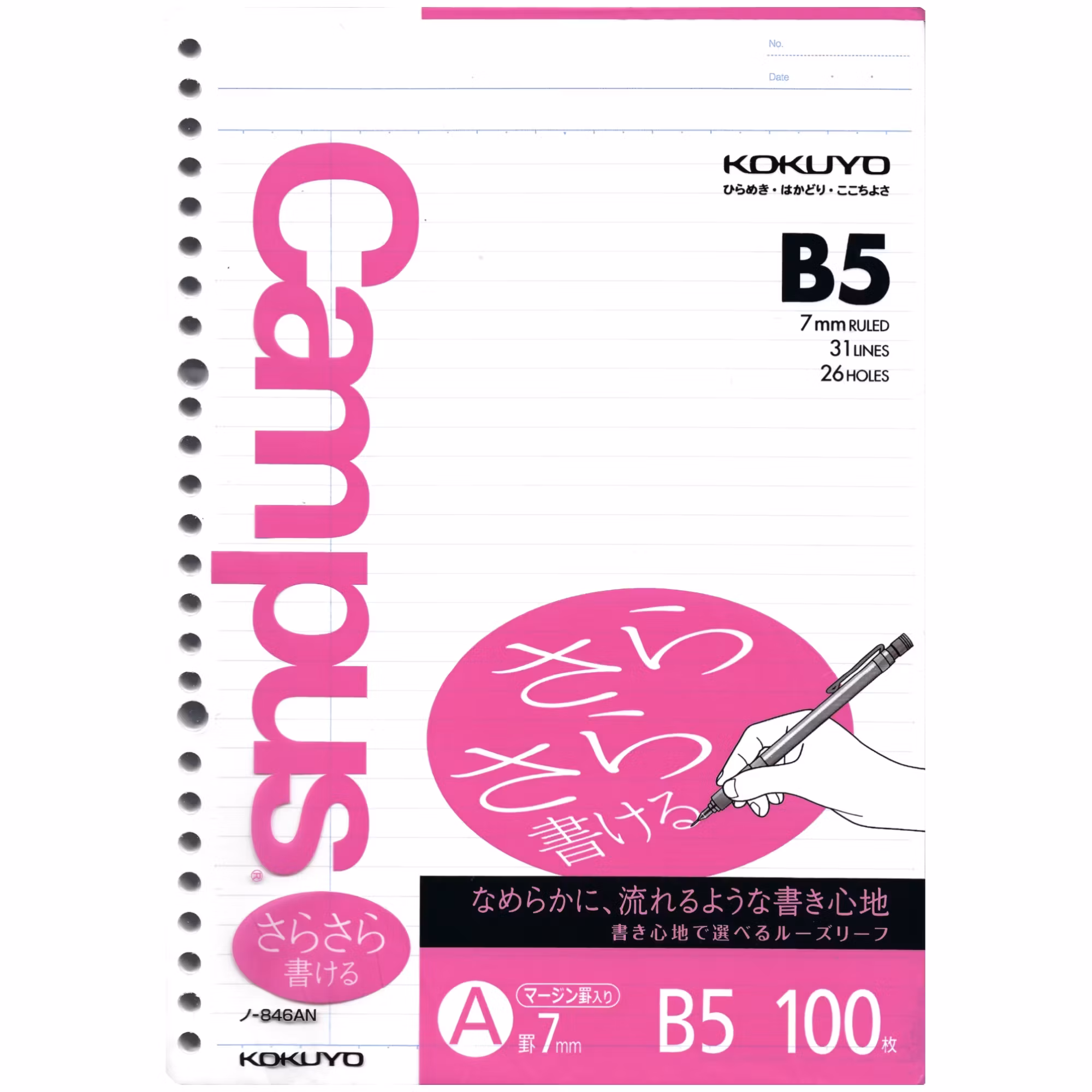 Refills till Kokuyo Campus Smart Ring Binder B5. Innehåller 100 blanka sidor med 26 hål placerade med ungefär 9,7 mm mellanrum. Två av hålen är i större format, vilket gör att de även fungerar med en vanlig europeisk pärm. Linjerna har ett avstånd på 7 mm.