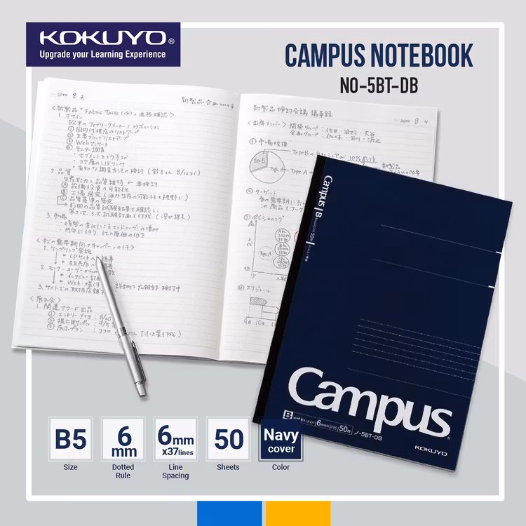 Kokuyos Campus-serie är omåttligt populära hos japanska studenter. Lägg där till att japanska studenter i allmänhet värderar anteckningsböcker långt högre än oss i väst, så får du en någorlunda bild av hur populära dessa är. Trots det överkomliga priset består Campus-serien av arkivbeständigt syrafritt papper, som utan problem klarar reservoarpennor. Anteckningsboken är limbunden.