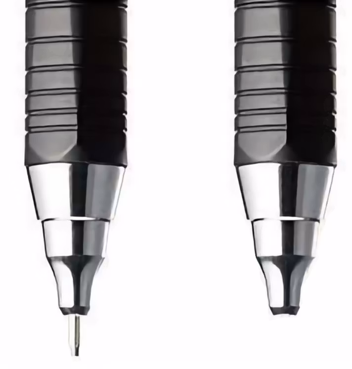 Röret som omsluter stiftet sträcker sig 4 mm utanför pennkroppen, vilket gör att du får en bättre överblick över skrivytan. Röret kan också tryckas in i pennkroppen när den inte används. Pennan har också ett generöst klipp så att du med enkelhet kan ha den i bröstfickan eller på en anteckningsbok. Suddet – som går att köpa påfyllning till här – är av typen twist-up.