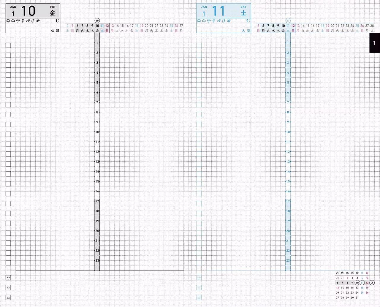 Problemet med en konventionell dag-för-dag-kalender är att det kan vara svårt att se var i veckan man befinner sig. Kokuyo har löst problemet genom att göra dagens position inom veckan mer intuitivt tydlig.