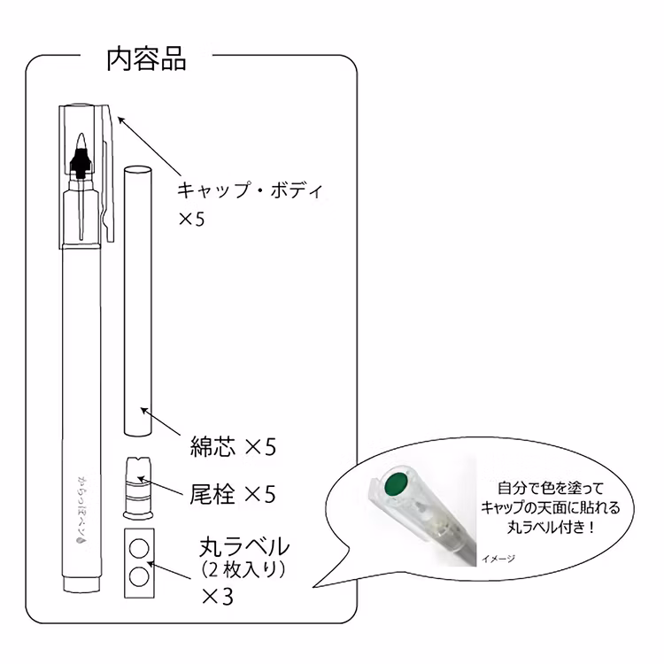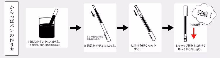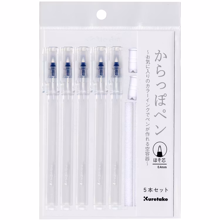 Karappo – japanska för tom – är en snillrik penna från Kuretake. Genom att doppa ena änden av den medföljande bomullspinnen i bläck kan du enkelt absorbera och använda vilket bläck du vill.