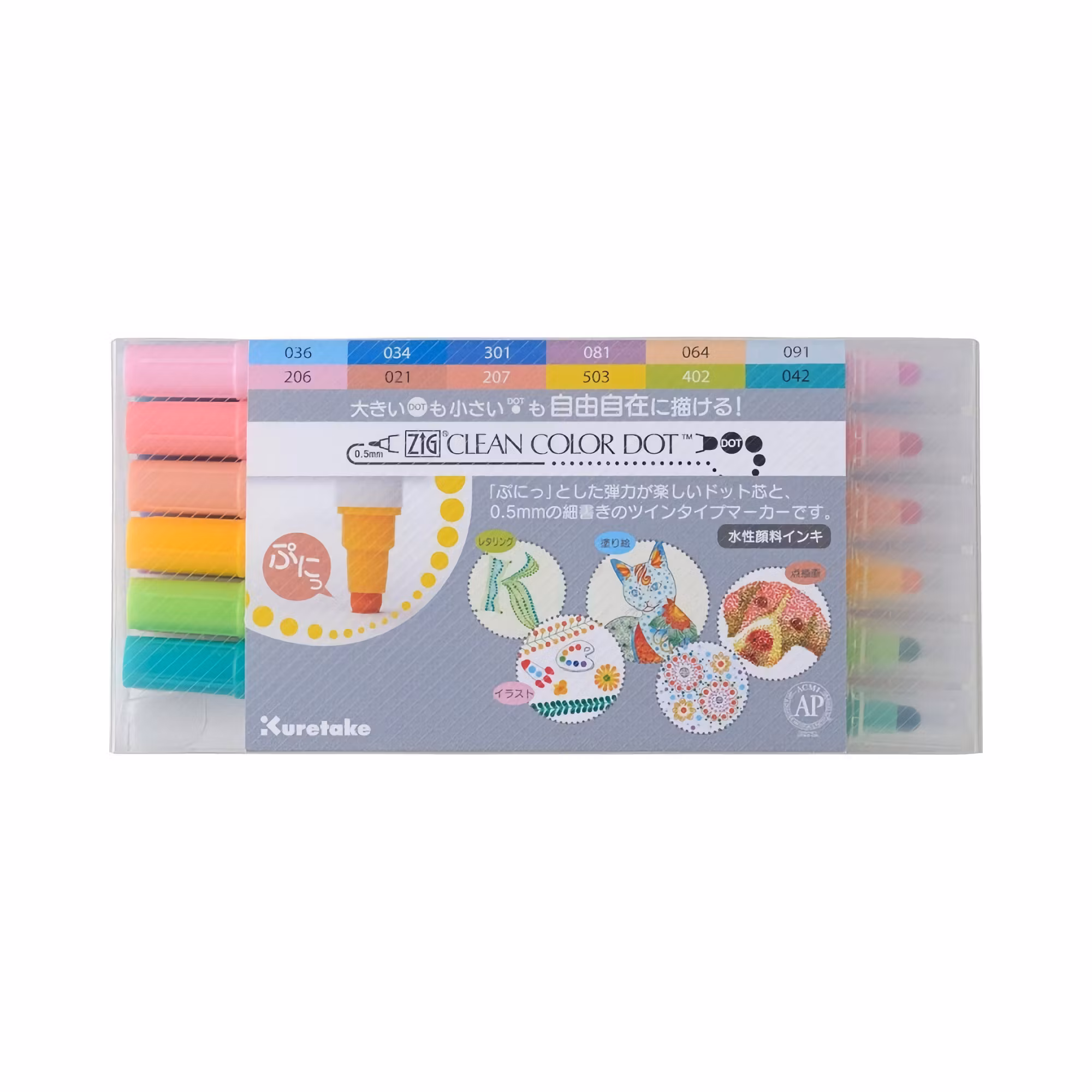 Kuretakes Zig Clean Color Dot är en helfestlig markeringspenna med dubbla ändar. Den lite hårdare plastspetsen (0,5 mm) i ena änden är perfekt för färggranna och detaljerade skisser eller markeringar, medan du med den lekfulla dot-spetsen i andra änden skapar härliga prickar. Storleken på prickarna kan variera mellan ungefär 1 till 5 mm i diameter beroende på hur hårt du trycker.
