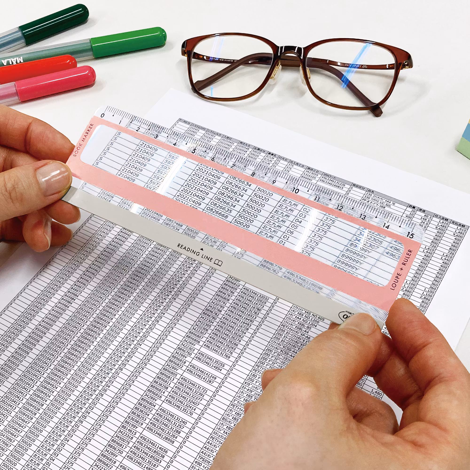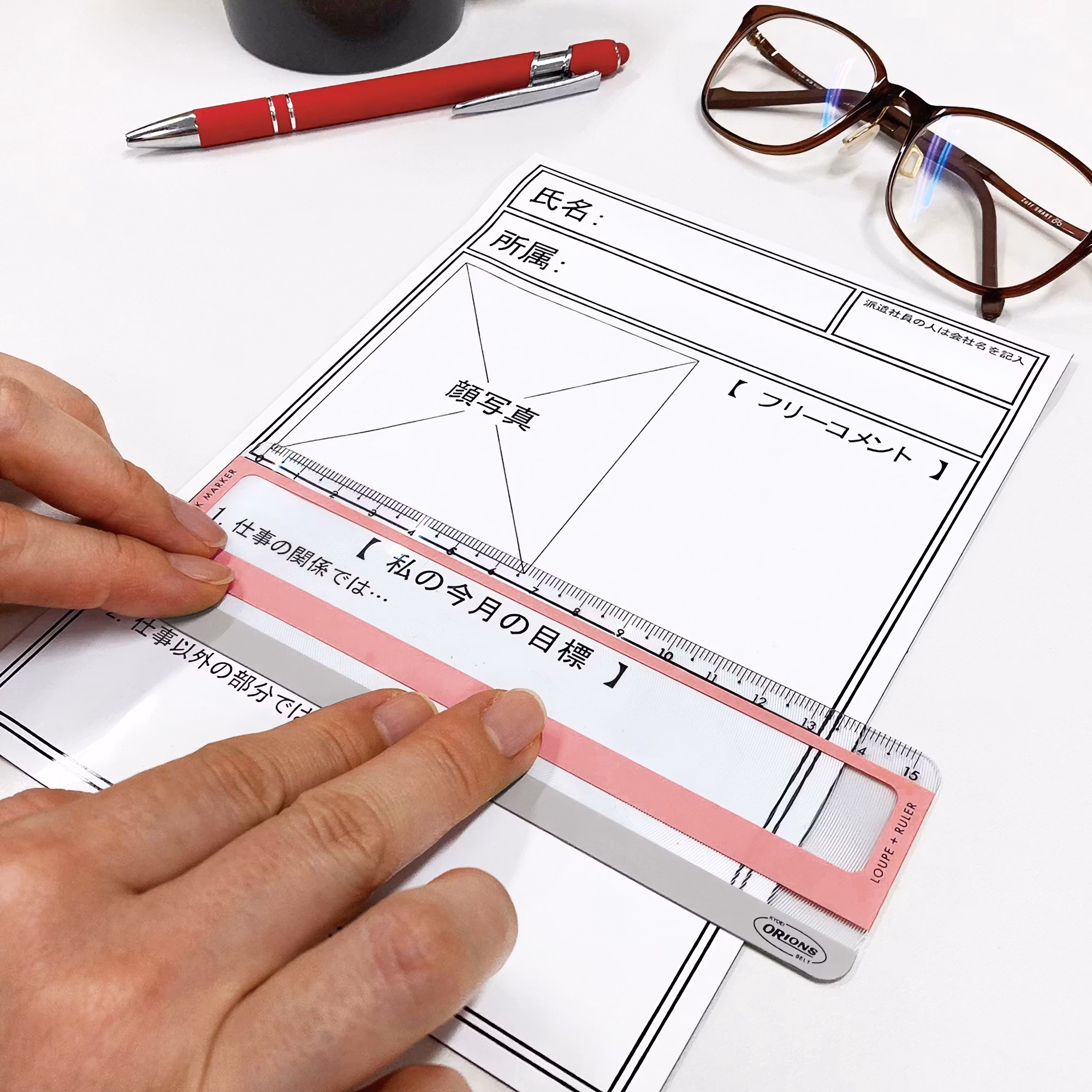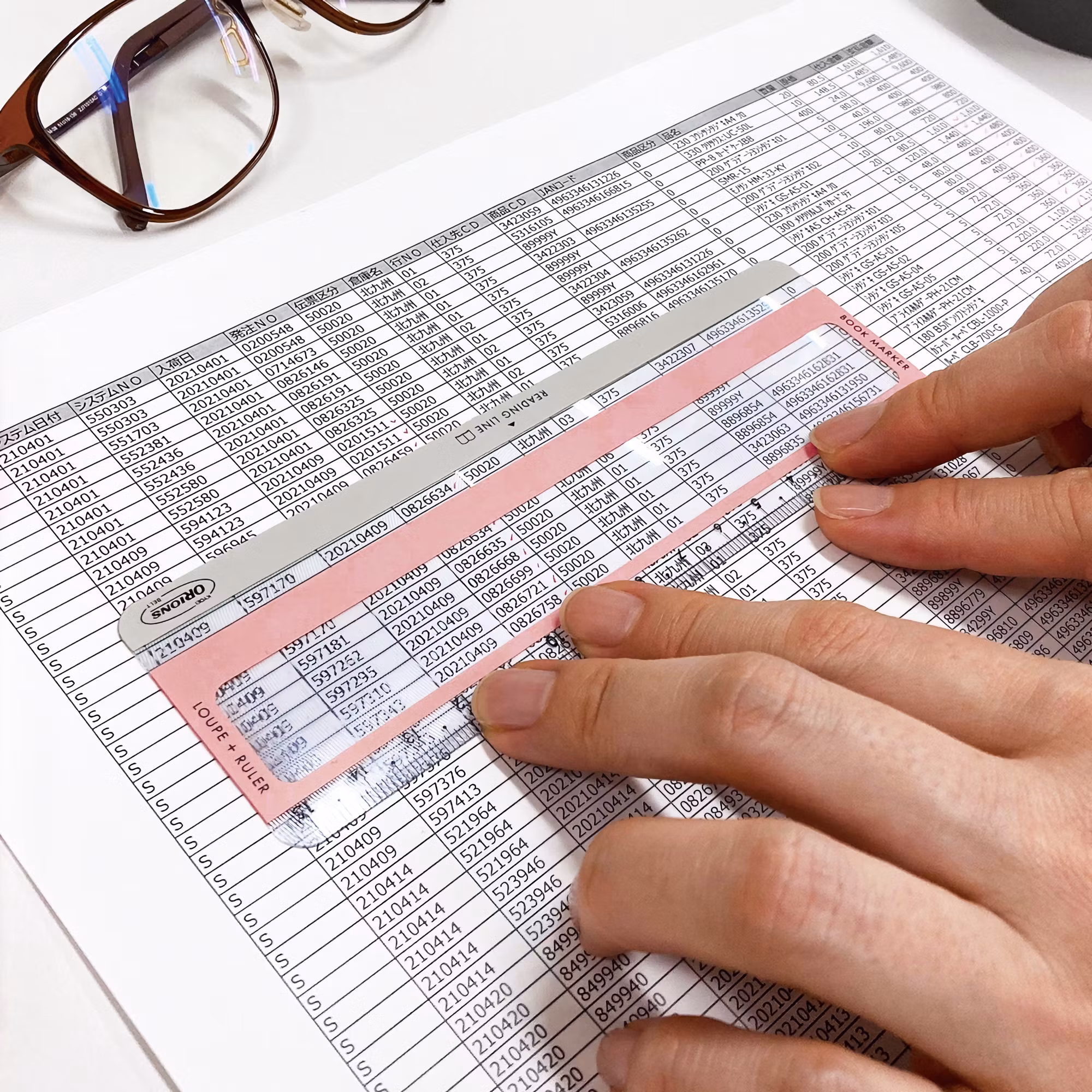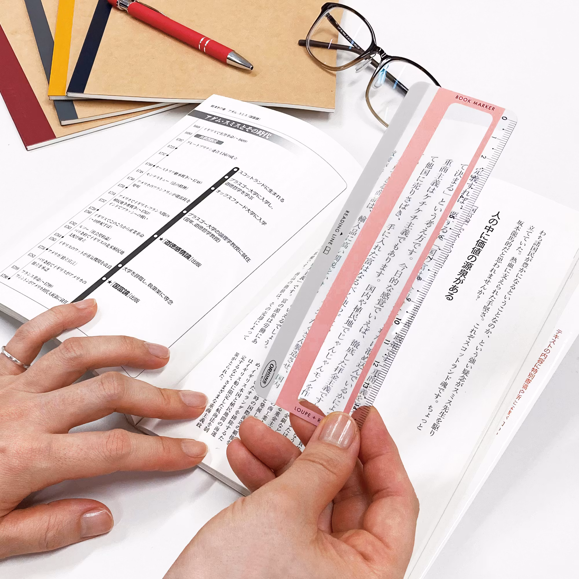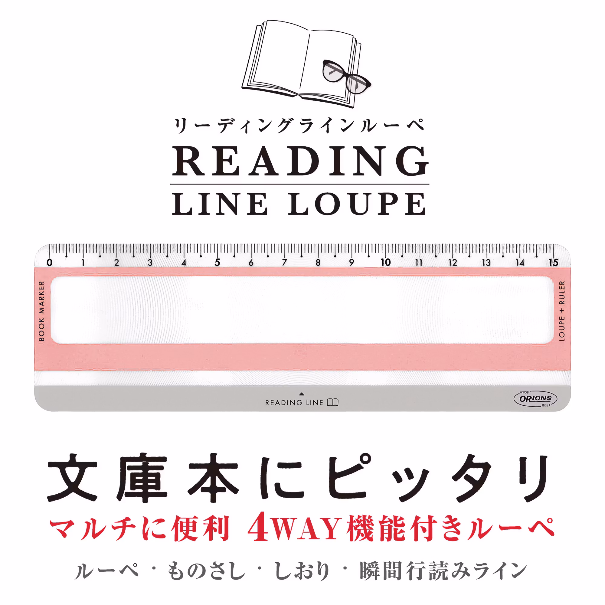 Kyoeis Orions Reading Line Loupe är en helpraktiskt och multifunktionell läslupp. Förutom luppen som förstorar texten, är den också utrustad med en linjal och en "läsrad". På grund av sin mycket tunna profil (0,4 mm) fungerar den också utmärkt som bokmärke.