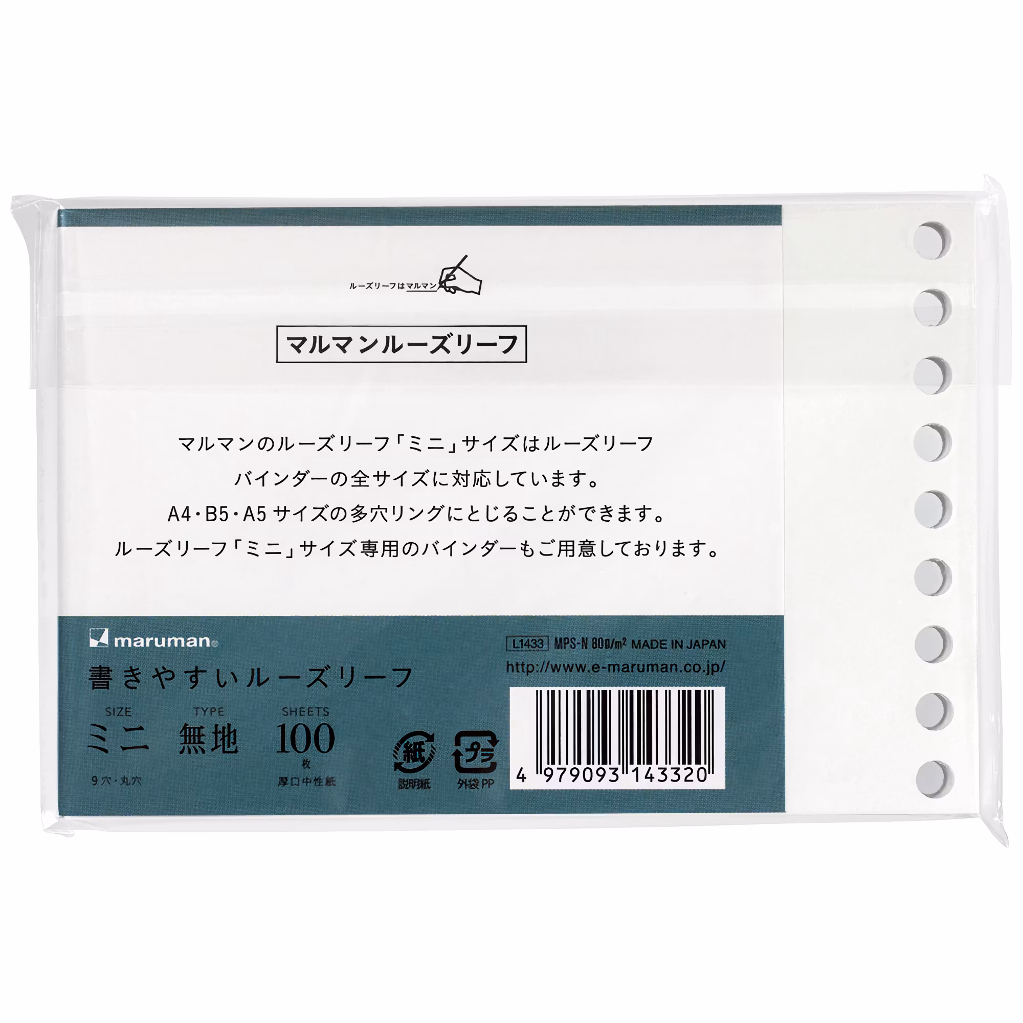 100 sidor med blankt papper. Passar till någon av Marumans Mini Binder. Hålen är placerade med ungefär 9,7 millimeters mellanrum mellan hålens mitt.