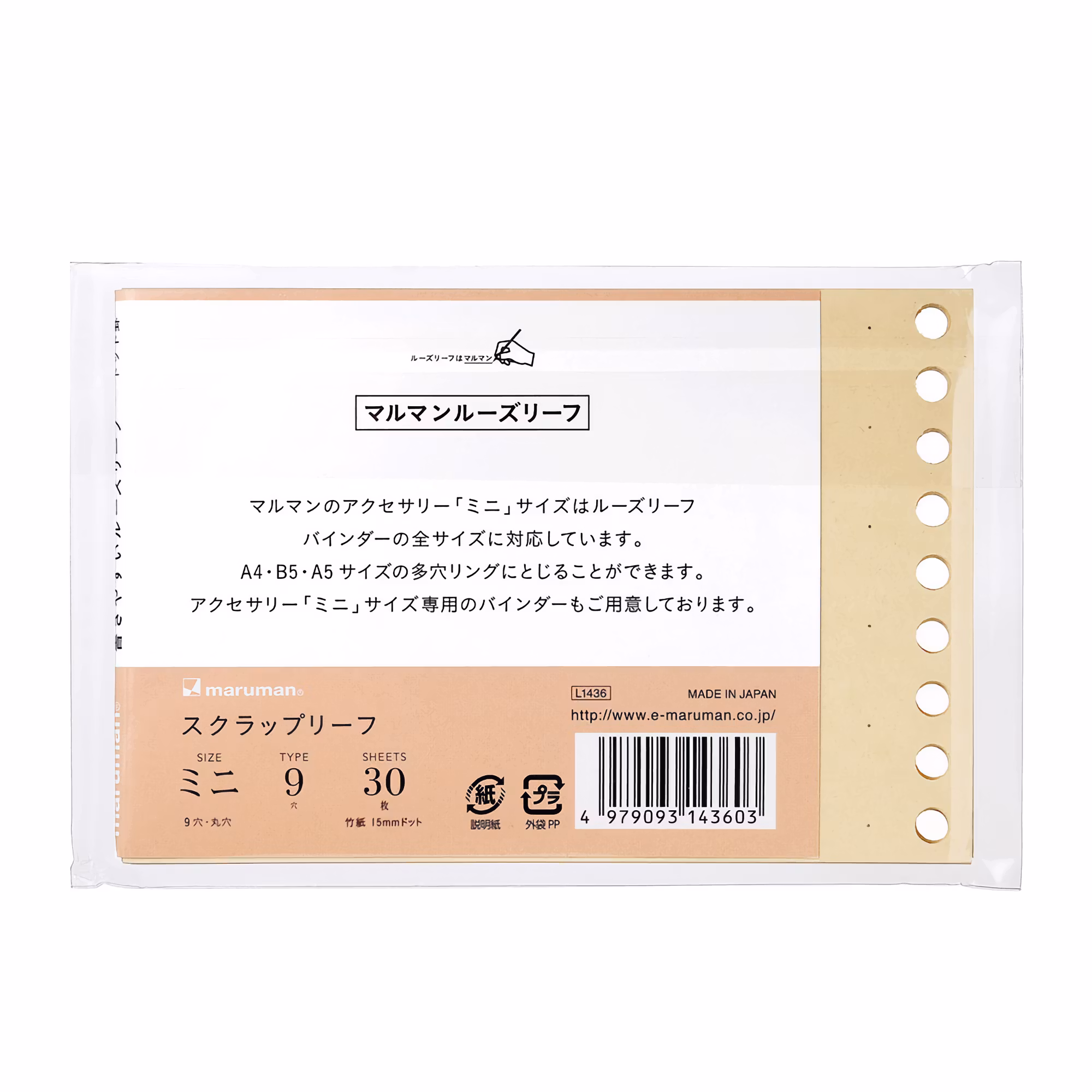 30 sidor med scrapbook-papper med praktiska dot grids. Passar till någon av Marumans Mini Binder. Hålen är placerade med ungefär 9,7 millimeters mellanrum mellan hålens mitt.