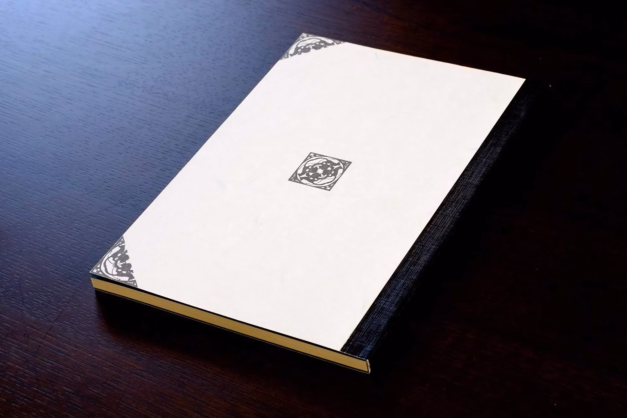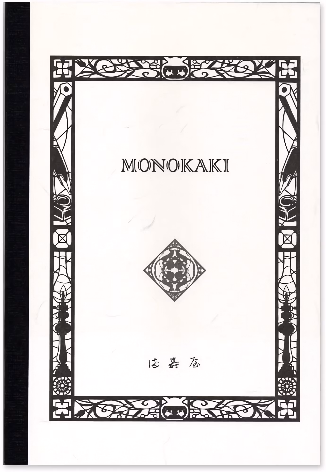 Omslaget är tillverkat av traditionellt japanskt washipapper från en verksamhet som tillverkat papper sedan Edo-perioden (1603–1868). Lägg också märke till de fina utsmyckningarna längs kanterna på omslaget, bestående av kontorsmaterial och pennor.