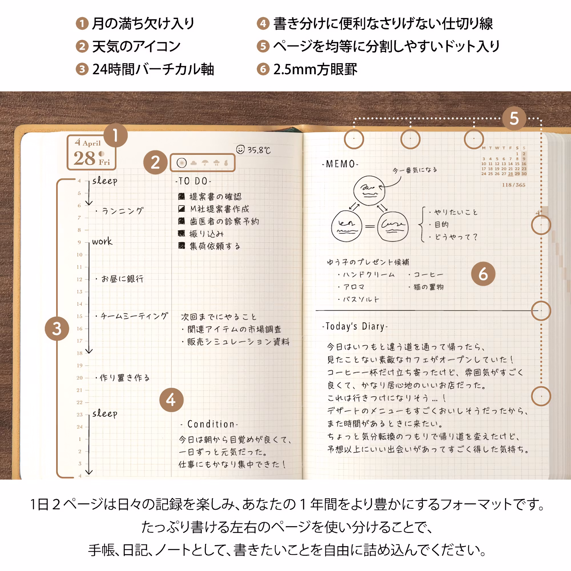Varje dag har ett dedikerat dubbelsidigt uppslag med gott om utrymme för planering, dagboksskrivande, och minnen. Vänstra sidan visar aktuellt datum, månfas, vädersymboler och en 24-timmars tidsaxel för möten och händelser. Högra sidan är en enkel rutad sida med en månadskalender i miniatyr i hörnet, och subtila guidepunkter för att hjälpa till att dela upp sidan.