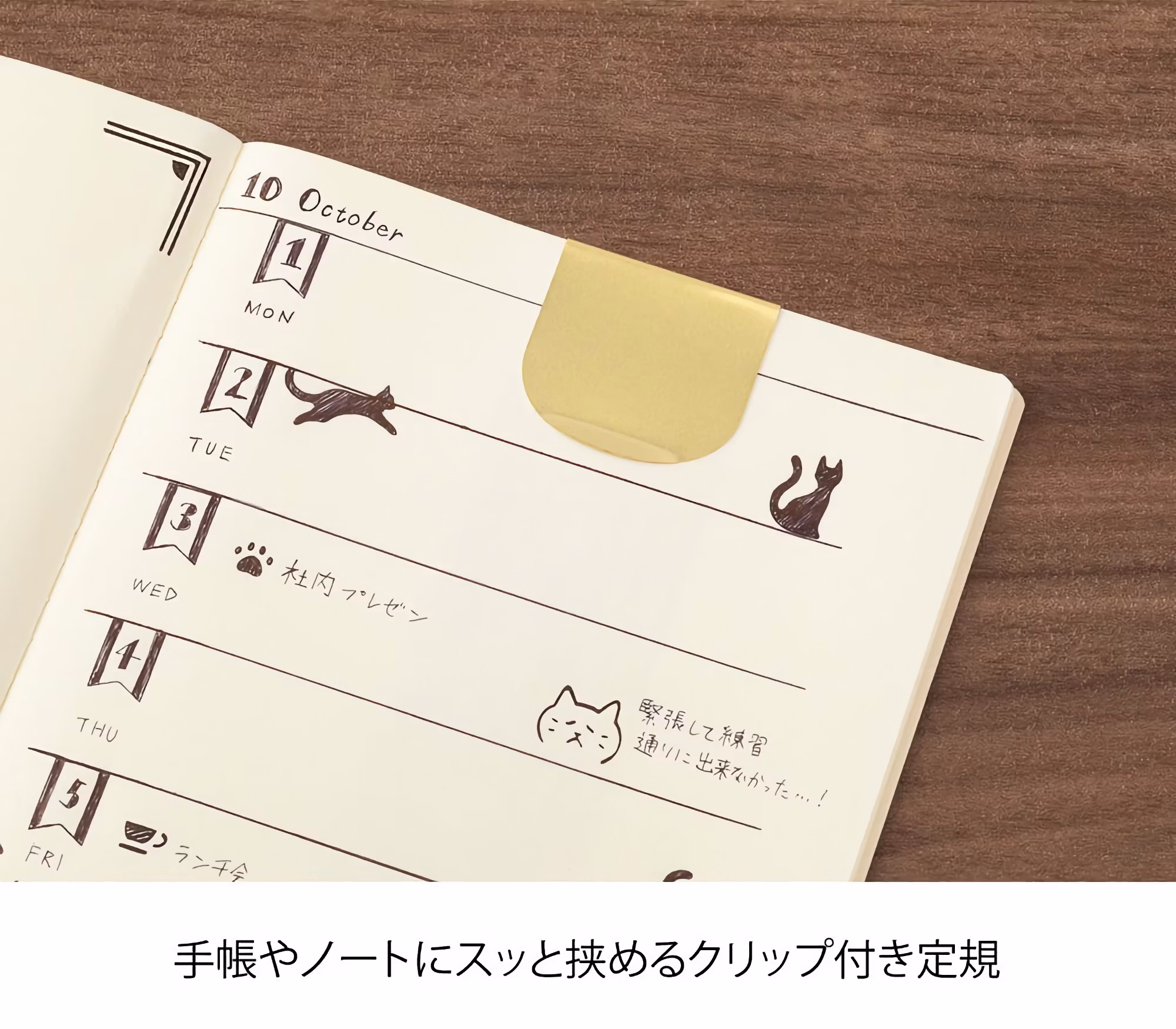 Midoris linjal är ett perfekt tillbehör till din kalender. Varför? Jo, förutom att linjalen i sig är bra för att strukturera upp din planering, hjälper stencilerna dig att planera in saker på ett lite festligare sätt. Klippet gör dessutom att du kan använda linjalen som bokmärke. Mäter upp till tio centimeter.