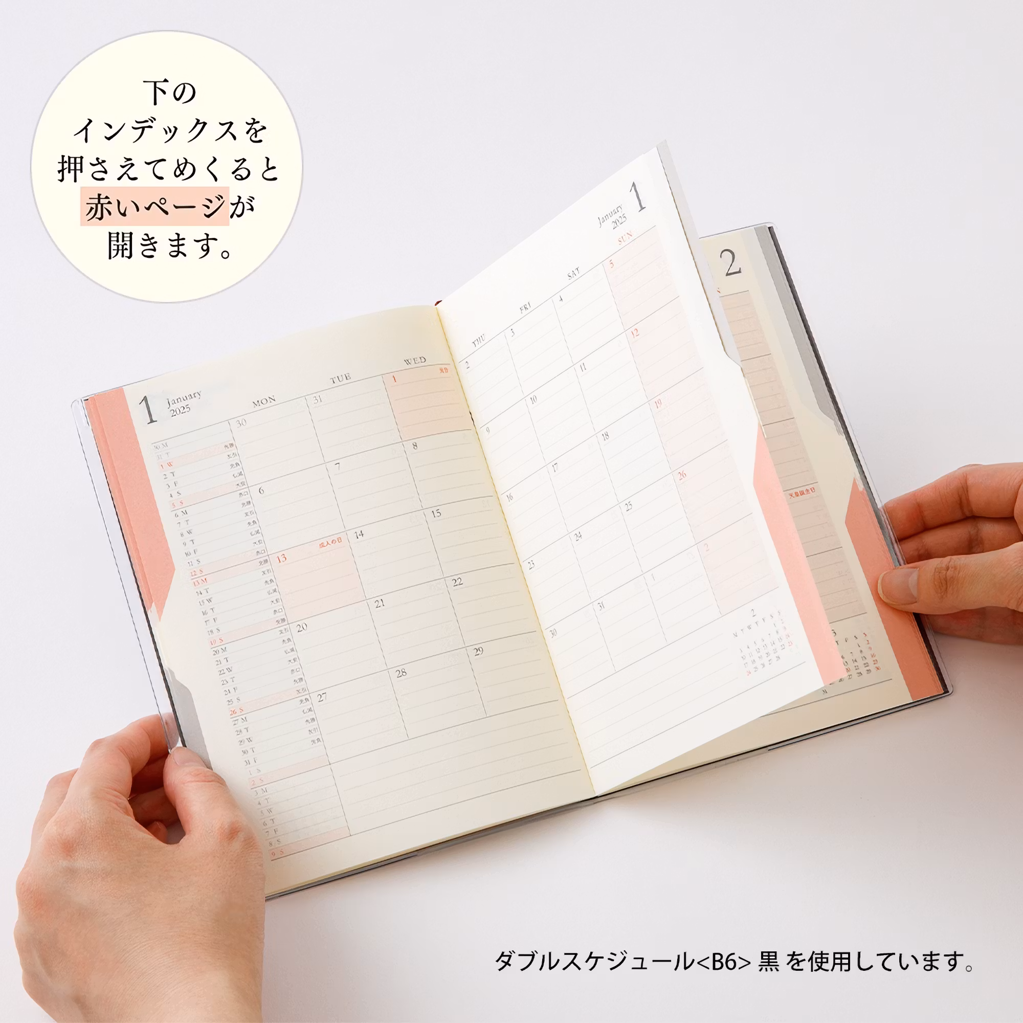 Med Midoris Double Schedule blir det enkelt att hantera både jobb och privatliv. Boken innehåller nämligen "magiska indexflikar" som gör det enkelt att bläddra mellan de båda kalendrarna. Håll bara på det röda indexet för att endast öppna de röda sidorna, och på det grå indexet för att endast slå upp de grå sidorna. Håller du nere på de vita indexen mellan rött och grått bläddrar du genom alla sidor växelvis.