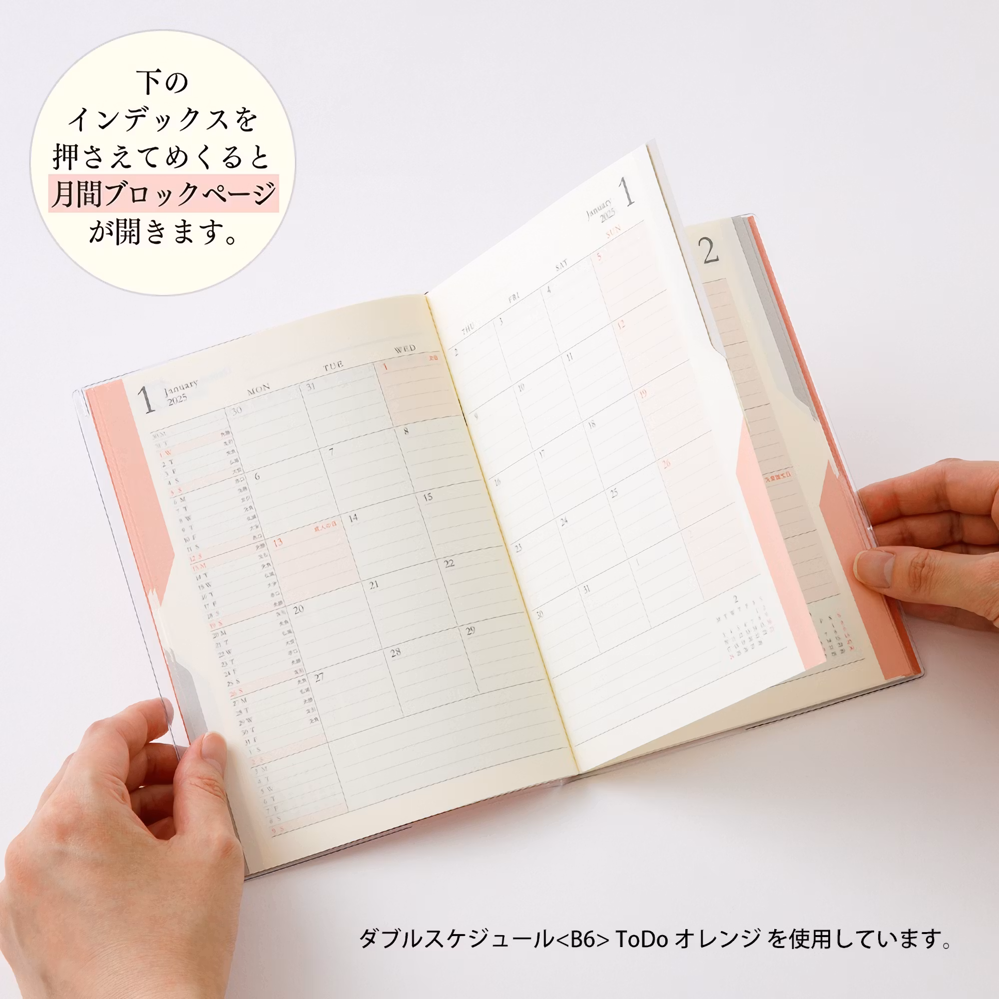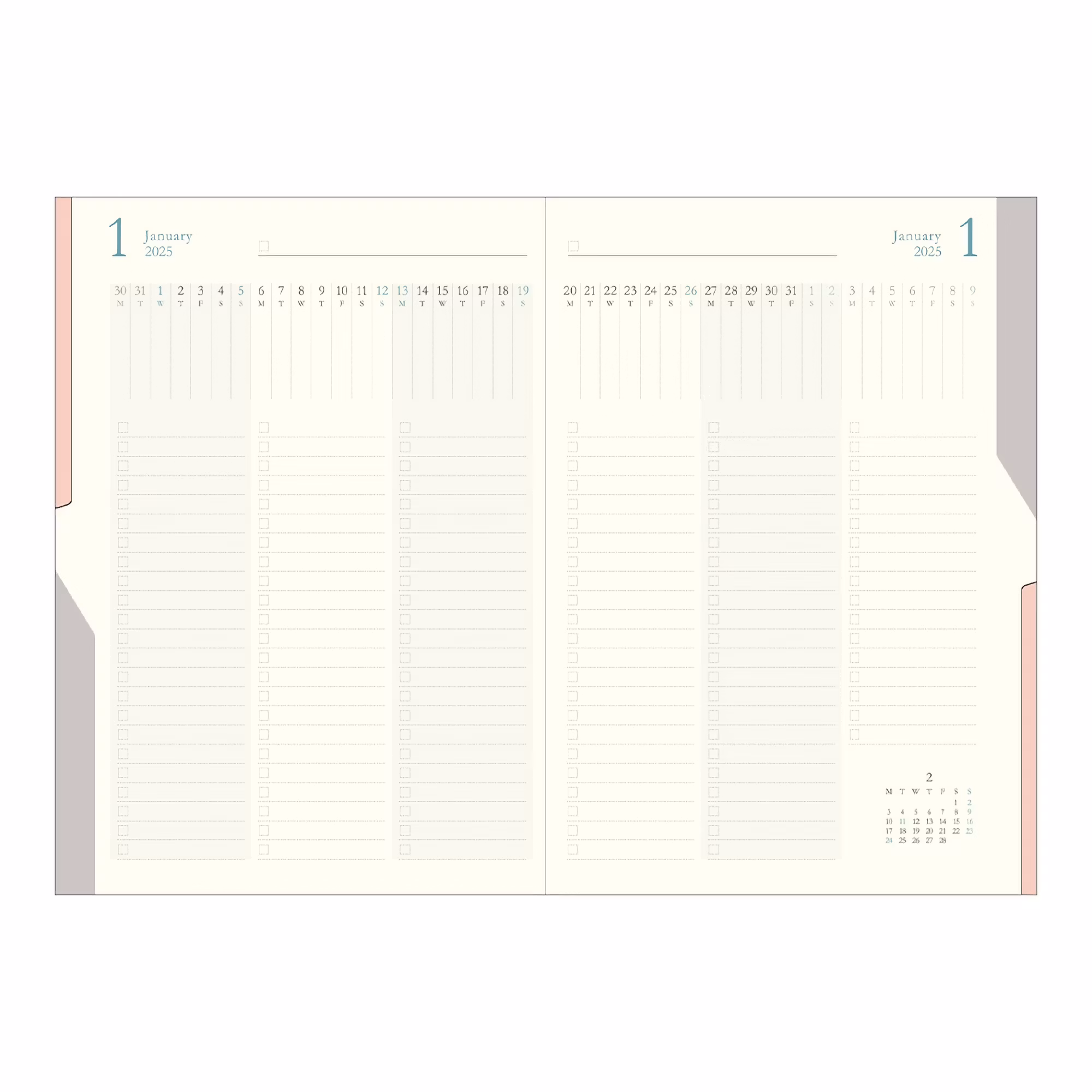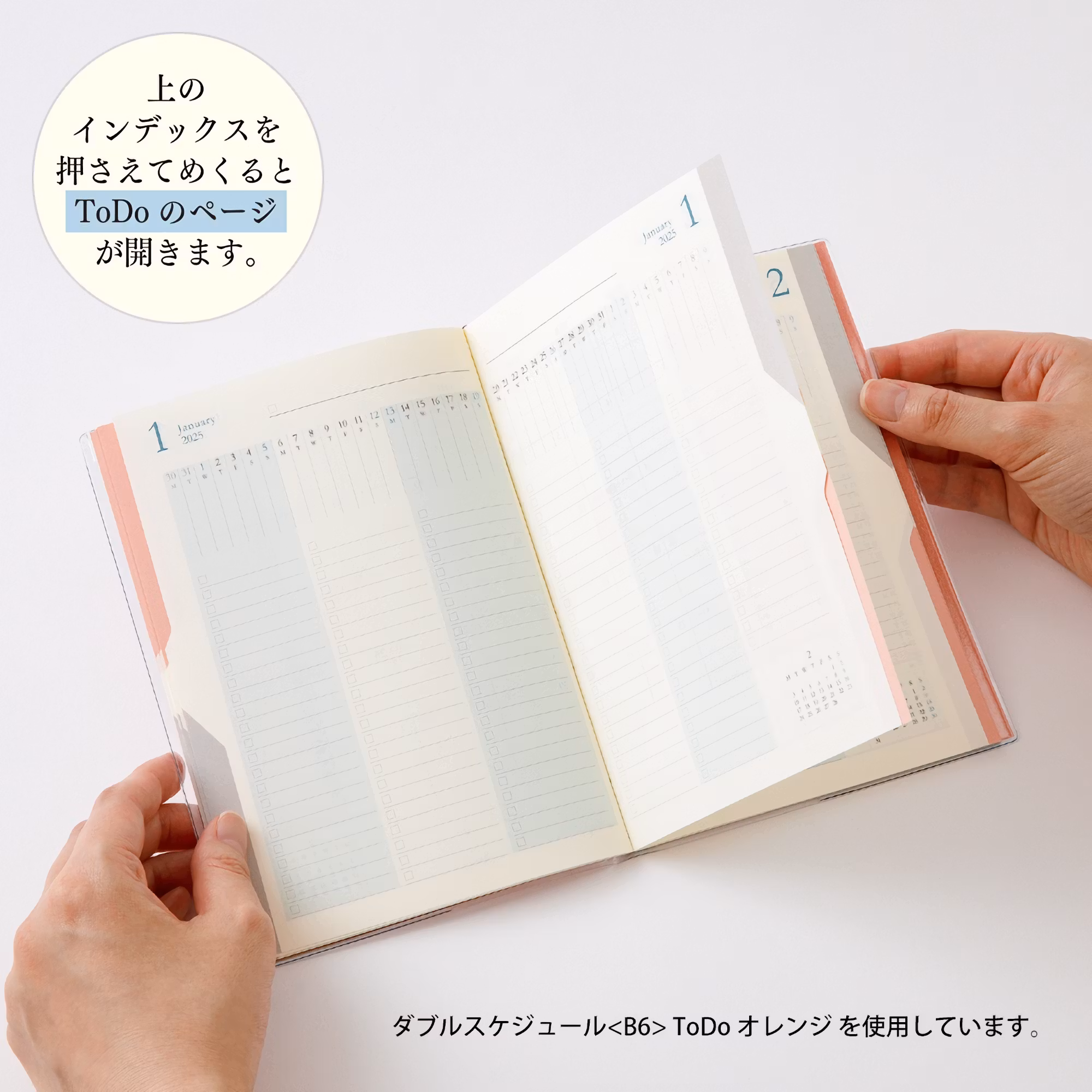 Med Midoris Double Schedule To Do växlar du enkelt mellan månatliga kalendersidor och att-göra-listor. Att-göra-sidorna har en numrerad kalender i listform överst på sidan för att notera schemalagda händelser. Under varje vecka finns det platser att skriva upp till 23 veckovisa att göra-punkter, med kryssrutor för att markera avklarade uppgifter.