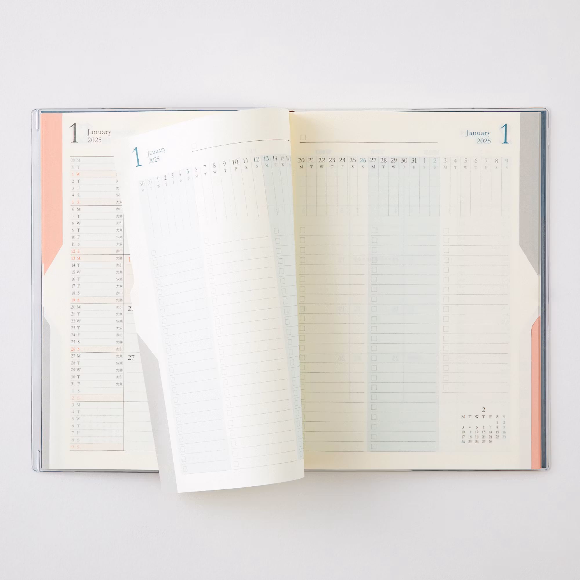 Den kompakta B6-storleen gör kalendern lätt att bära, och omslaget har en enkel blå färg som man aldrig tröttnar på. Boken innehåller Midoris ikoniska MD-papper.