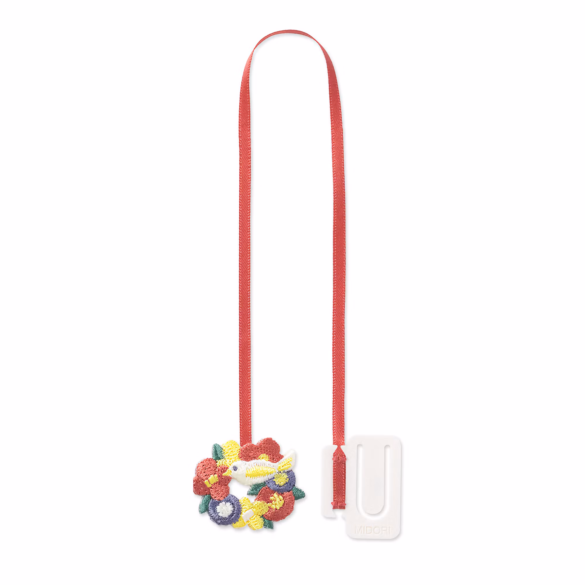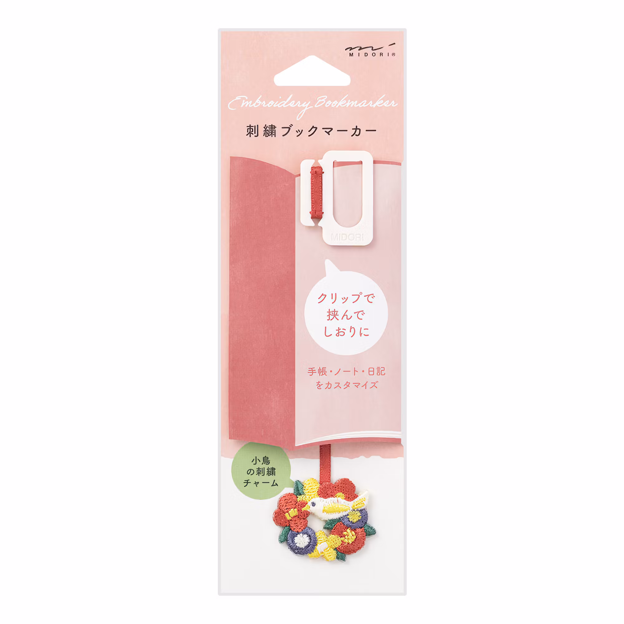 Med Midoris Embroidery Clip Bookmark kan du enkelt lägga till ett bokmärkesband till vilken bok som helst. Sätt bara klämman på första eller sista sidan och häng sedan bandet på valfritt ställe i din anteckningsbok eller dagbok. Det här bandet är utsmyckat med en fin broderad fågel på en blomsterring.