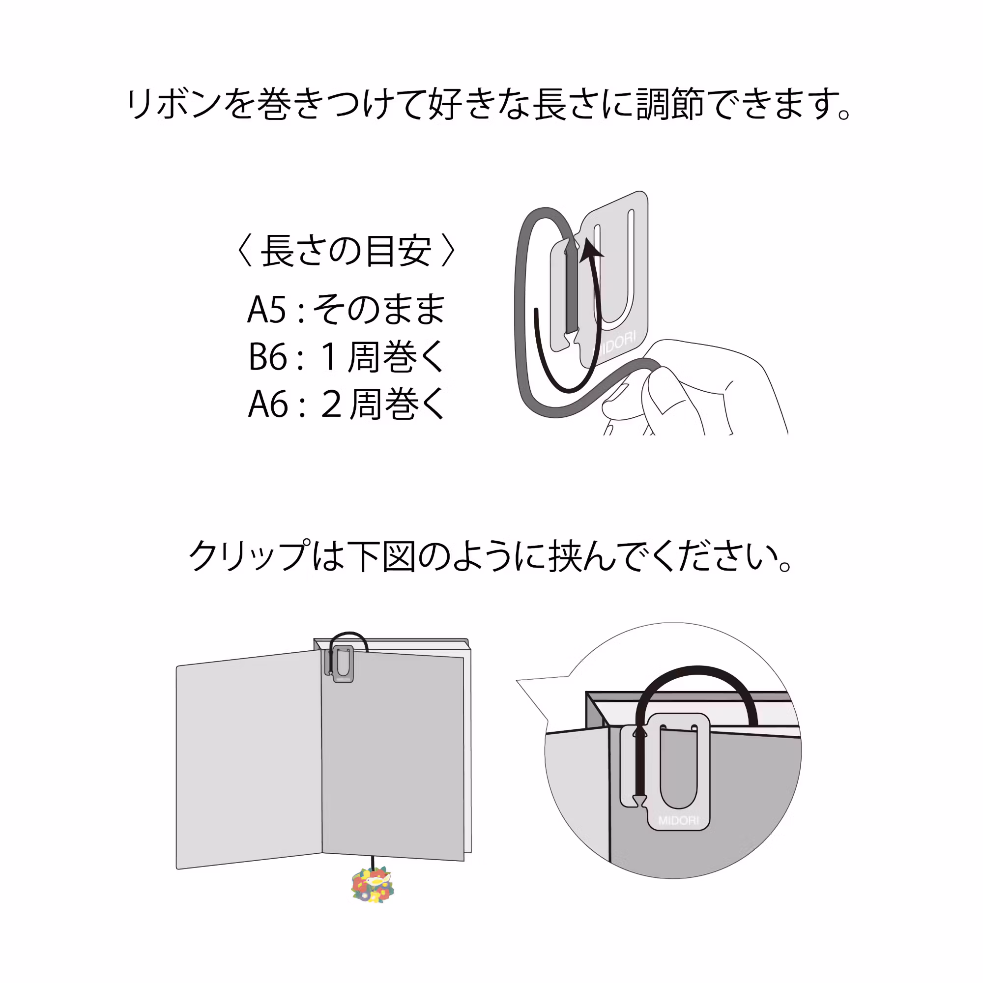 Du kan justera längden genom att linda strängen runt klippdelen. Uppskattad längd: A5: Som det är; B6: 1 varv; A6: 2 varv.