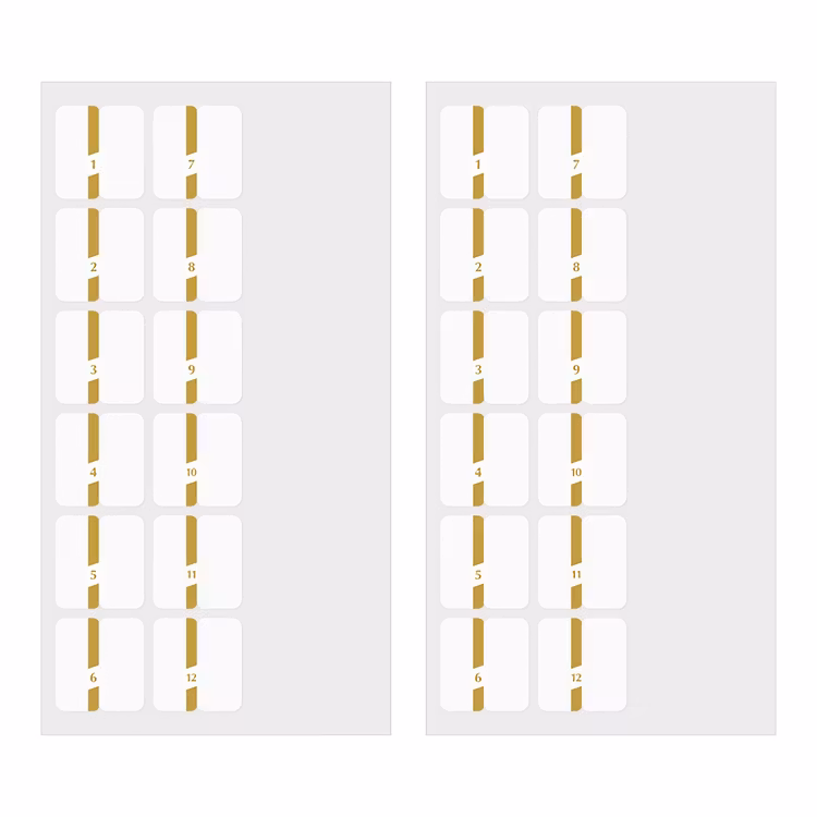 En förpackning innehåller 12 guldfärgade nummer (1-12) x 2 ark, alltså 24 indexklistermärken totalt. Finns i flera olika utföranden.