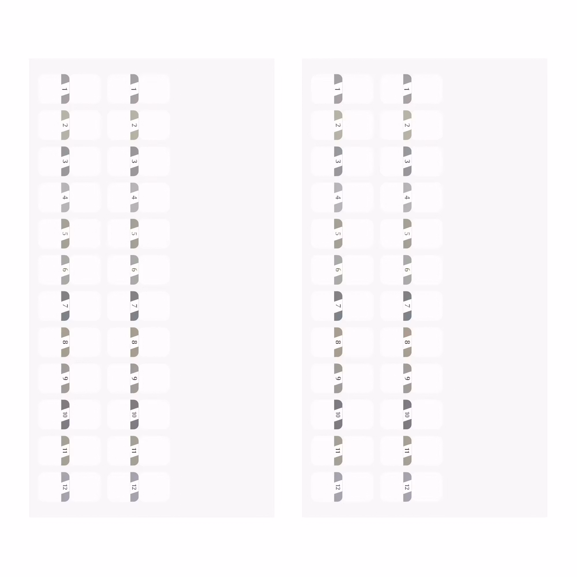 En förpackning innehåller 2 x 12 nummer i olika grå nyanser (1-12) x 2 ark, alltså 48 indexklistermärken totalt. Finns i flera olika utföranden.