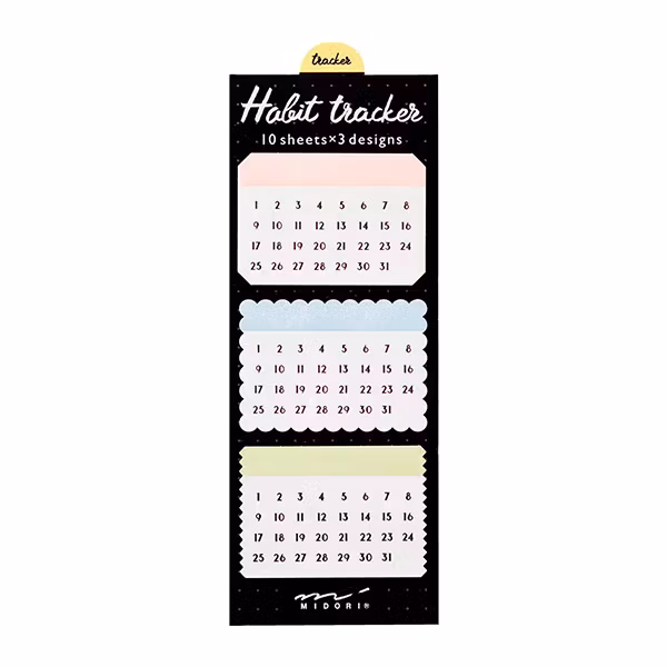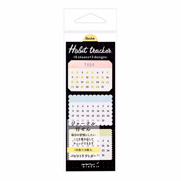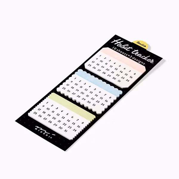 Midori är bra finurliga, och det märks särskilt när det kommer till deras smarta klistermärken. Med Midori Sticky Note Habit Tracker håller du enkelt reda på dina vanor. Genom att skriva exempelvis Yoga, Löpning, eller, varför inte – och det här förespråkar vi – Kawabatastudier i klisterlappens titelfält, kan du helt enkelt sedan markera dagarna för att se hur ofta du utför detta. Klistermärkenas baksida är täckta till ungefär 70 % med klister, vilket gör att de inte riskerar att falla av – samtidigt som de lätt kan avlägsnas och klistras på igen någon annanstans. Kartan innehåller tre olika utföranden med tio klistermärken per utförande – alltså totalt 30 klistermärken.