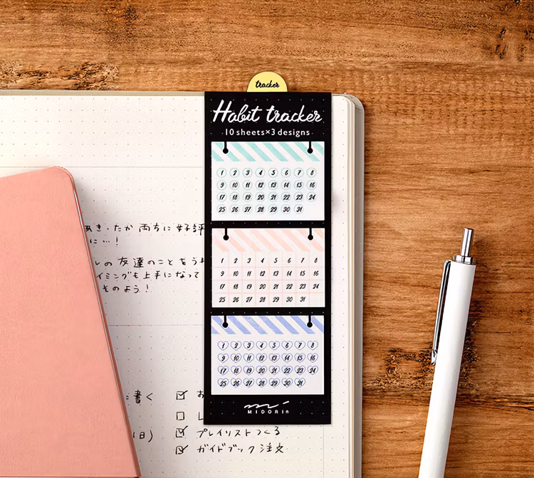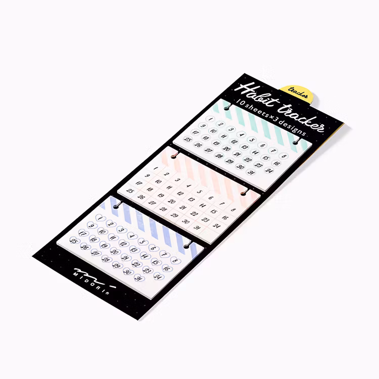 Midori är bra finurliga, och det märks särskilt när det kommer till deras smarta klistermärken. Med Midori Sticky Note Habit Tracker håller du enkelt reda på dina vanor. Genom att skriva exempelvis Yoga, Löpning, eller, varför inte – och det här förespråkar vi – Kawabatastudier i klisterlappens titelfält, kan du helt enkelt sedan markera dagarna för att se hur ofta du utför detta. Klistermärkenas baksida är täckta till ungefär 70 % med klister, vilket gör att de inte riskerar att falla av – samtidigt som de lätt kan avlägsnas och klistras på igen någon annanstans. Kartan innehåller tre olika utföranden med tio klistermärken per utförande – alltså totalt 30 klistermärken.