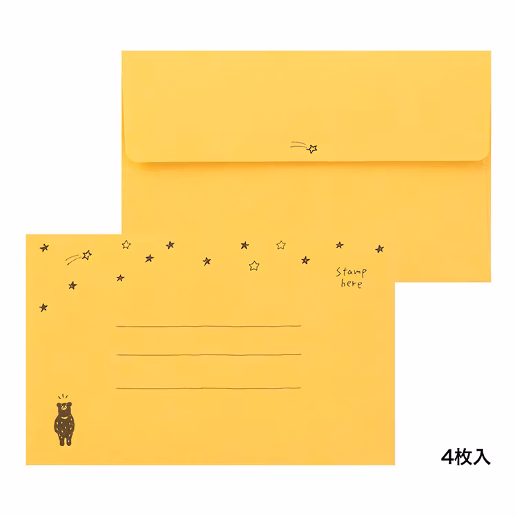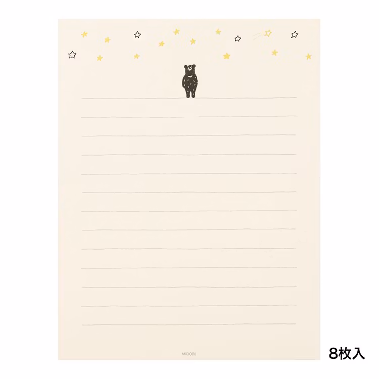 Att få ett brev är något alldeles speciellt, särskilt när både pappret och kuvertet kommer från Midori. Det här settet är illustrerad med en tankfull björn som iakttar en stjärnbeströdd himmel.
