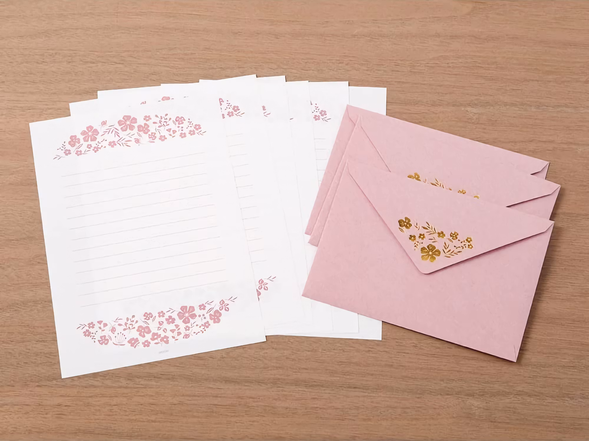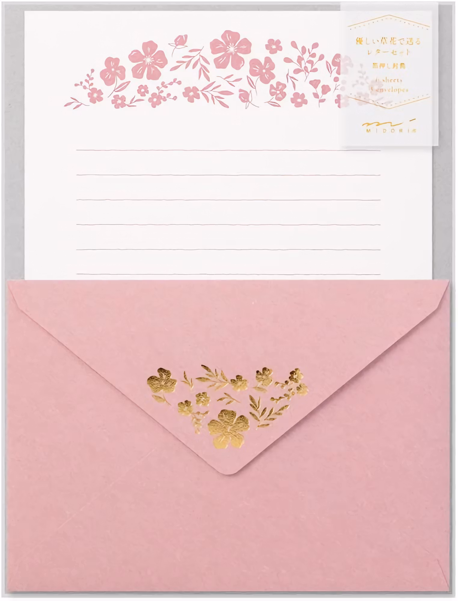 Gör någon glad – skicka ett bedårande brev! Det här brevsetet från Midori innehåller 6 linjerade brevpapper prydda med blommor högst upp, samt 3 kuvert med vackert guldfolietryck.