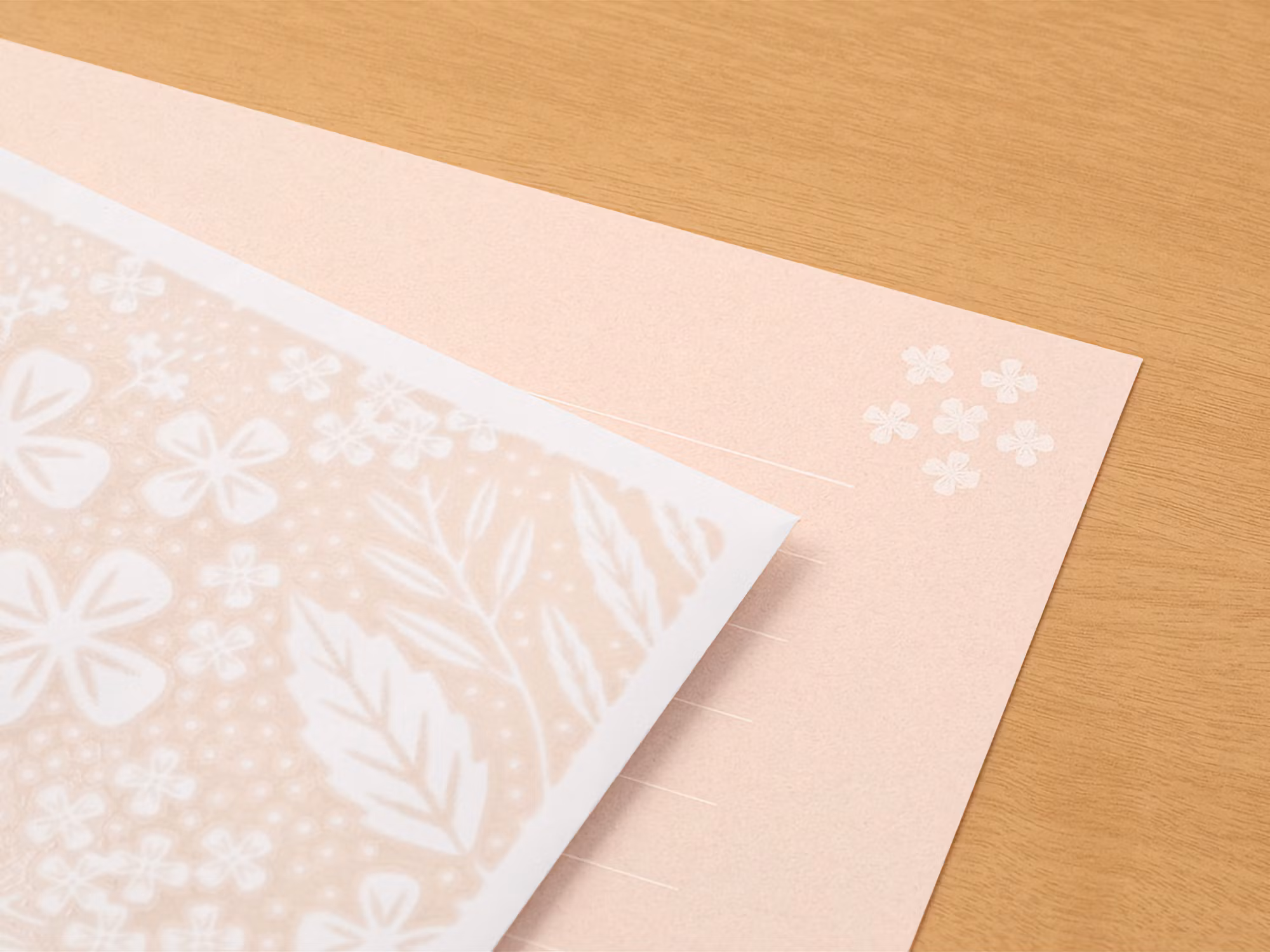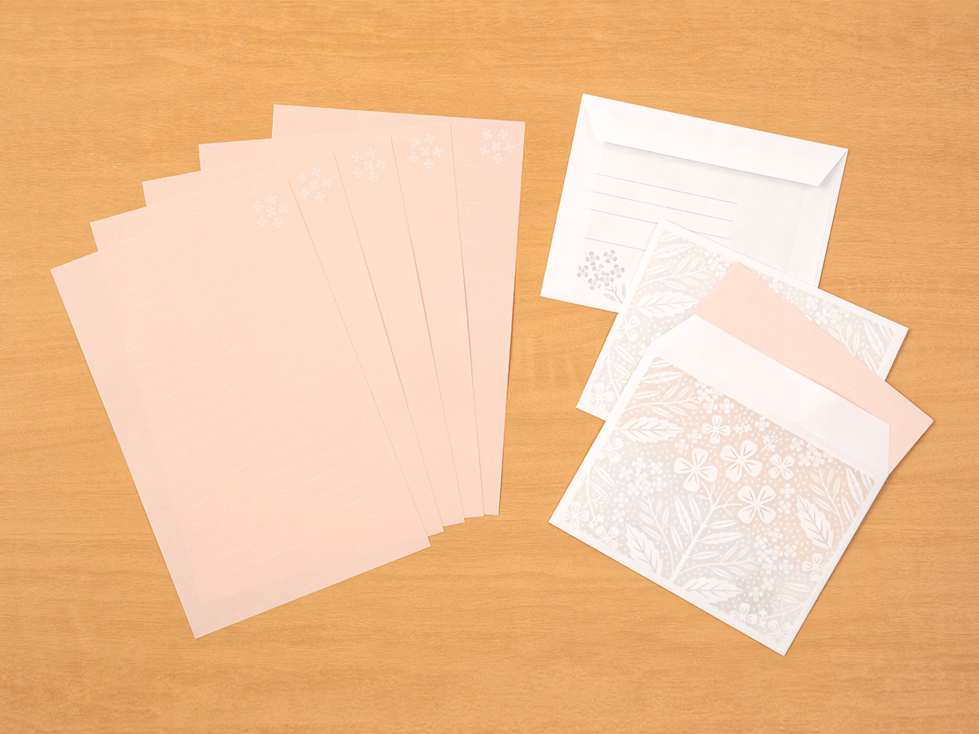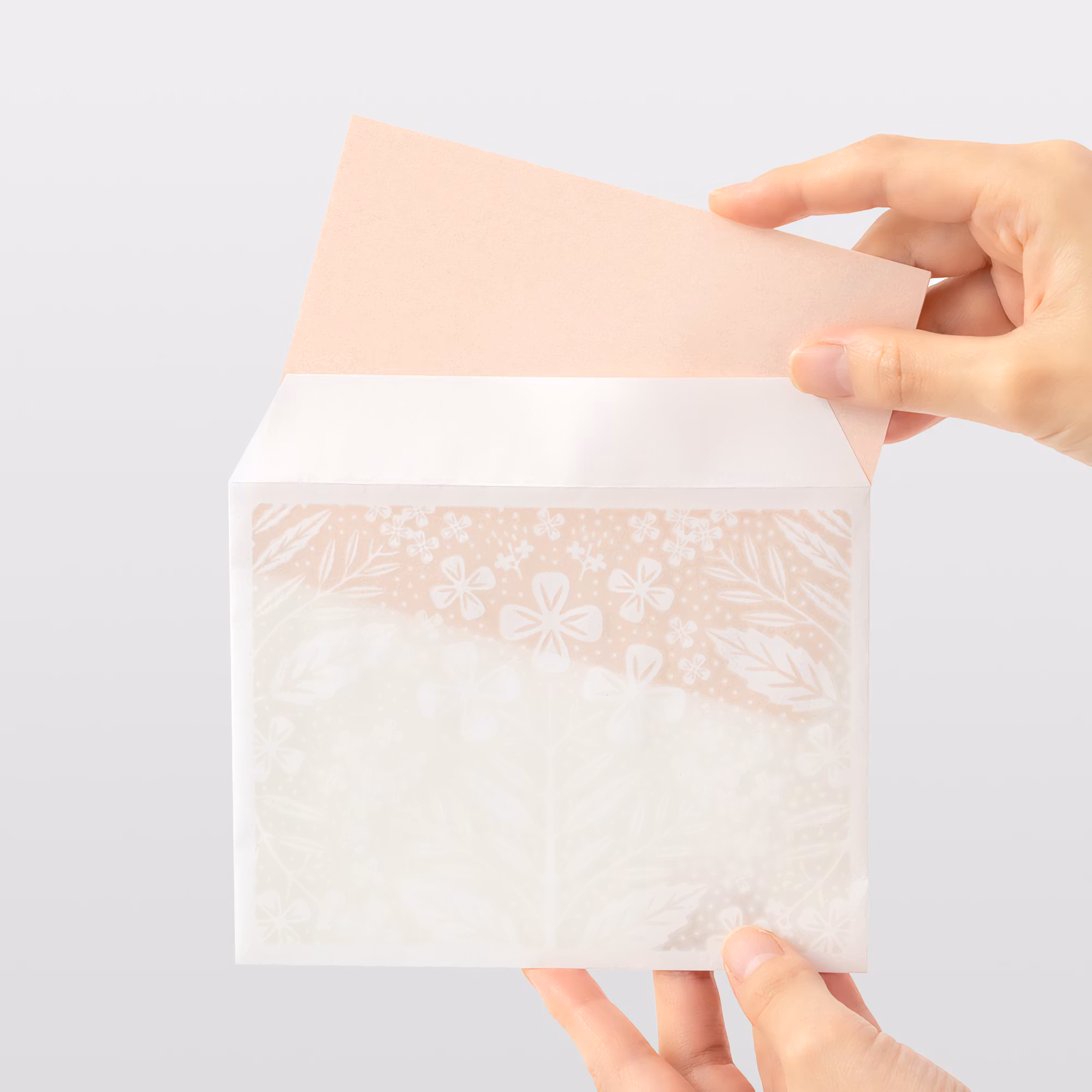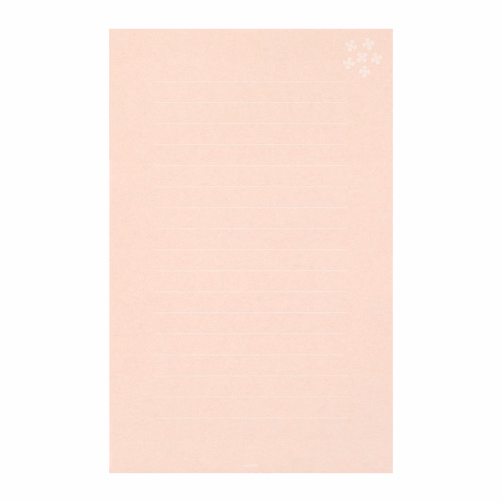 Gör någon glad – skicka ett bedårande brev! Det här brevsetet från Midori innehåller 6 rosa linjerade brevpapper prydda med blommor högst upp, samt 3 kuvert med vackert genomskinligt mönster som framträder extra tydligt när du lägger i det färgade pappret.