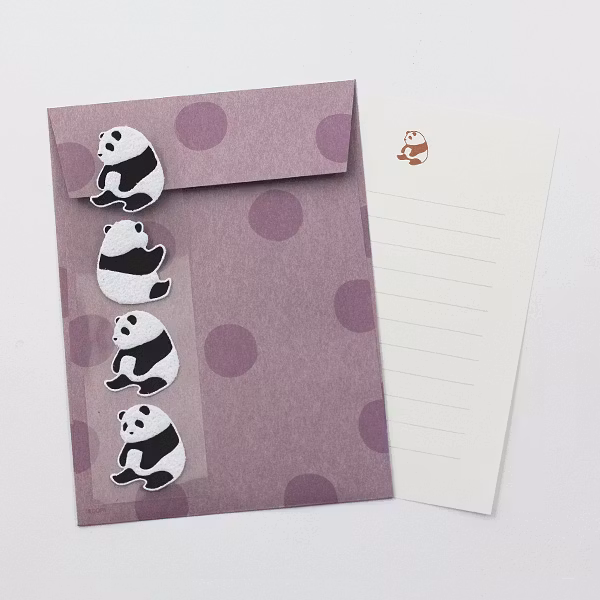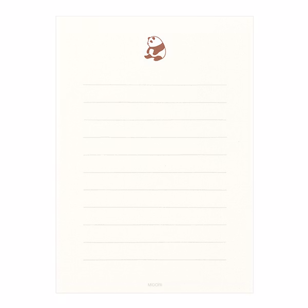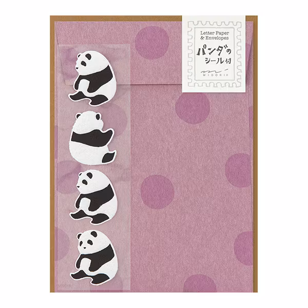 Gör någon glad – skicka ett bedårande brev! Det här brevsetet från Midori innehåller 12 linjerade brevpapper prydda med en panda högst upp, 4 kuvert, samt 4 luddiga pandaklistermärken att försluta kuverten med.