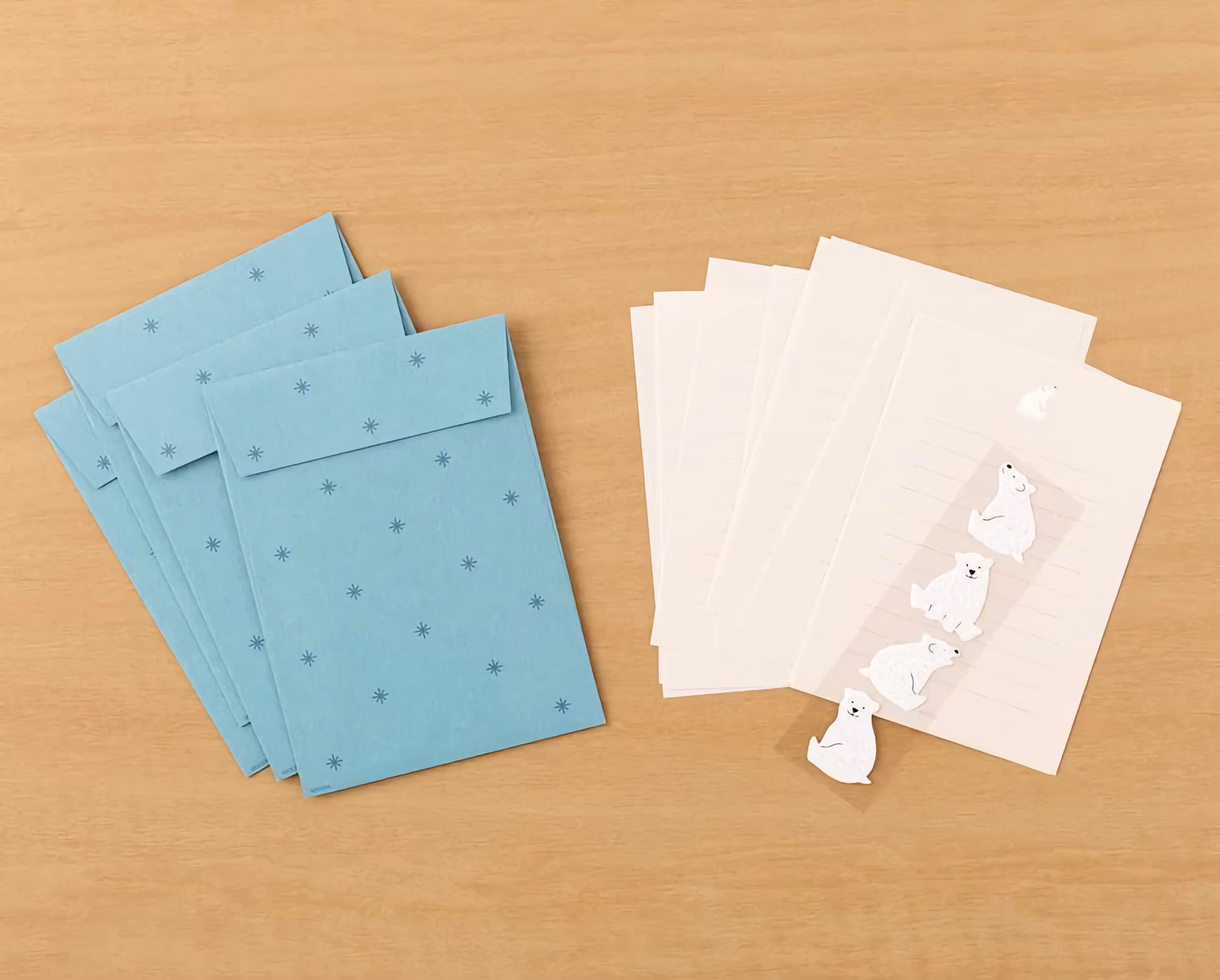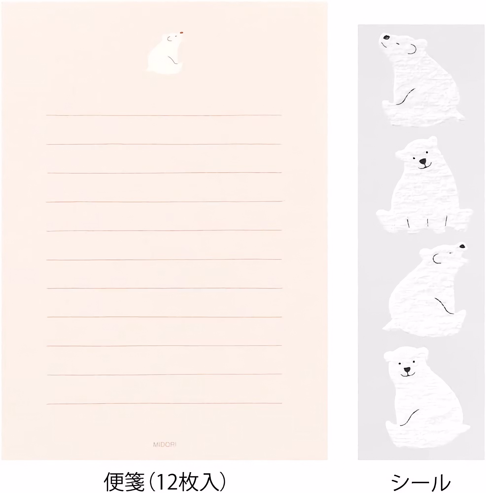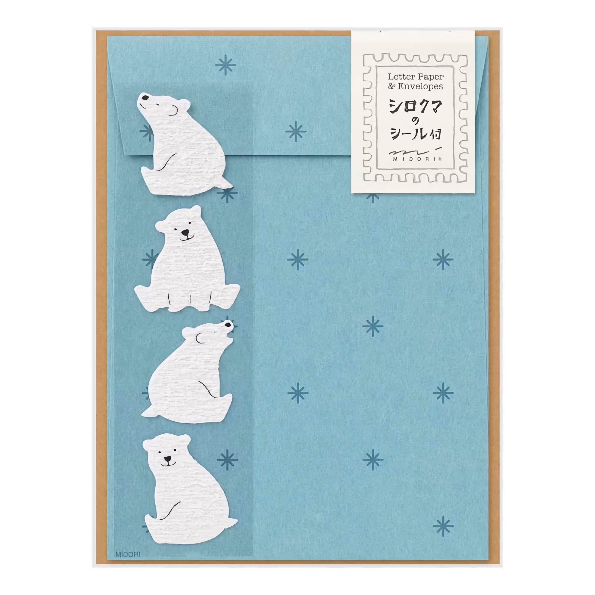 Gör någon glad – skicka ett bedårande brev! Det här brevsetet från Midori innehåller 12 linjerade brevpapper prydda med en isbjörn högst upp, 4 kuvert, samt 4 luddiga isbjörnsklistermärken att försluta kuverten med.